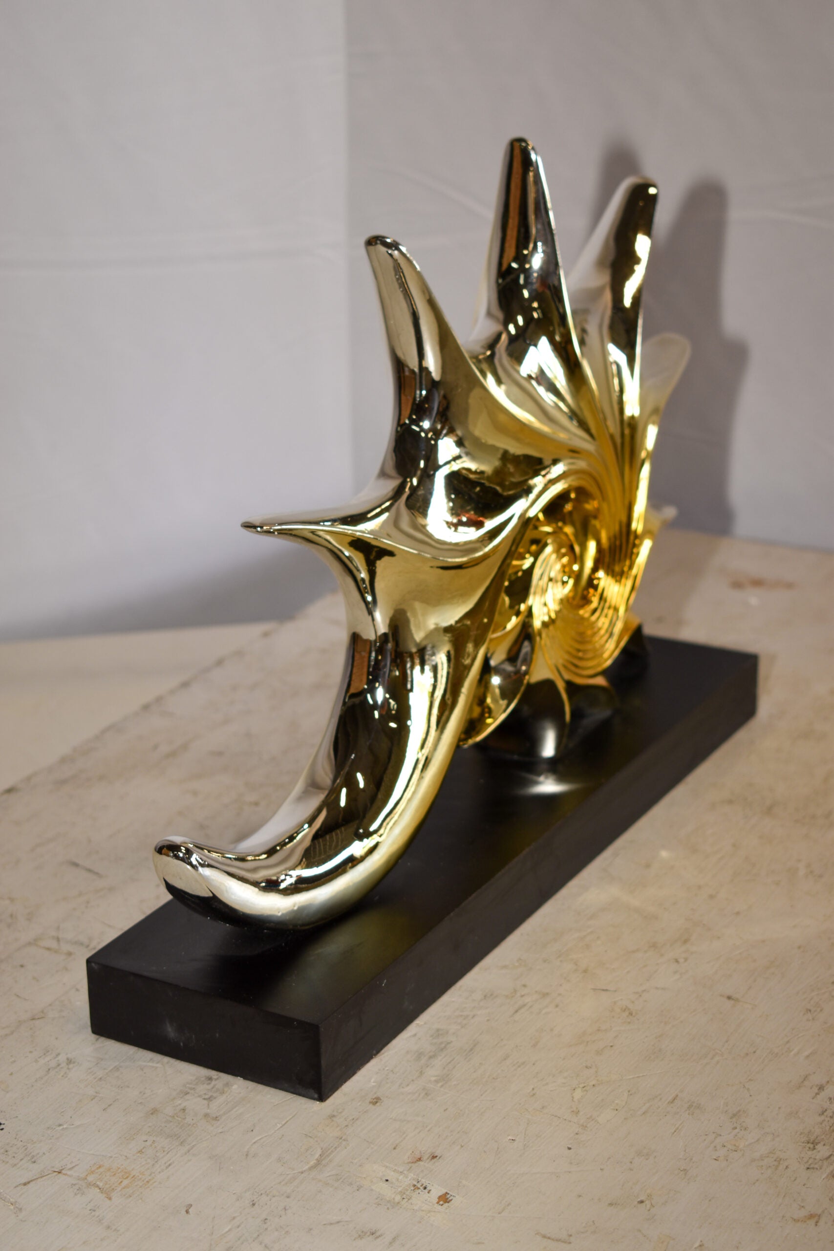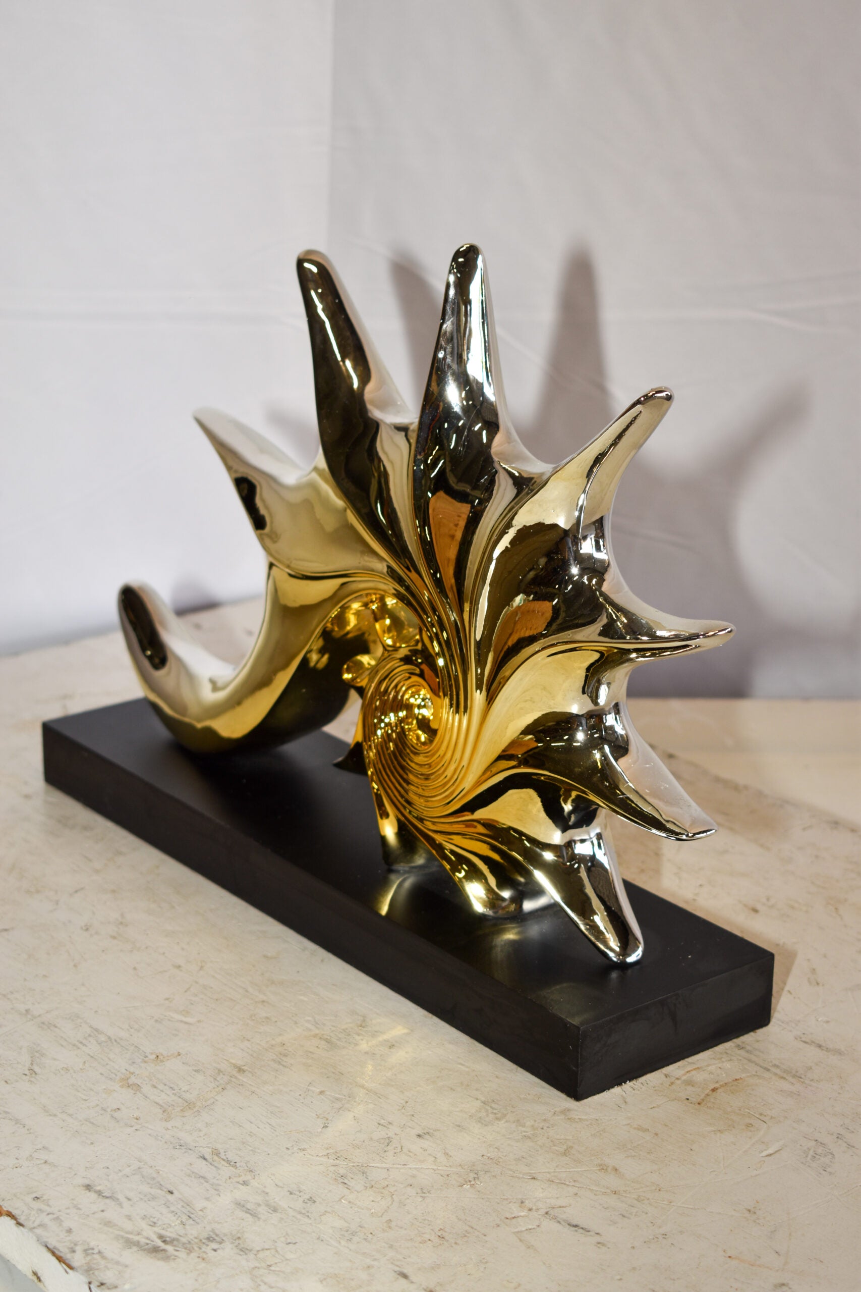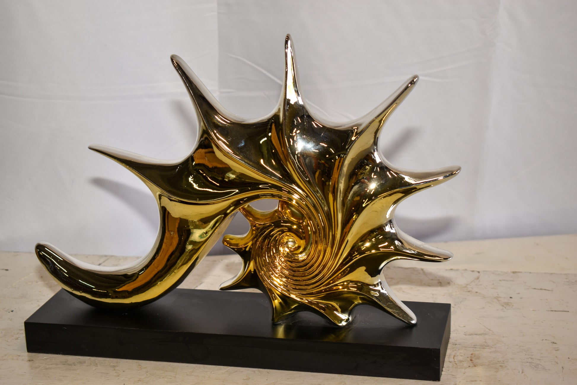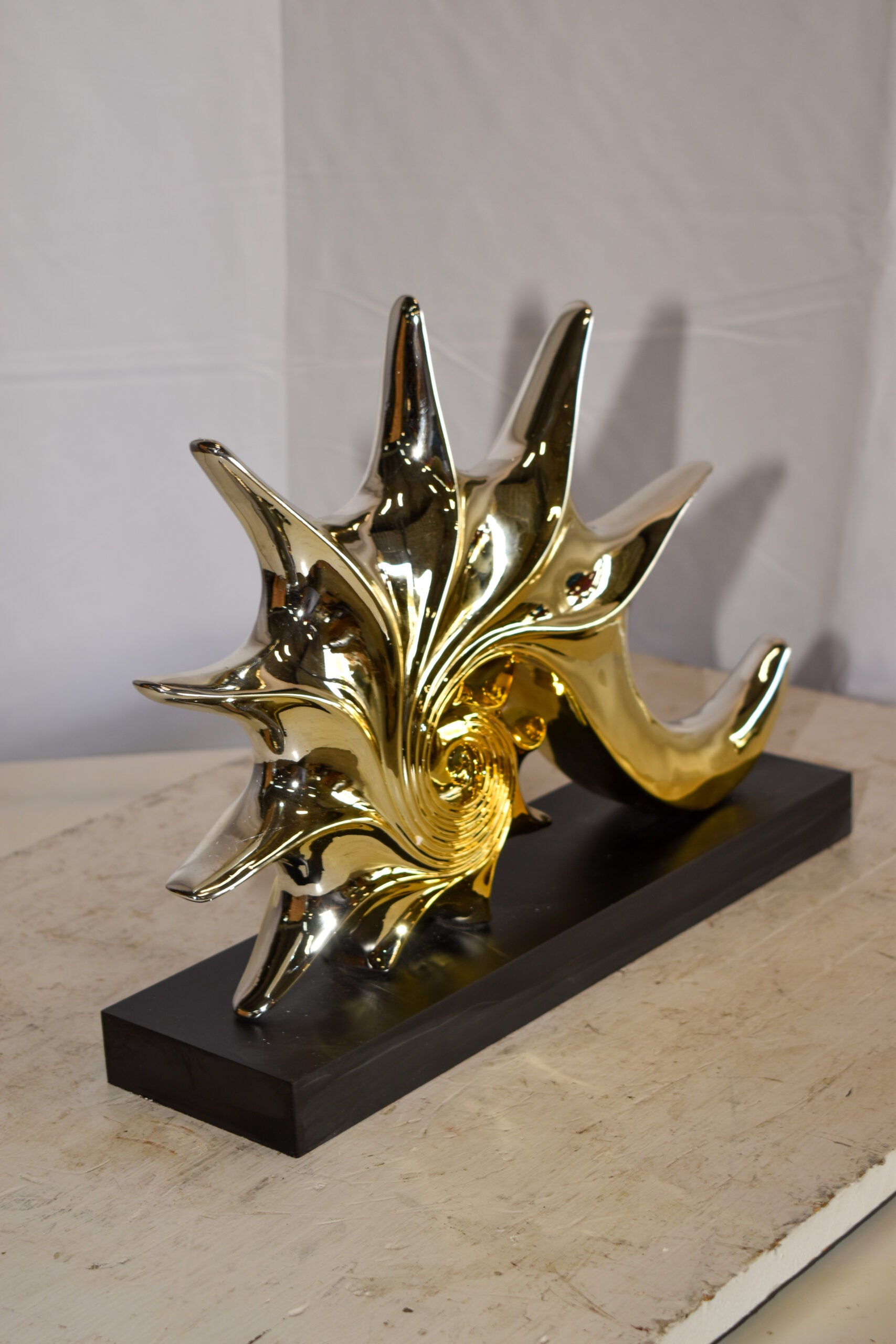 This resin statue of a sea urchin is elegantly placed on a black foundation base. The modern element of its gold color and chrome design, placed on the base, makes it a fun yet elegantly beautiful addition to any shelf, space, or office. Size: 12"L x 3"W x 10"H. Weight is: 4Lb