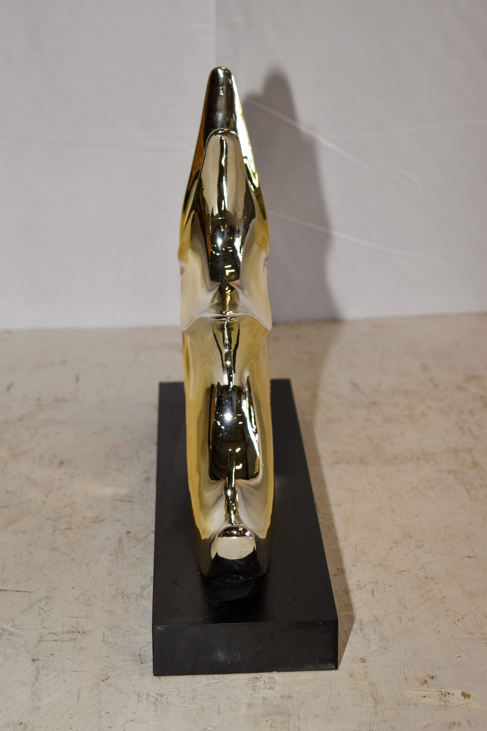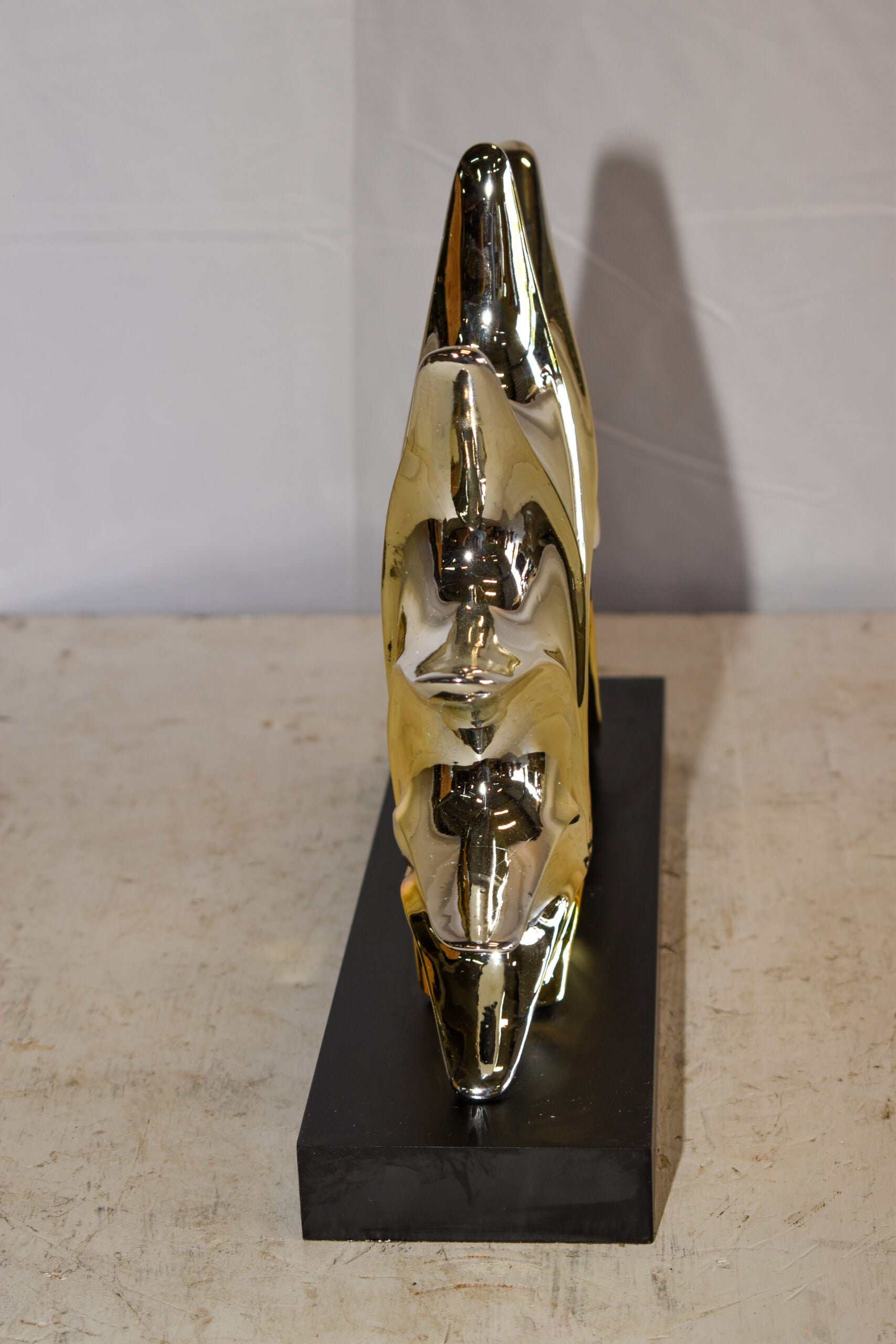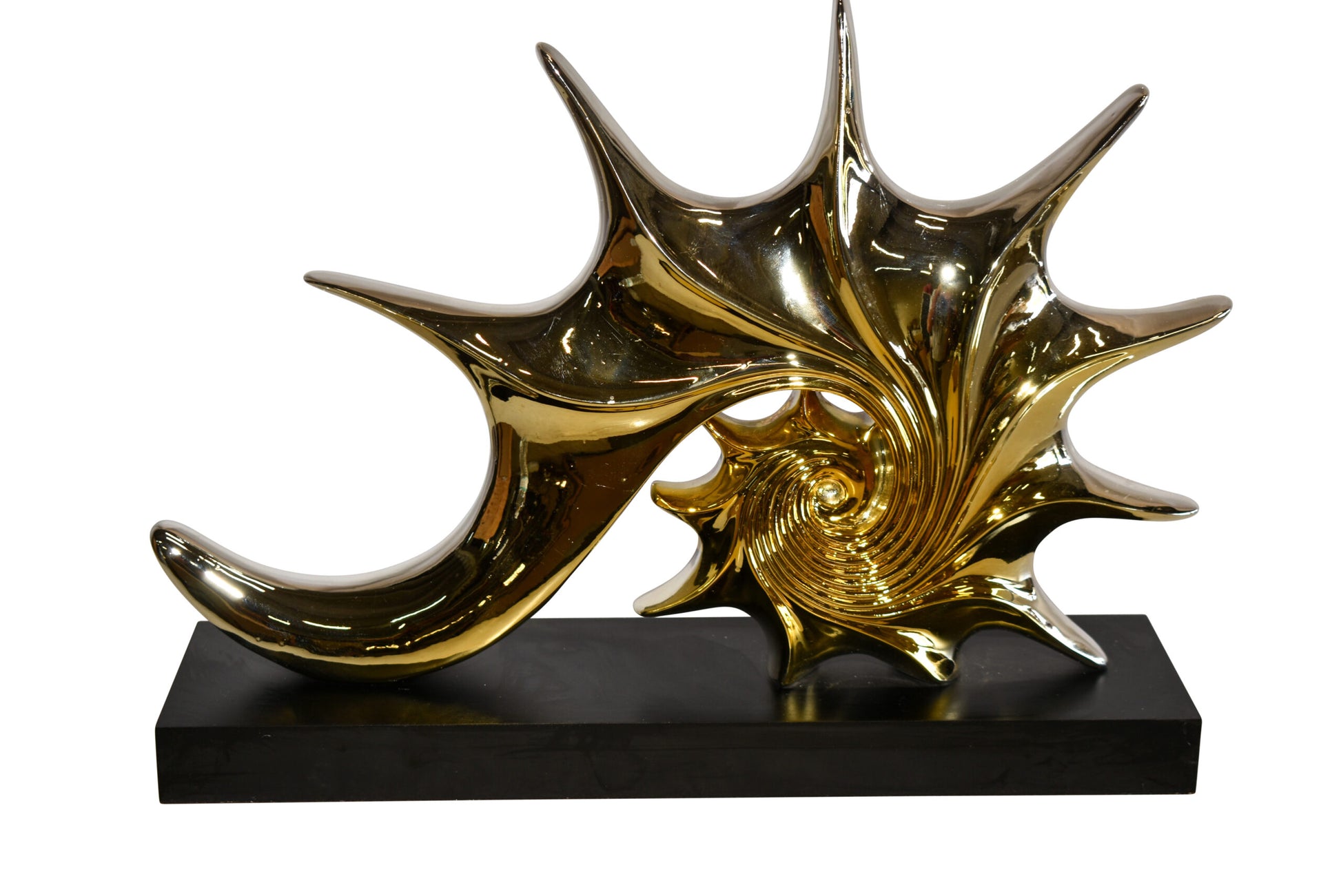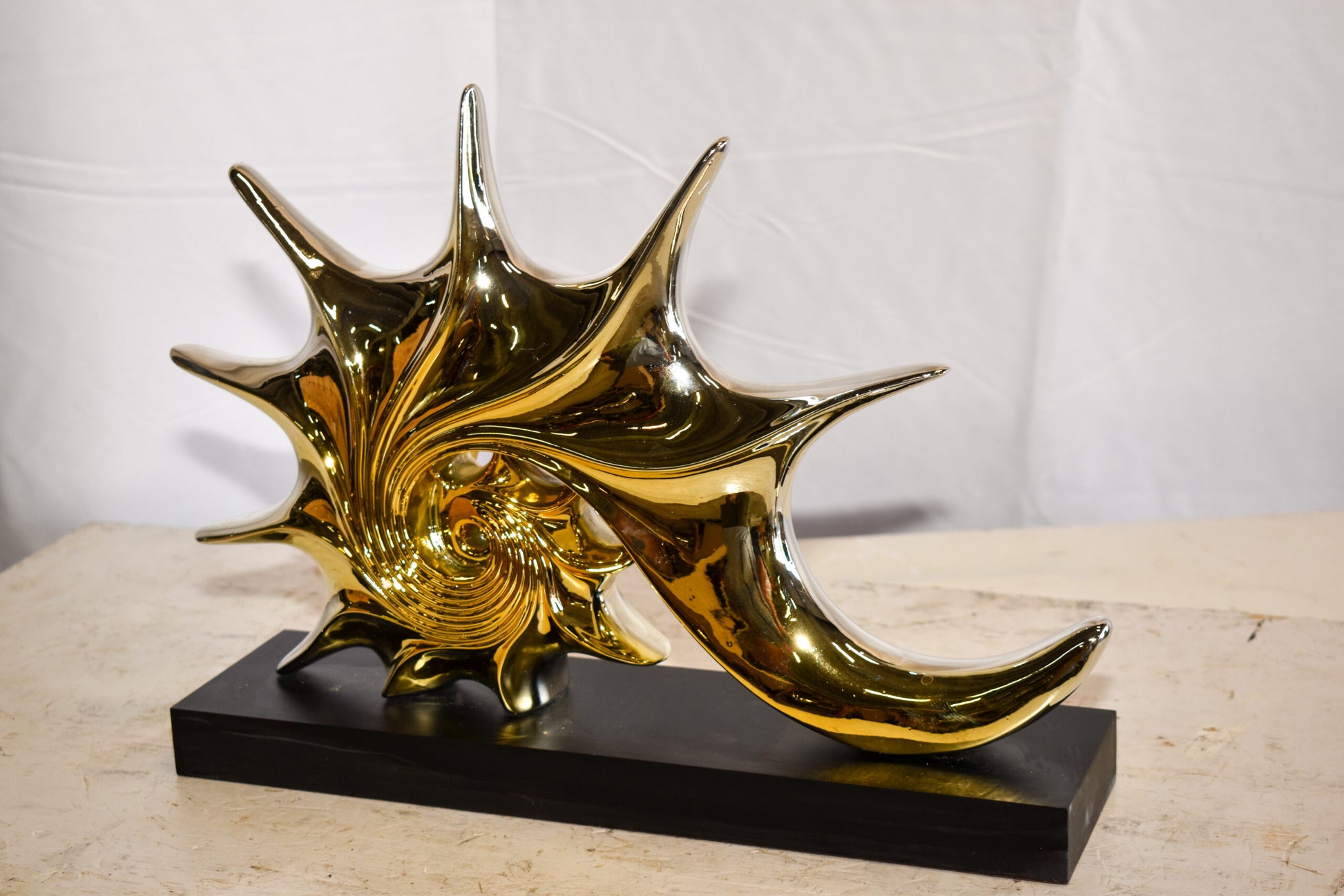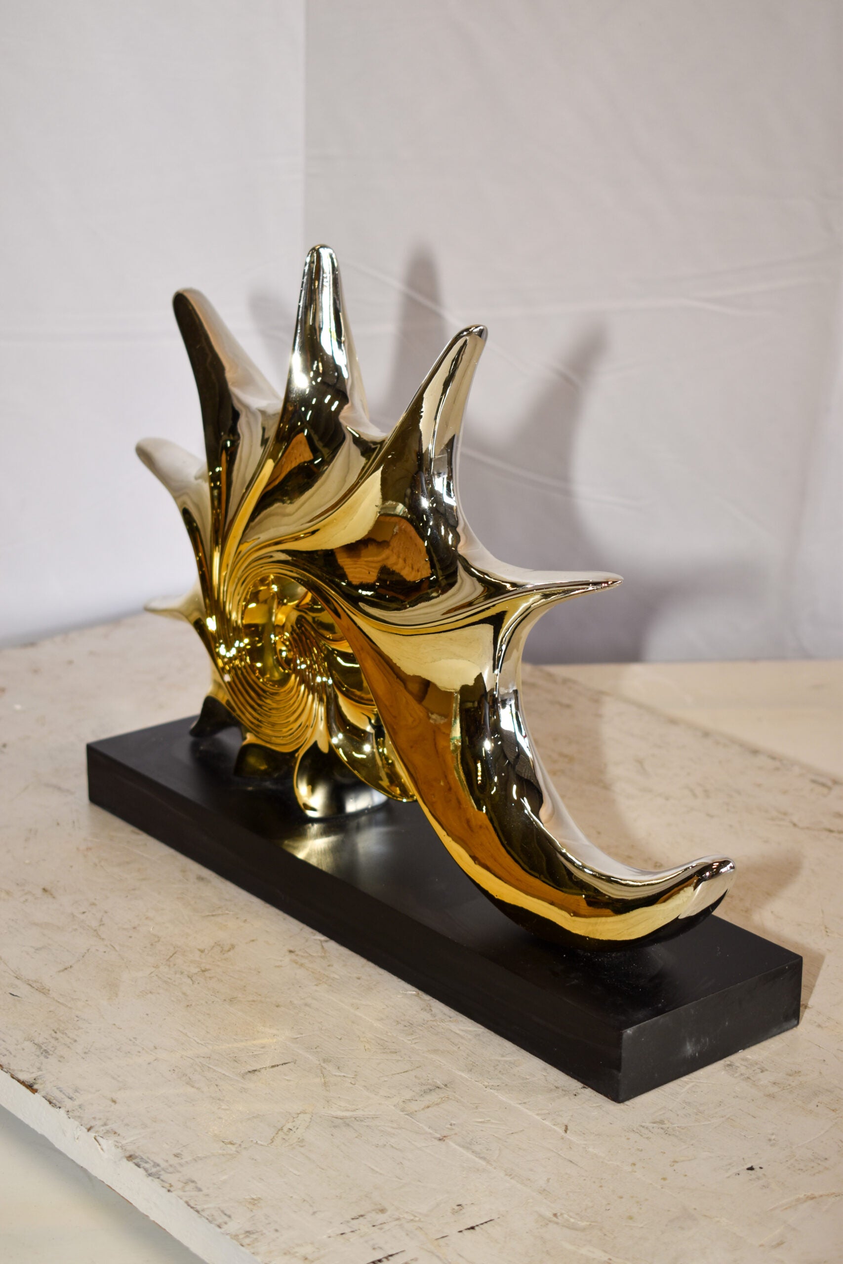This resin statue of a sea urchin is elegantly placed on a black foundation base. The modern element of its gold color and chrome design, placed on the base, makes it a fun yet elegantly beautiful addition to any shelf, space, or office. Size: 12"L x 3"W x 10"H. Weight is: 4Lb