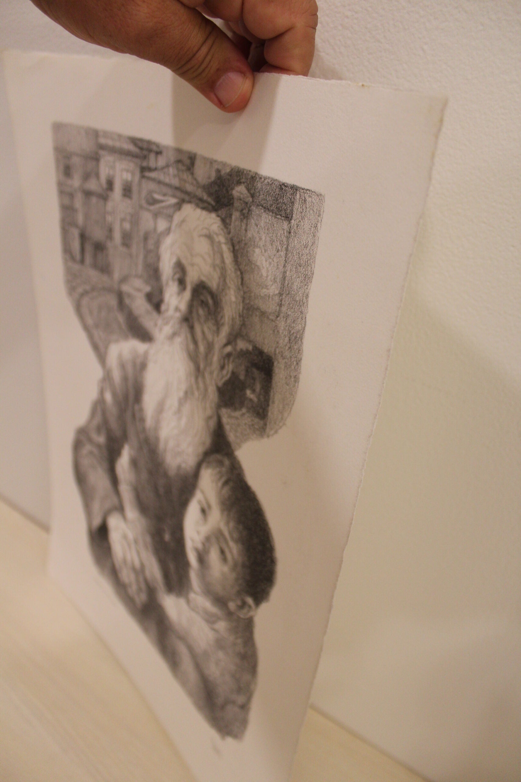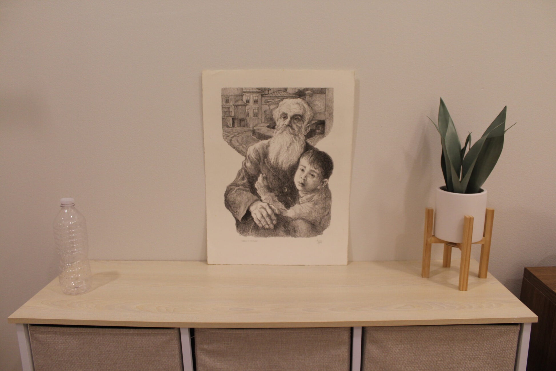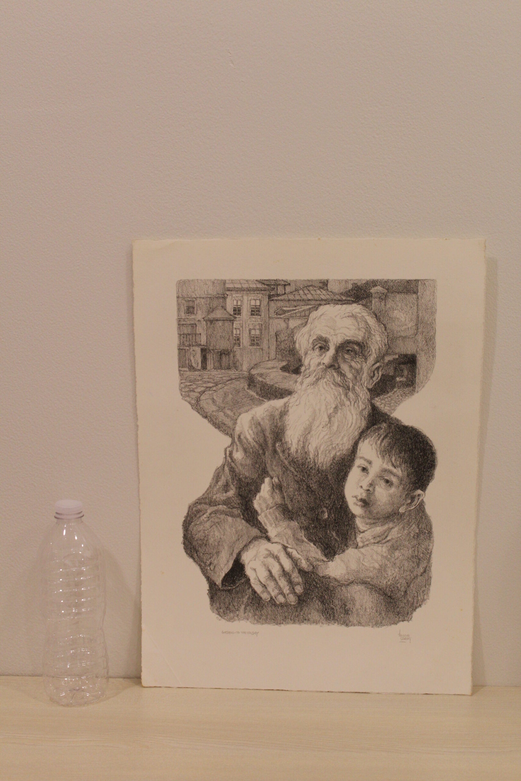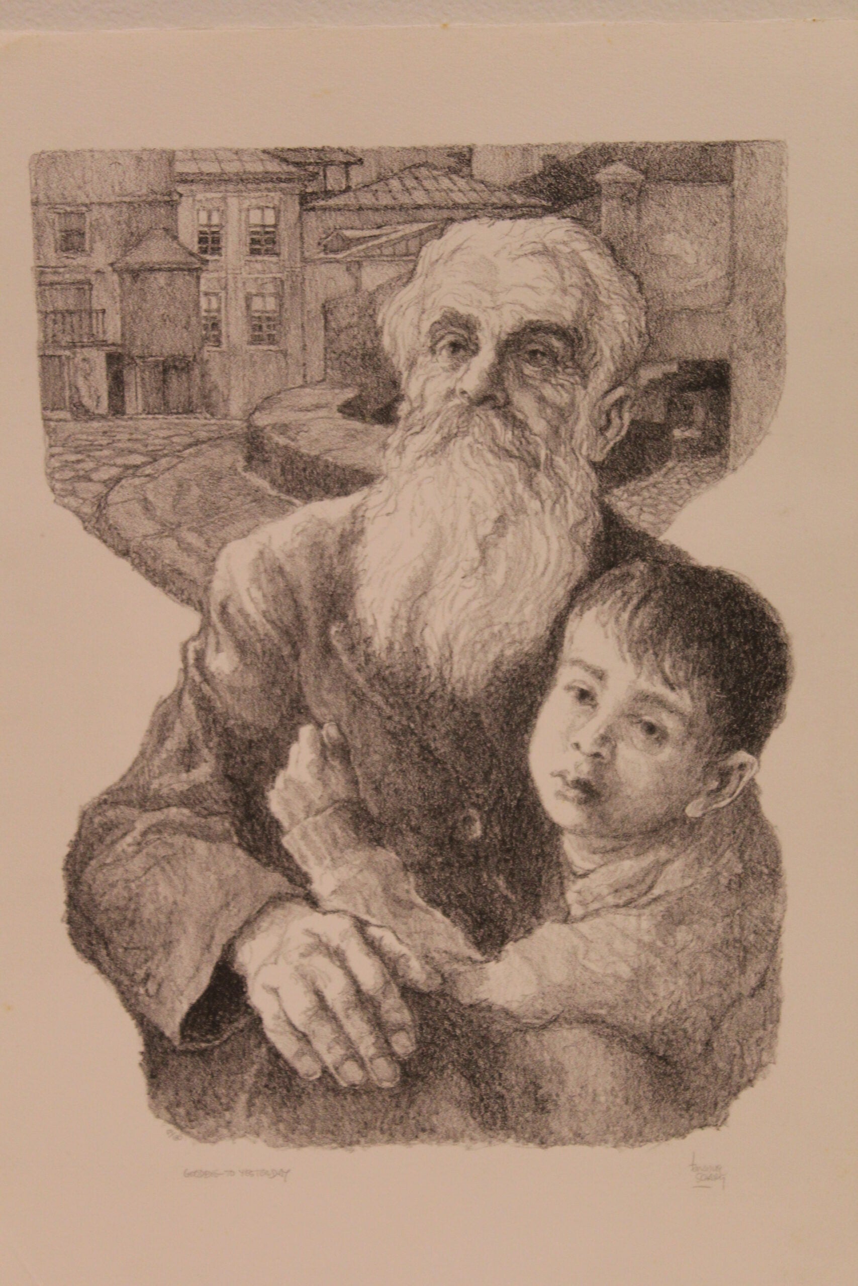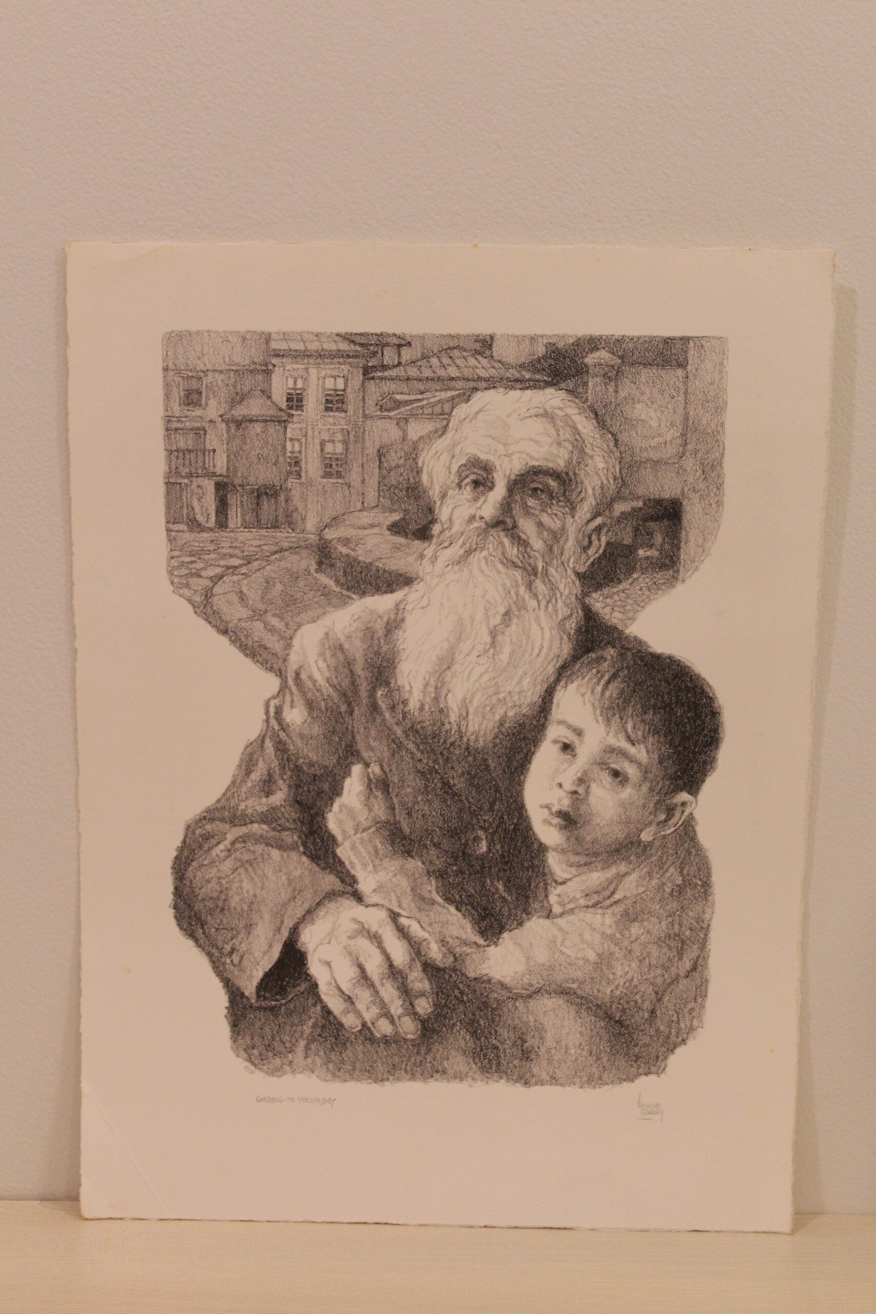 Nifao Emanuel Schary “Goodbye to Yesterday” Lithograph – Black & White Judaica Fine Art, Father & Son Embrace 11 x 14