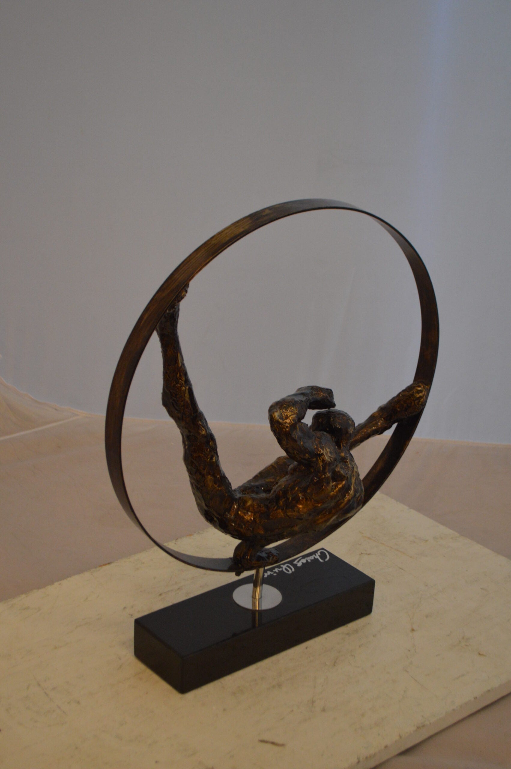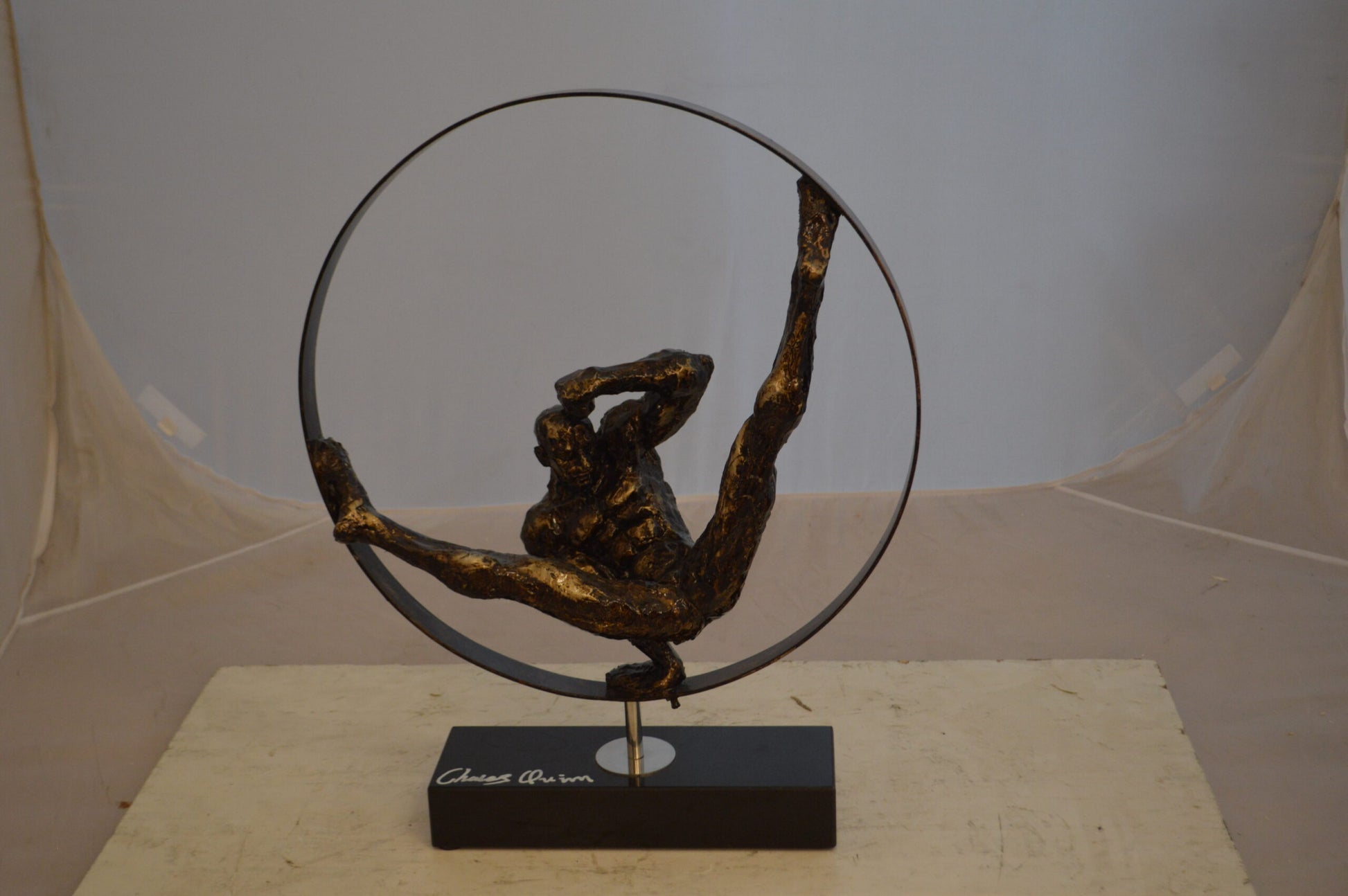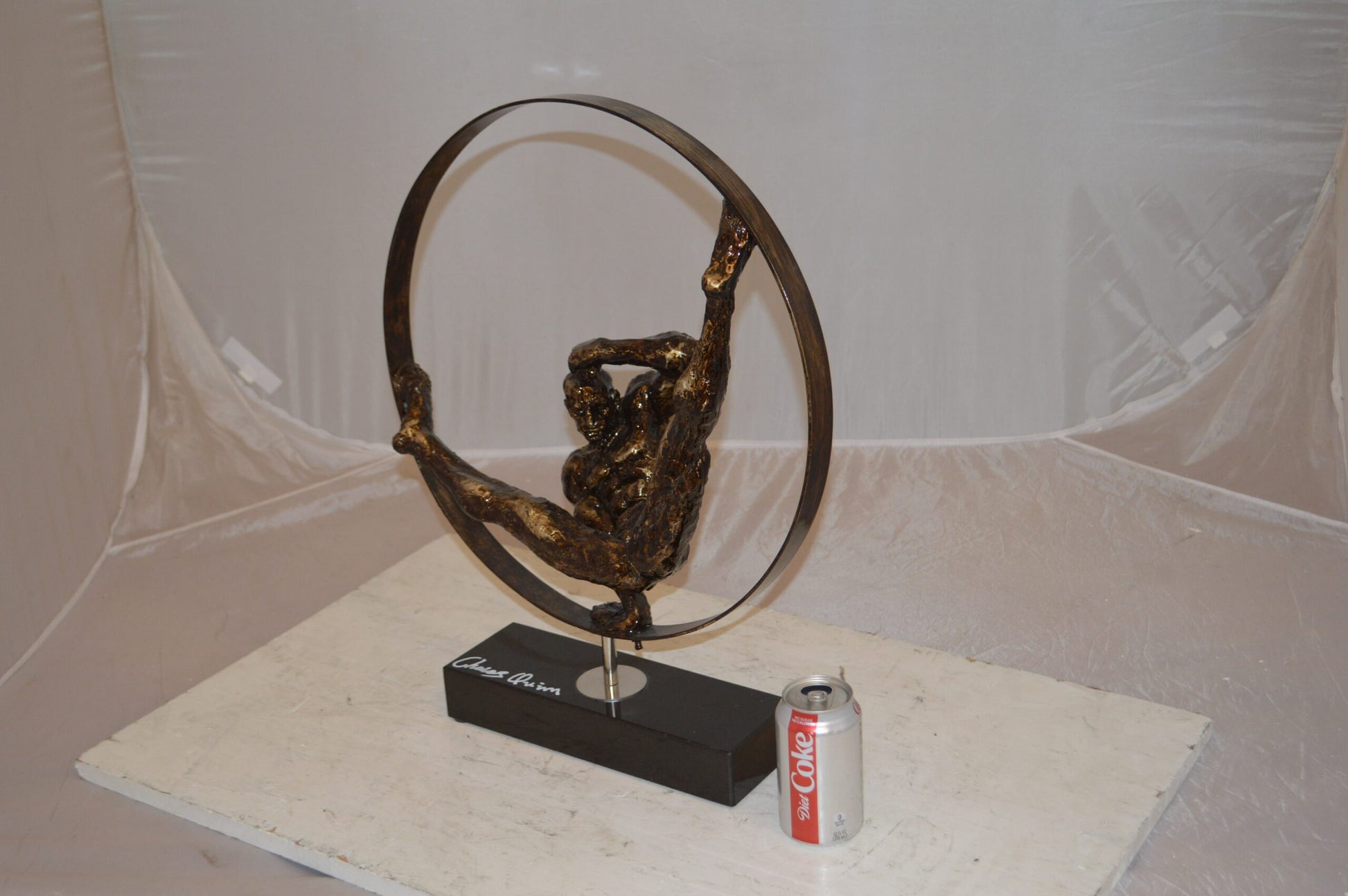 Imagine the dynamic touch you'll add to your decor with this eye-catching Gymnast Resin Tabletop sculpture. This unique sculpture features an oversized ring and gymnast conquering it, mounted on a marble base. Size: 5"L x 17"W x 22"H. Weight is: 8Lb