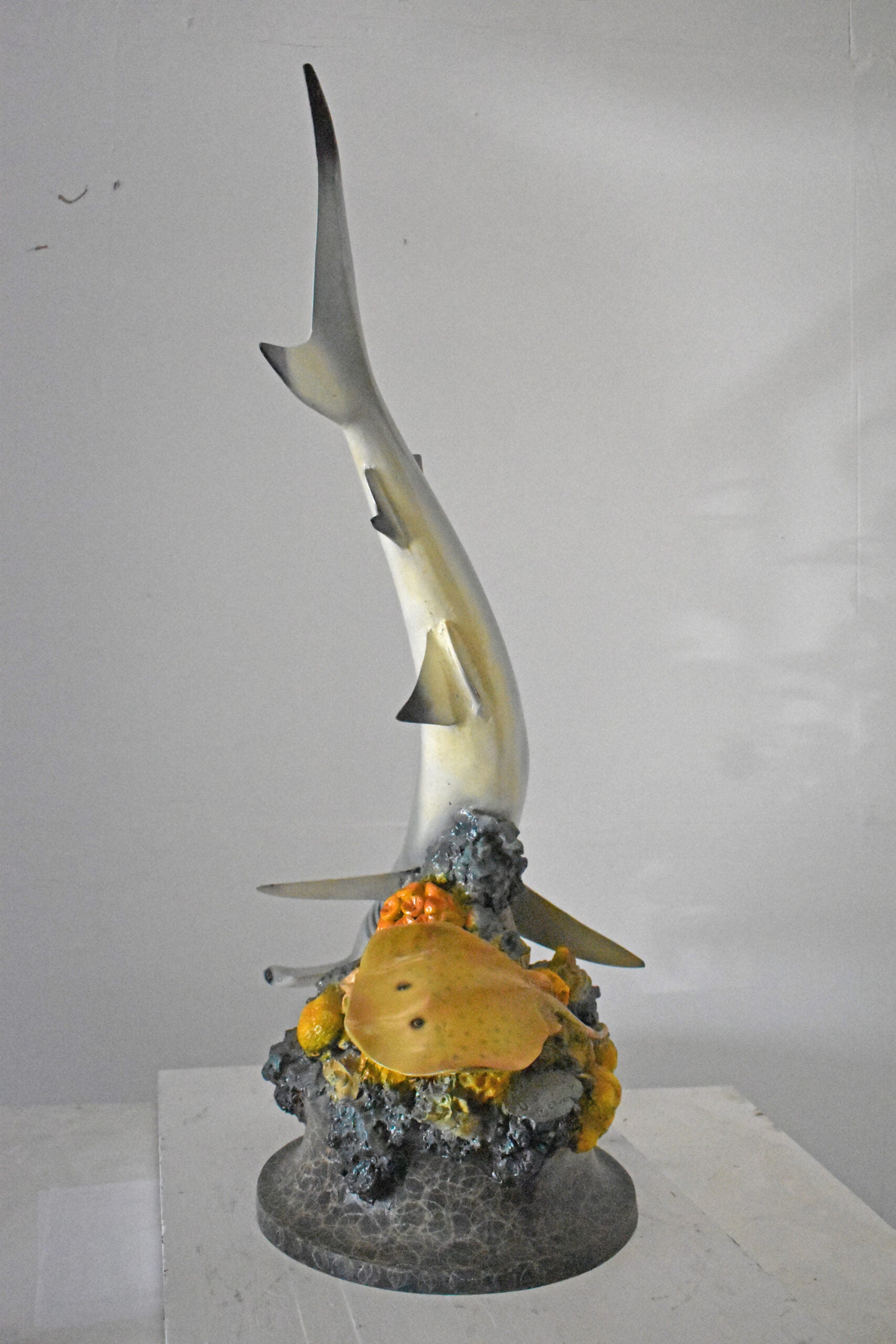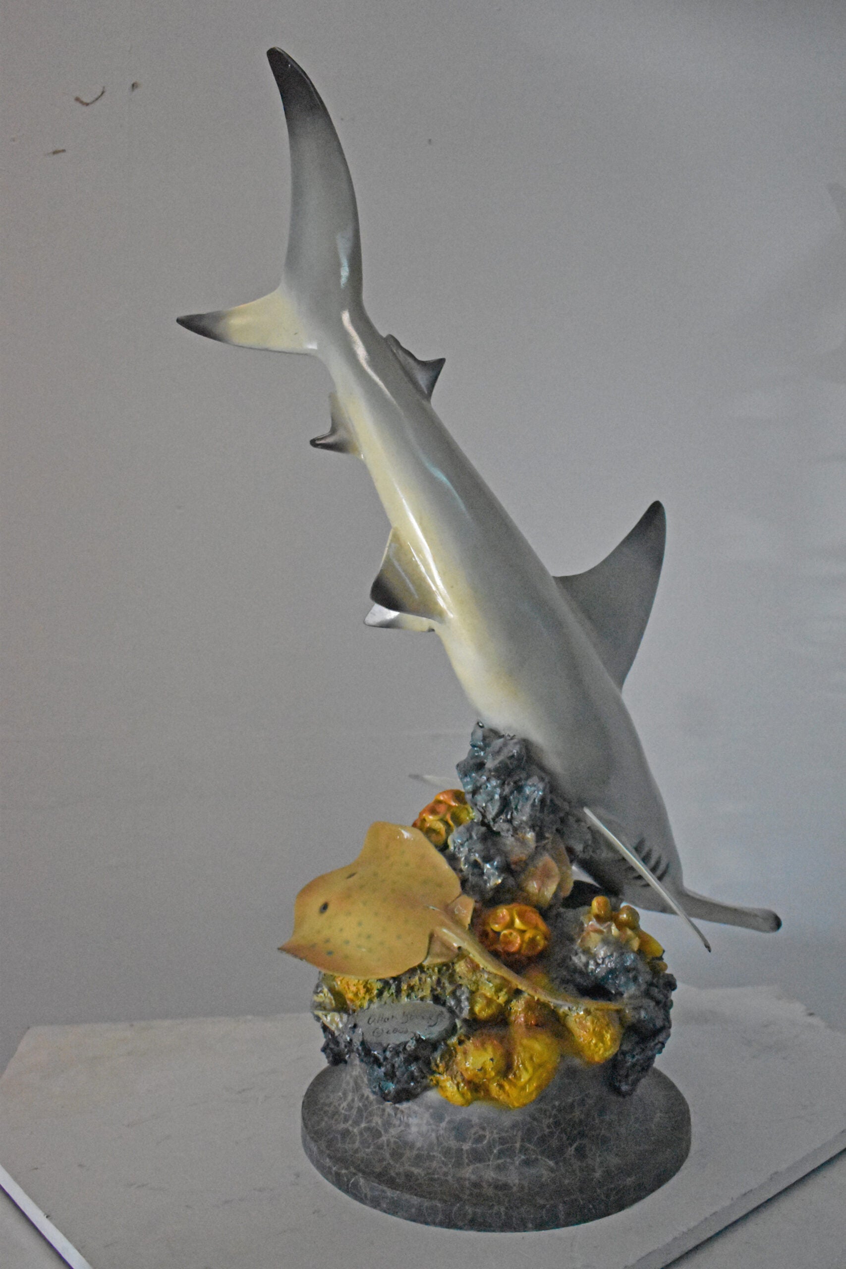 No lover of timeless sea lore and the mysteries of the deep can resist this incredibly detailed Hammer Shark and stingray swimming by the corals Bronze Statue. Handcrafted in cast brass and finished with colors deeper than the ocean itself, this breathtaking expression of the world beneath the waves beautifies any space and enhances any decor. The patina chosen for this timeless creation is a mix of hand finishing with different colors and Polychrome techniques also referred to as enameling over bronze. Great sculpture for a sport fisherman as a gift. Perfect for office or home. Size: 20"L x 18"W x 42"H. Weight is: 67Lb