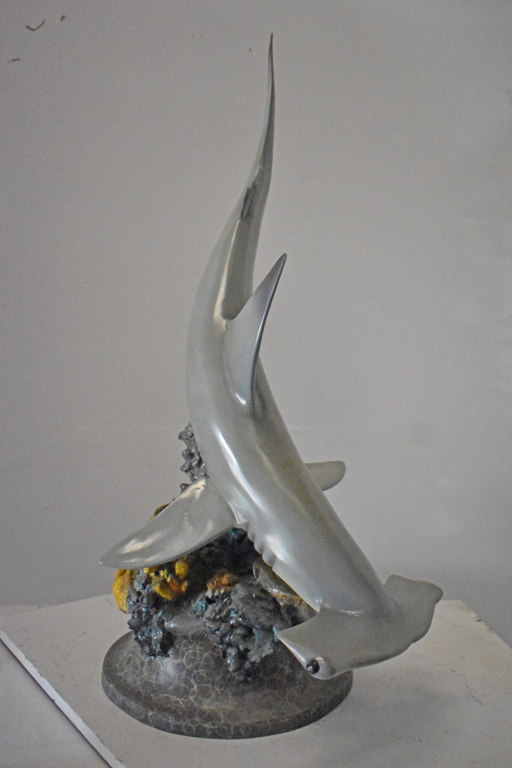 Hammer Shark with Corals Bronze Statue mounted on Marble-Size 20" x 18" x 42"H