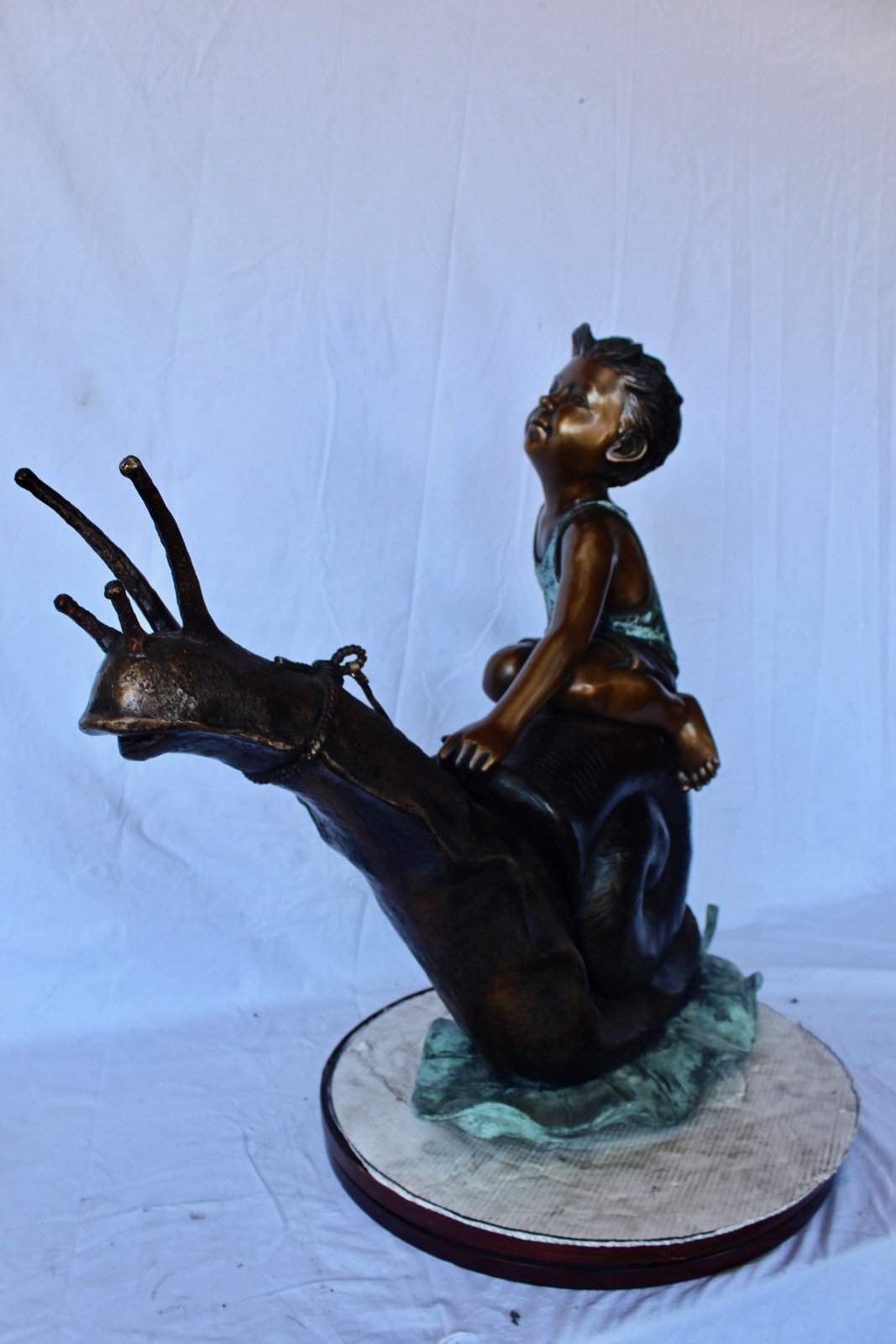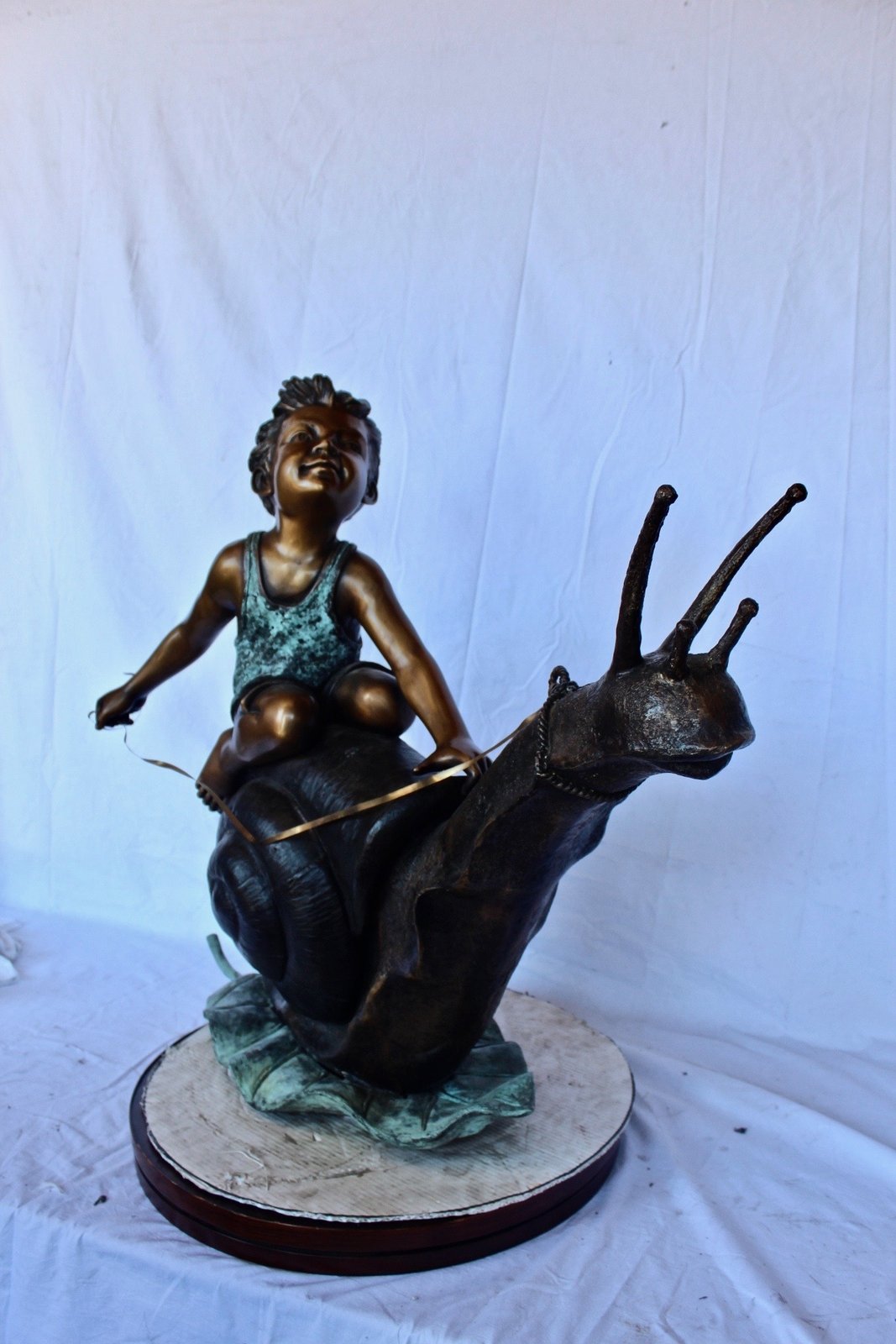 Happy boy riding a snail bronze statue fountain - Size: 42"L x 14"W x 34"H.
