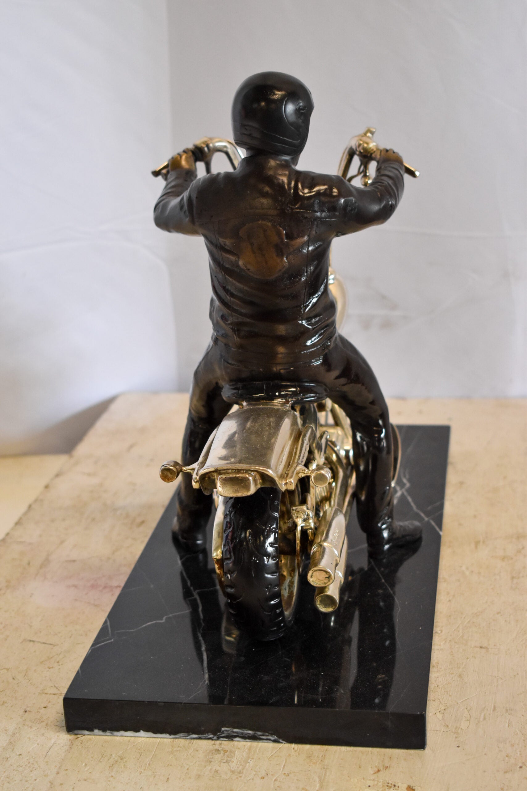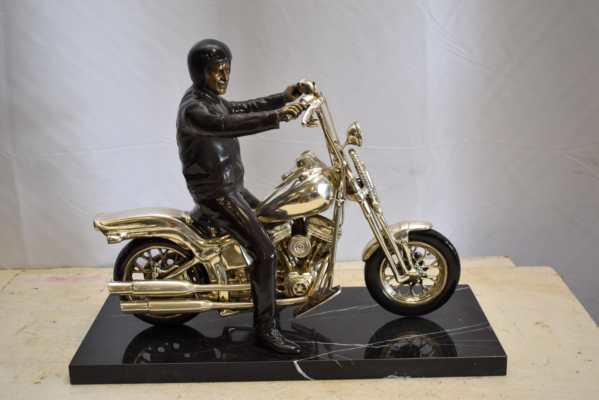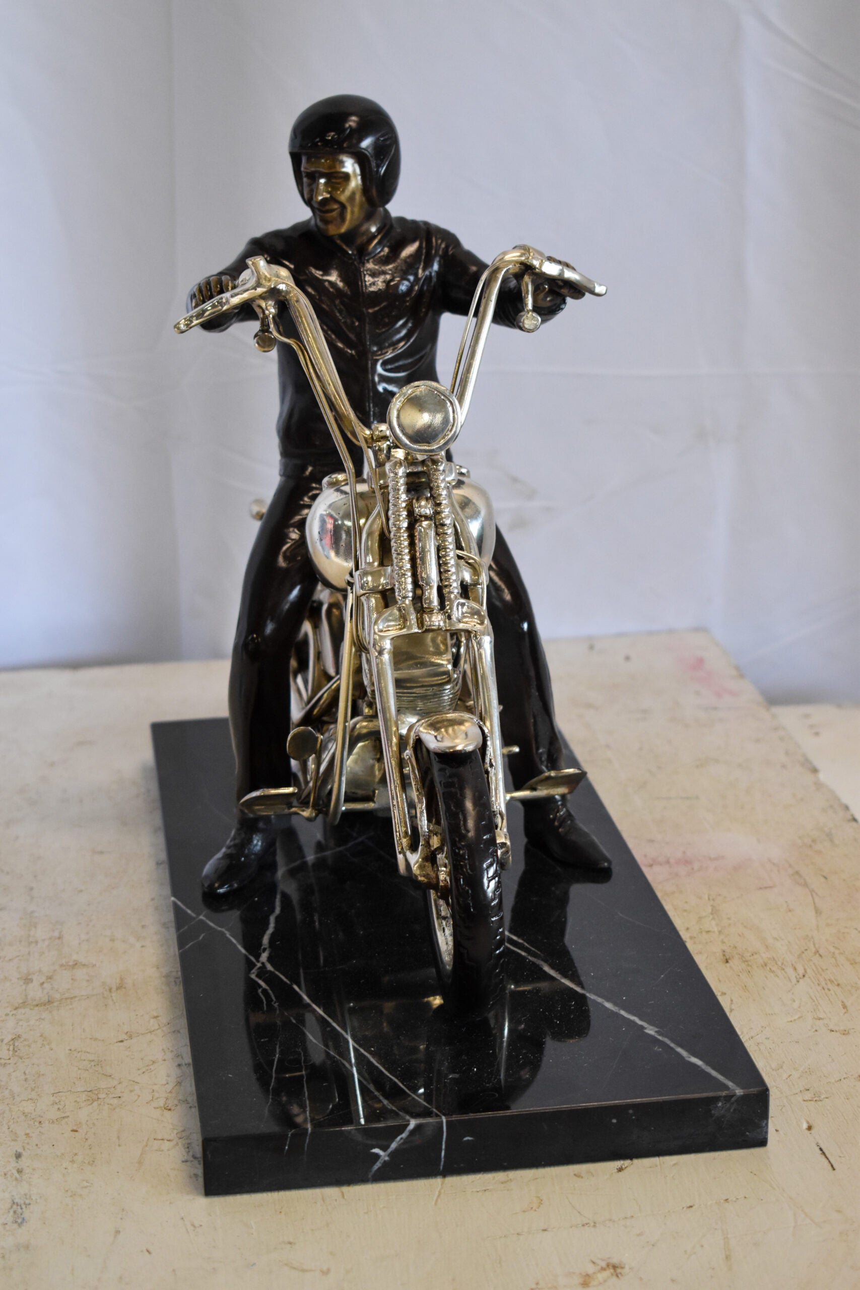 This replica bronze statue of a Harley Davidson Motorcycle Rider would be a great addition to the shelf or office of any motorcycle lover. With a solid black marble base, and exquisite detail in the finishings of the bike itself, there is no lack of artistry in this carefully crafted piece. Size: 20"L x 9"W x 13"H. Weight is: 34Lb