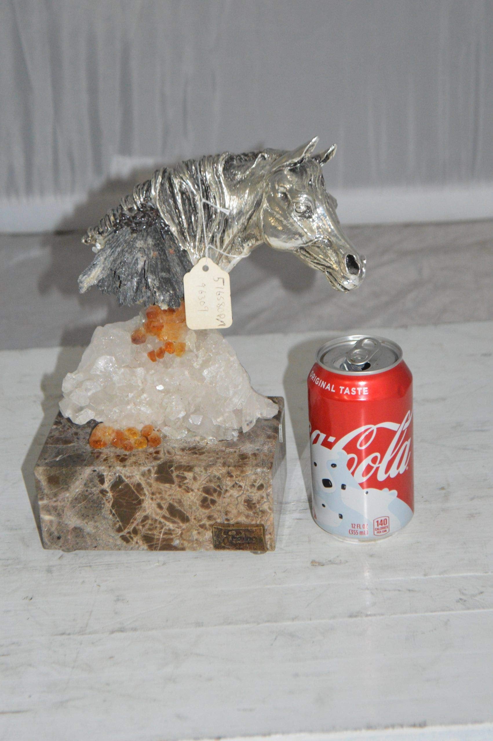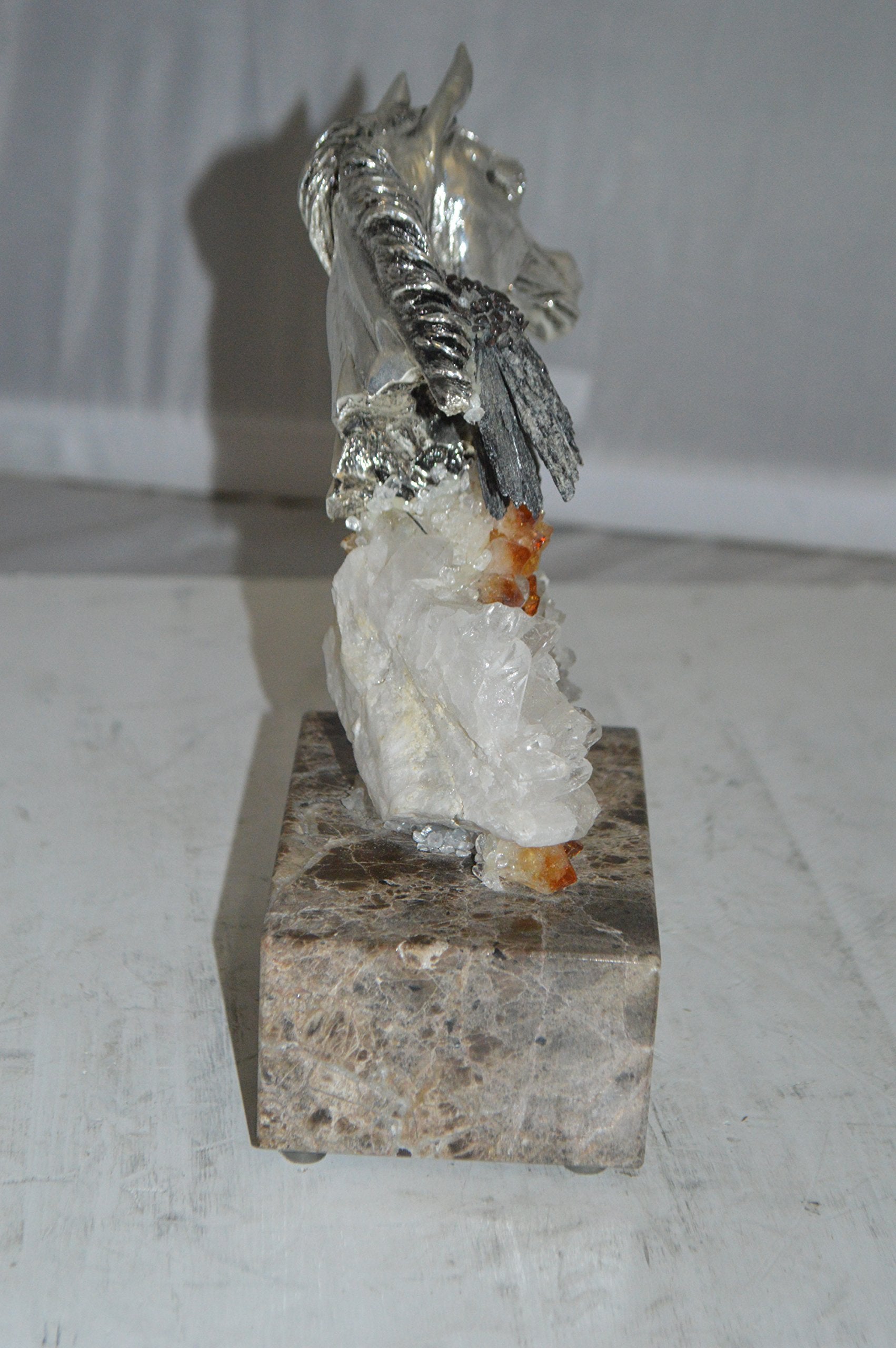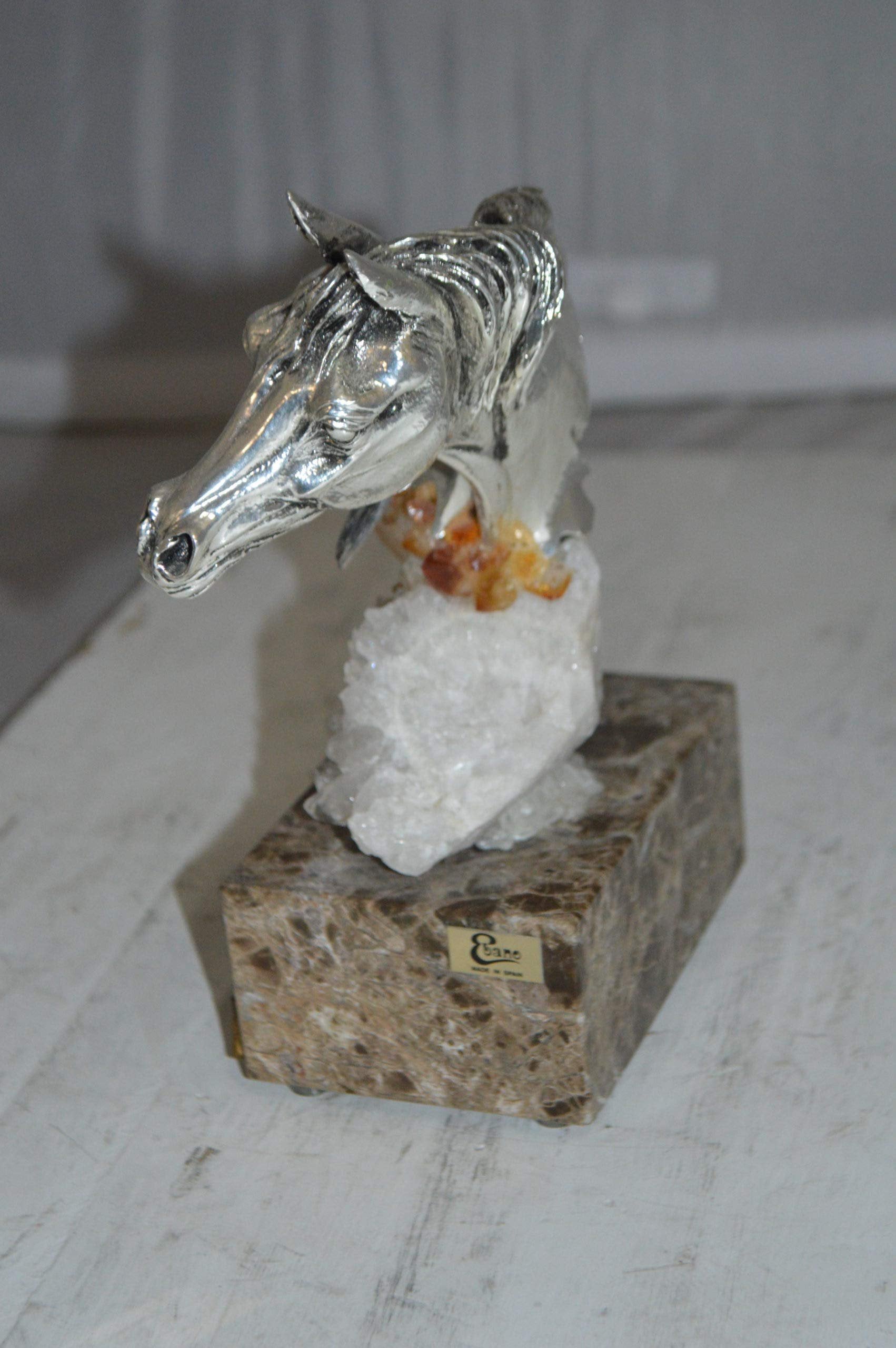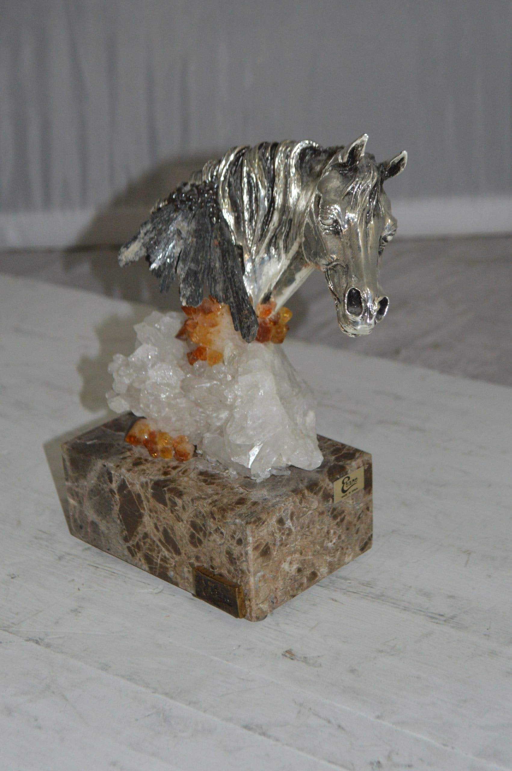 The beautiful bronze statue finished in antique silver, of a head of a horse mounted on crystal stone, by the well know artist, Vidal, is made with the creation of your imagination. This bronze statue is museum quality and hand-cast in high-quality 100% American bronze using the “Lost Wax Processâ€ of bronze casting over a very special stone. Size: 4"L x 9"W x 10"H. Weight is: 8Lb