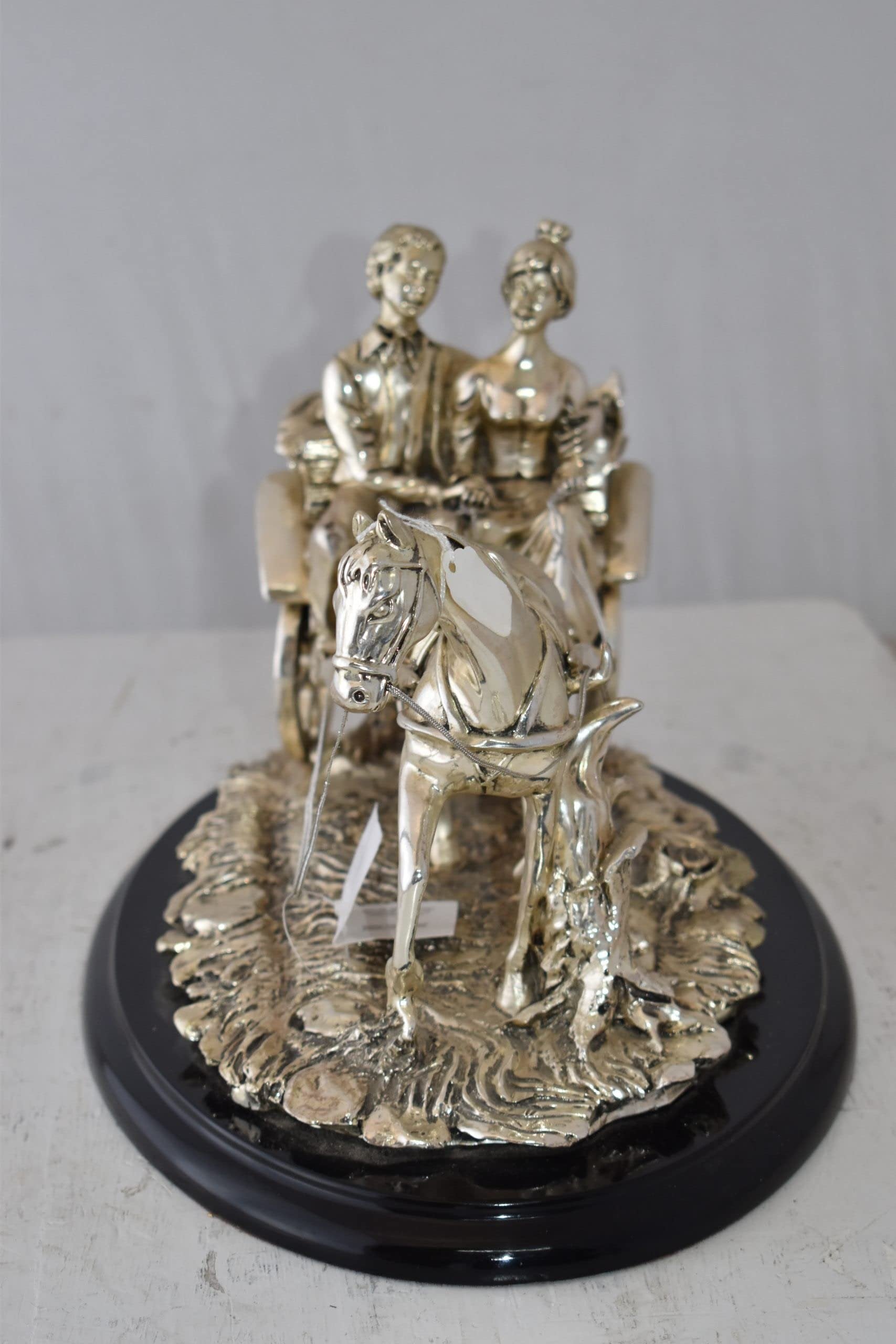 Enjoy this Impressive, classic, resin statue with silver finish mounted on a wood base, beautiful piece of a horse with carriage. On the carriage is a young man and women enjoying the ride. Resin casting is a method of plastic casting where a mold is filled with a liquid synthetic resin, which then hardens. Get one for yourself or surprise a friend with an unforgettable gift! Size: 17"L x 10"W x 10"H. Weight is: 11Lb
