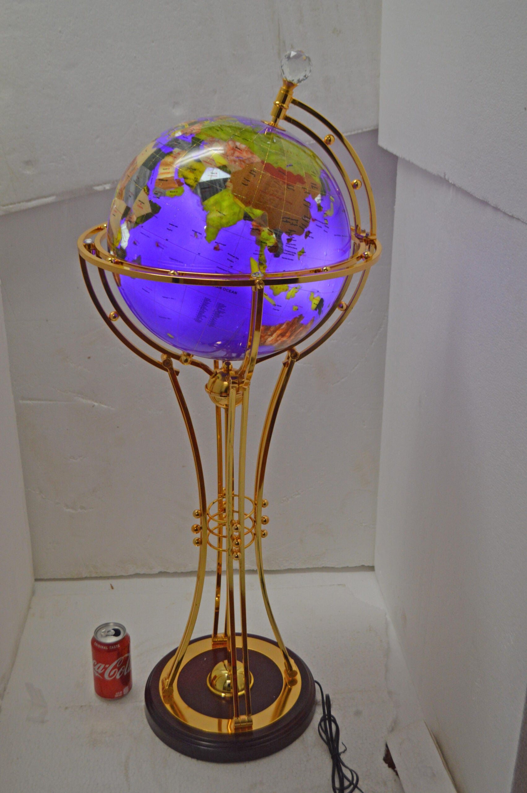 This beautiful rotating globe on a stand, illuminates, as well as has a motor that spins to show the world's cities in the dark. This beautiful globe will be a valuable addition to any area of the home or office and would look great when it lights in the dark. Size: 19"L x 19"W x 42"H. Weight is: 25Lb