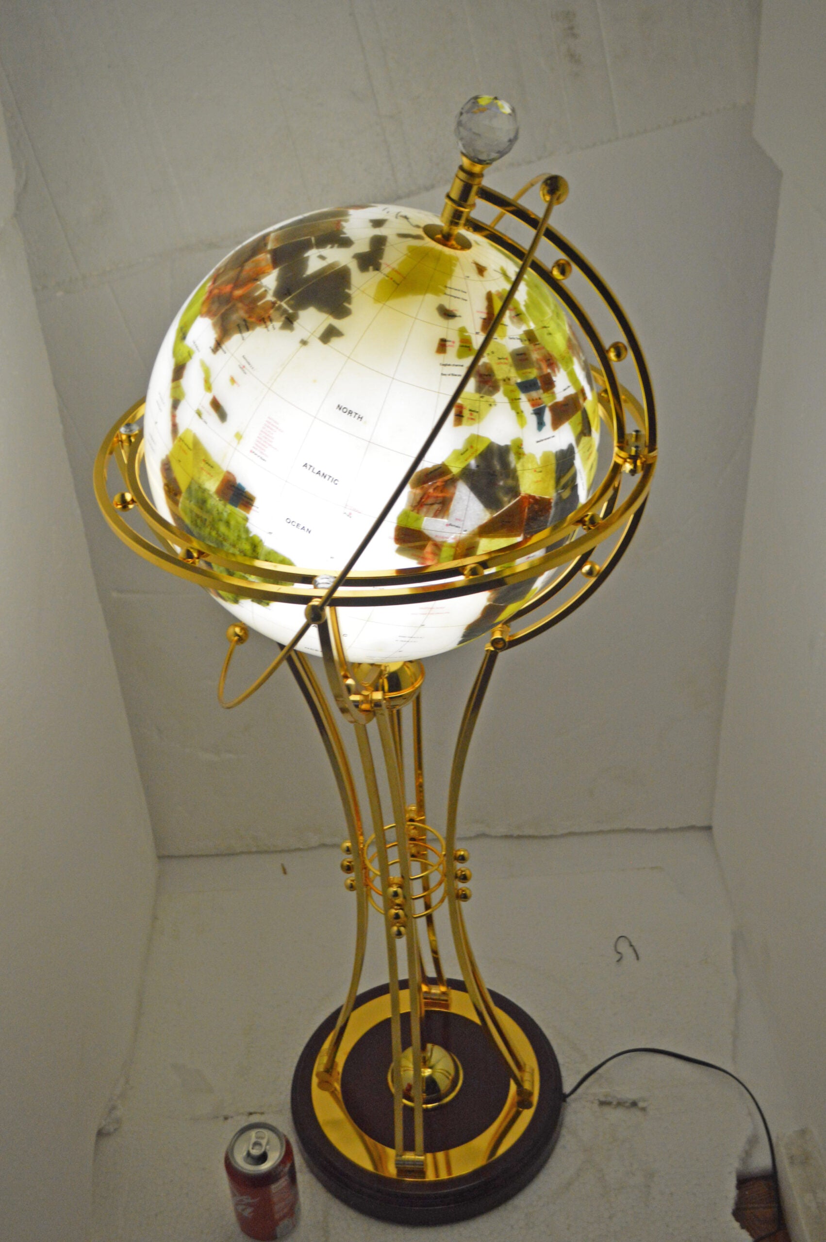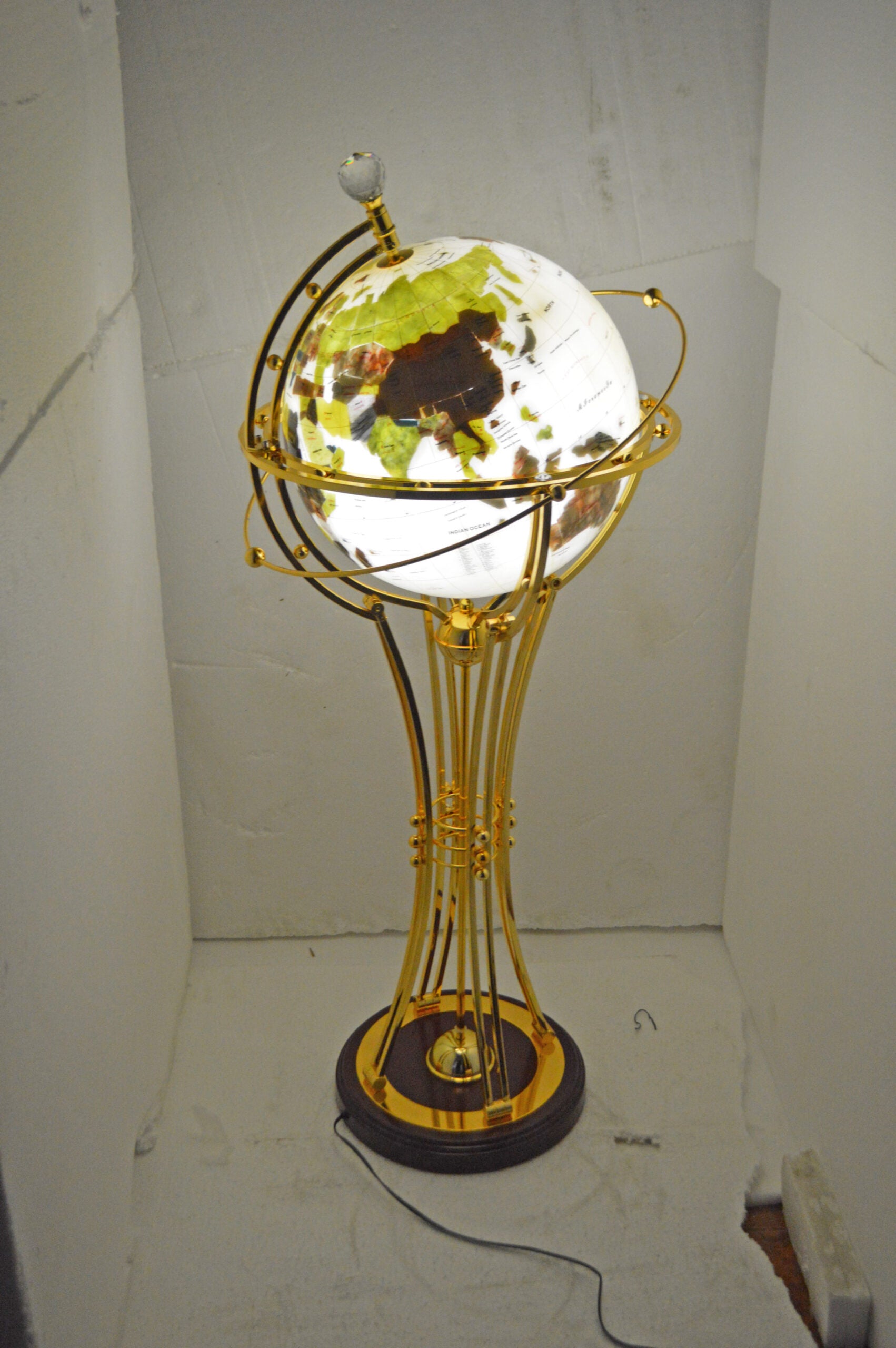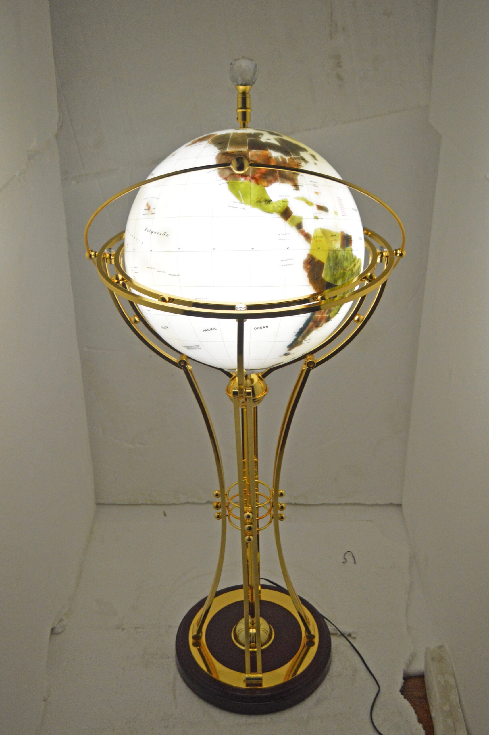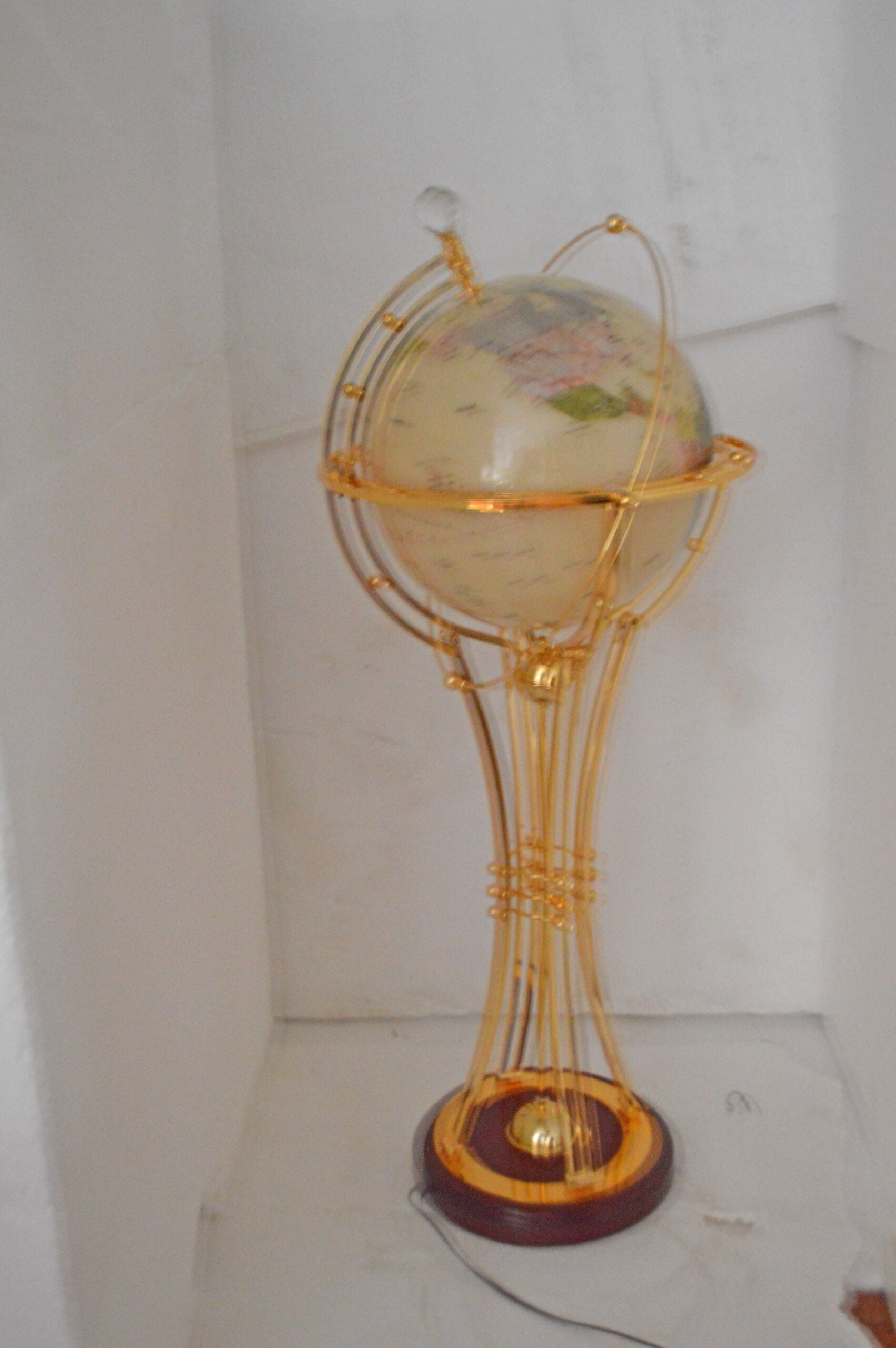 This beautiful rotating globe on a stand, illuminates, as well as has a motor that spins to show the world's cities in the dark. This beautiful globe will be a valuable addition to any area of the home or office and would look great when it lights in the dark. Size: 19"L x 19"W x 42"H. Weight is: 25Lb