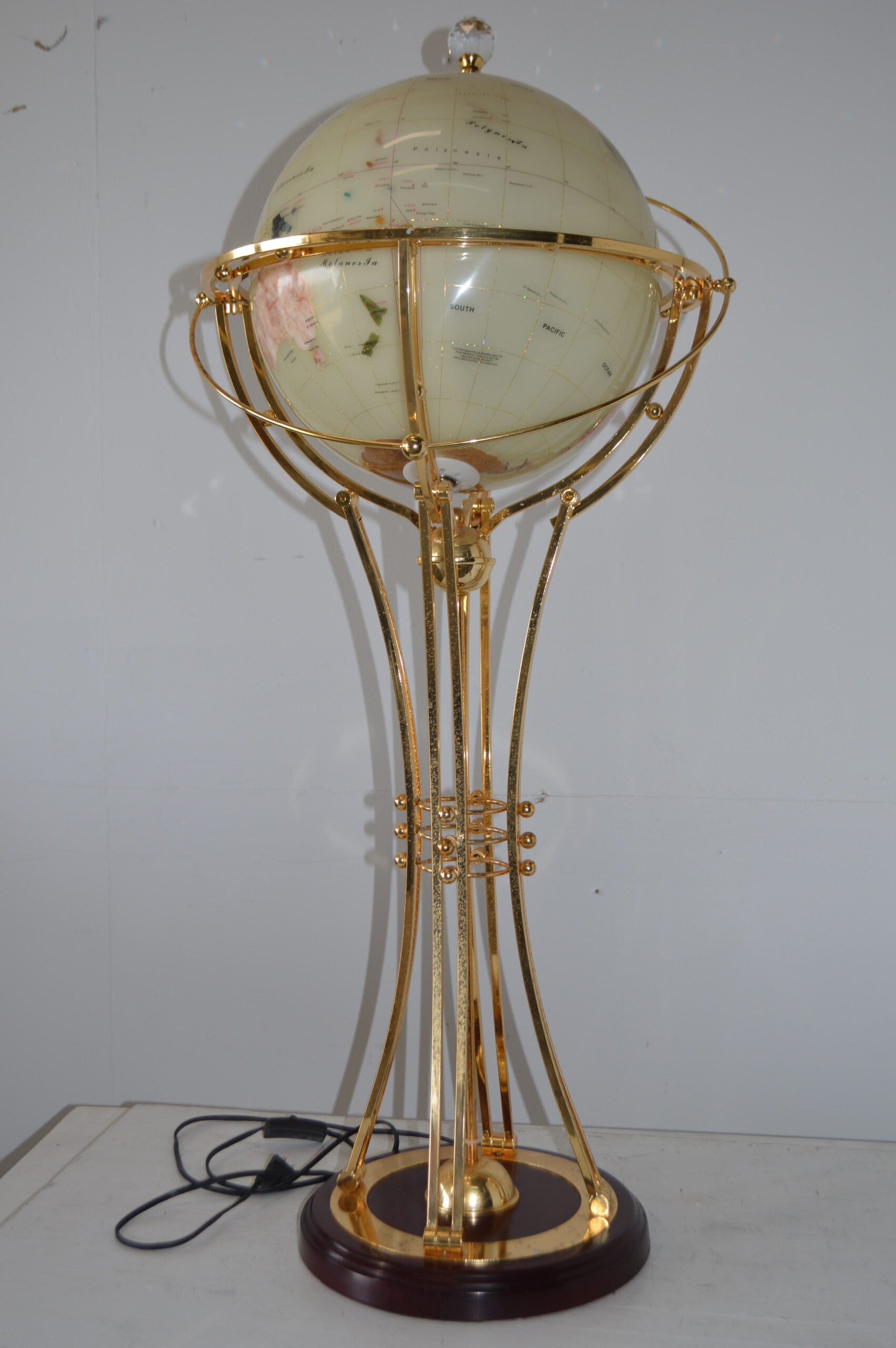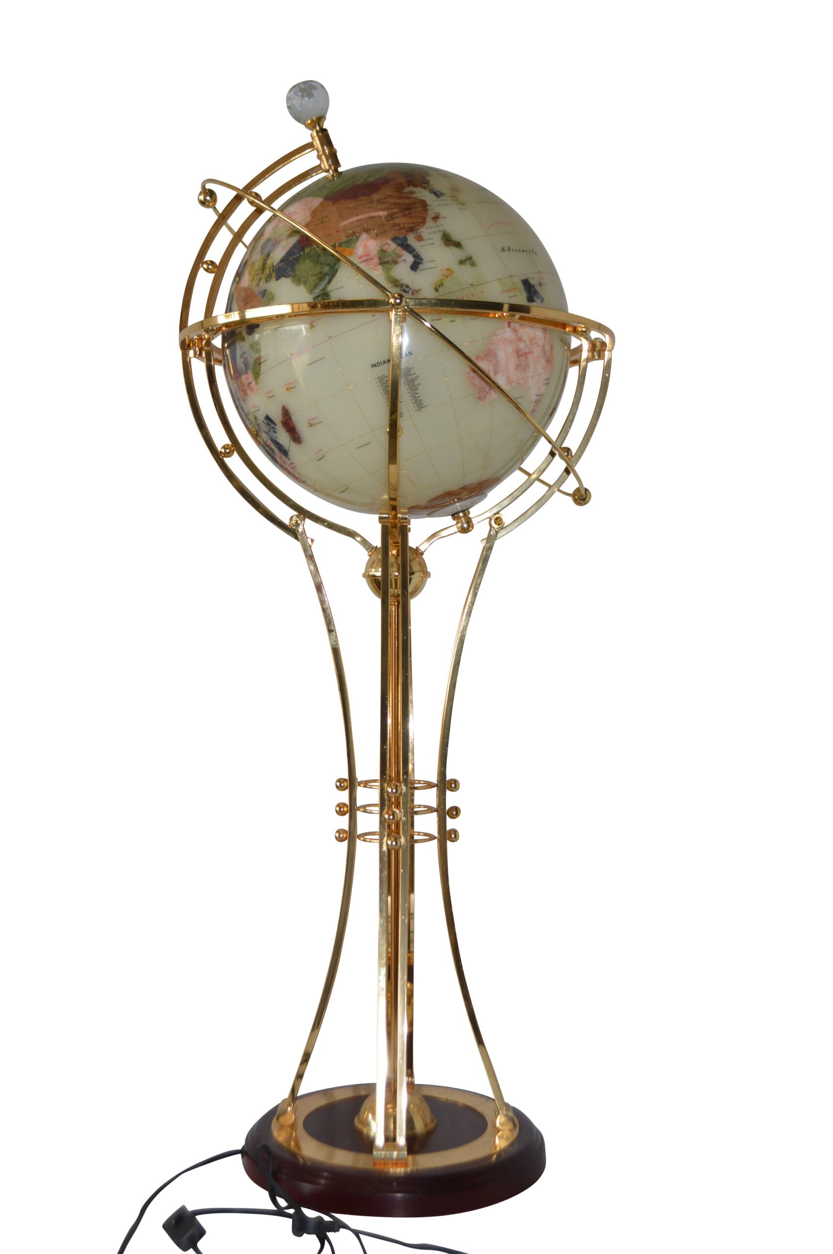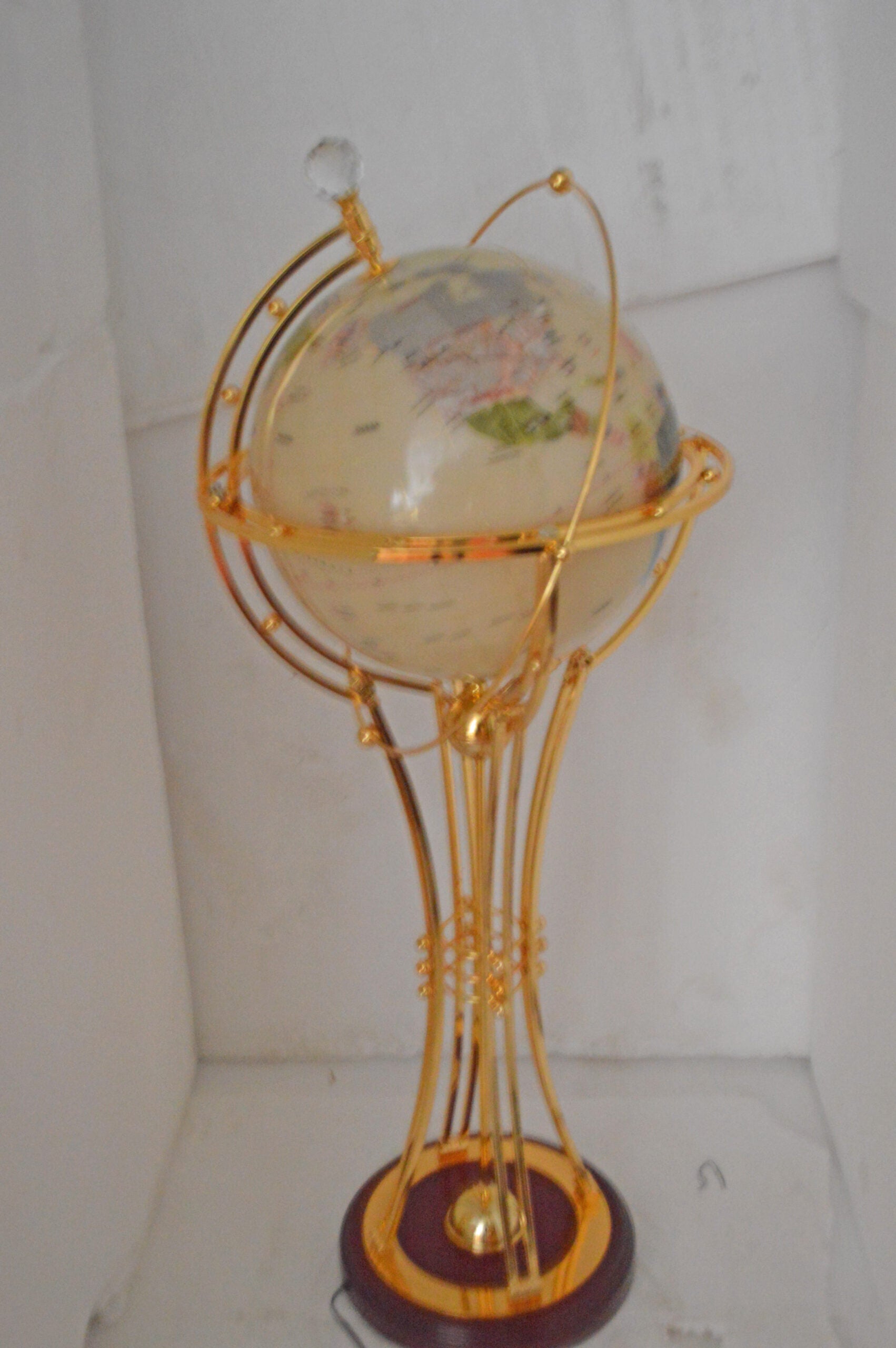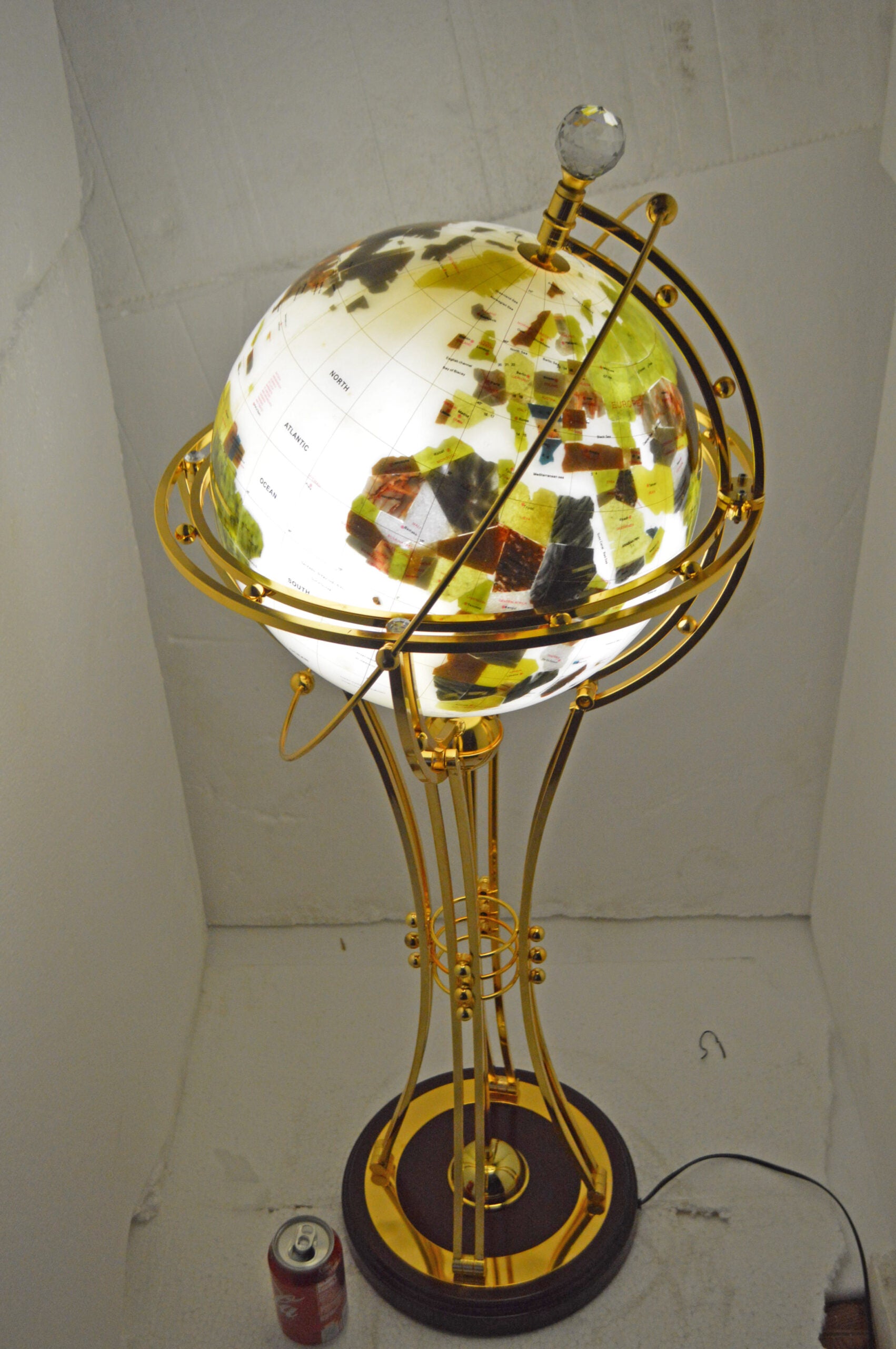This beautiful rotating globe on a stand, illuminates, as well as has a motor that spins to show the world's cities in the dark. This beautiful globe will be a valuable addition to any area of the home or office and would look great when it lights in the dark. Size: 19"L x 19"W x 42"H. Weight is: 25Lb