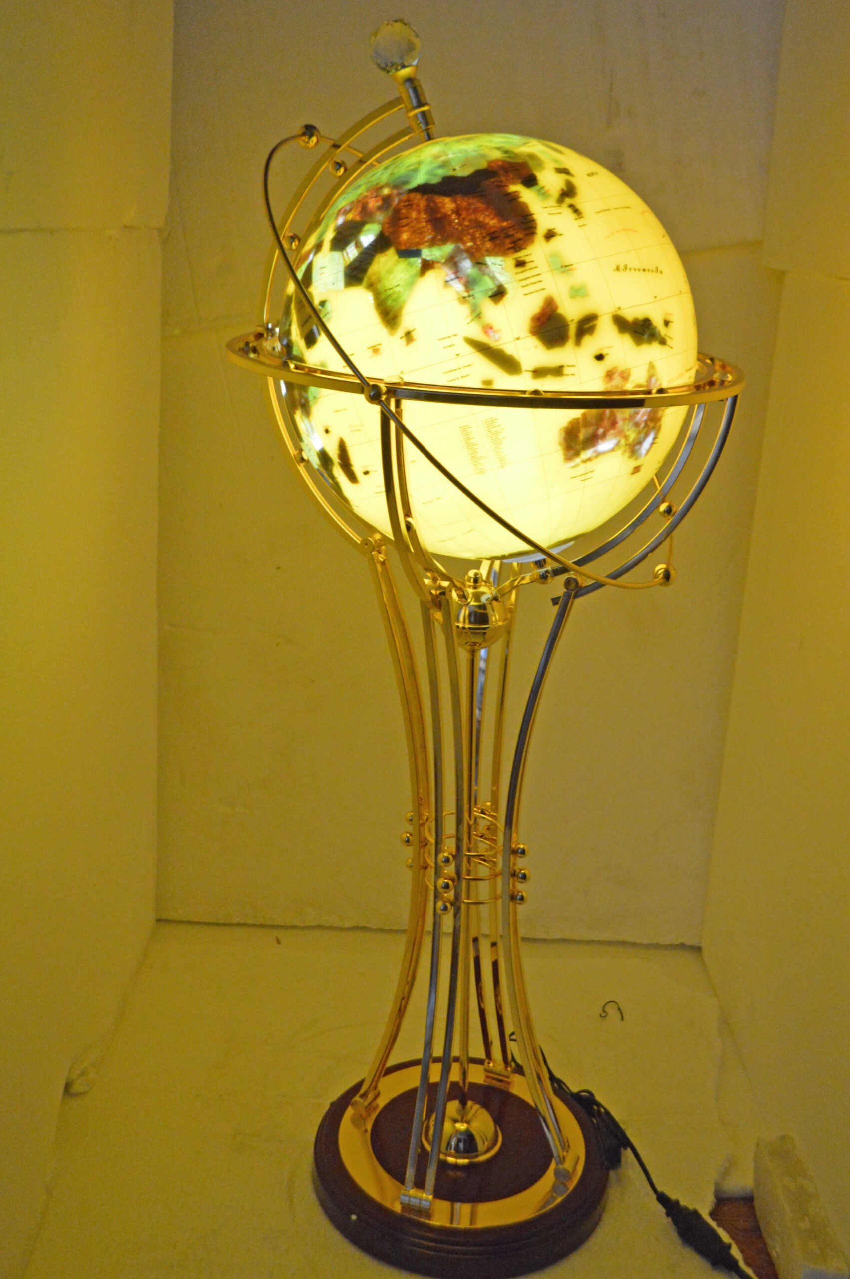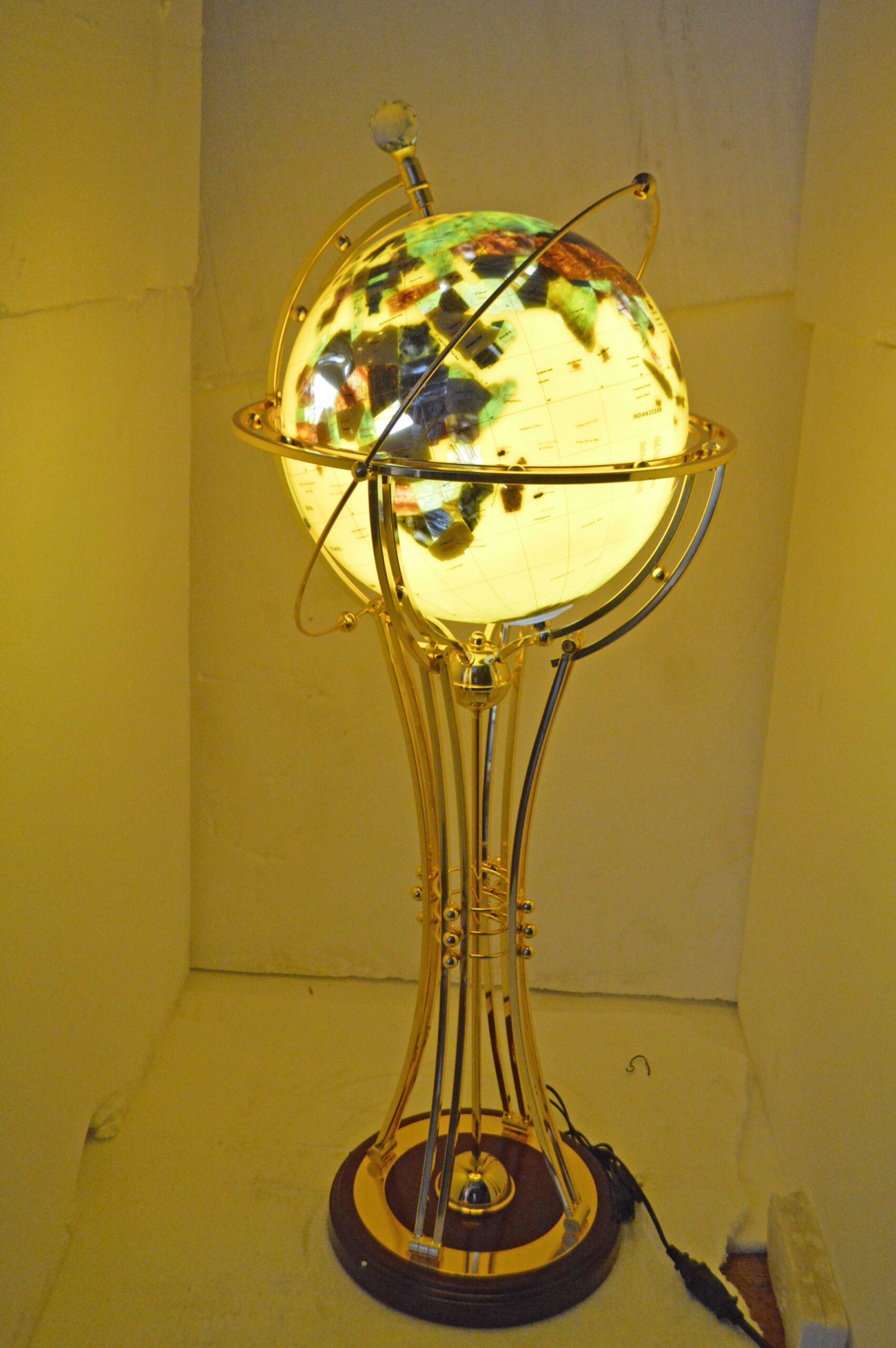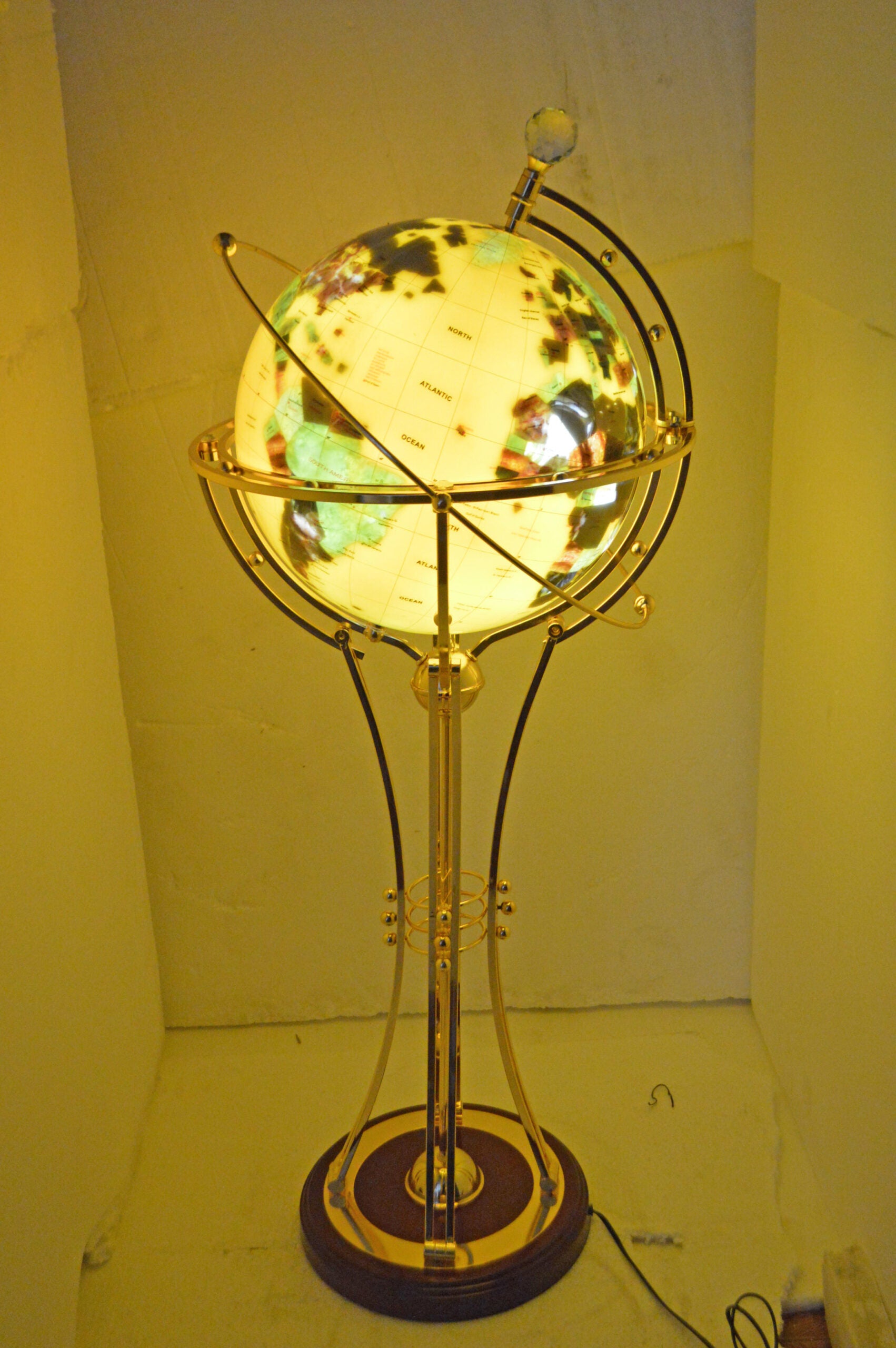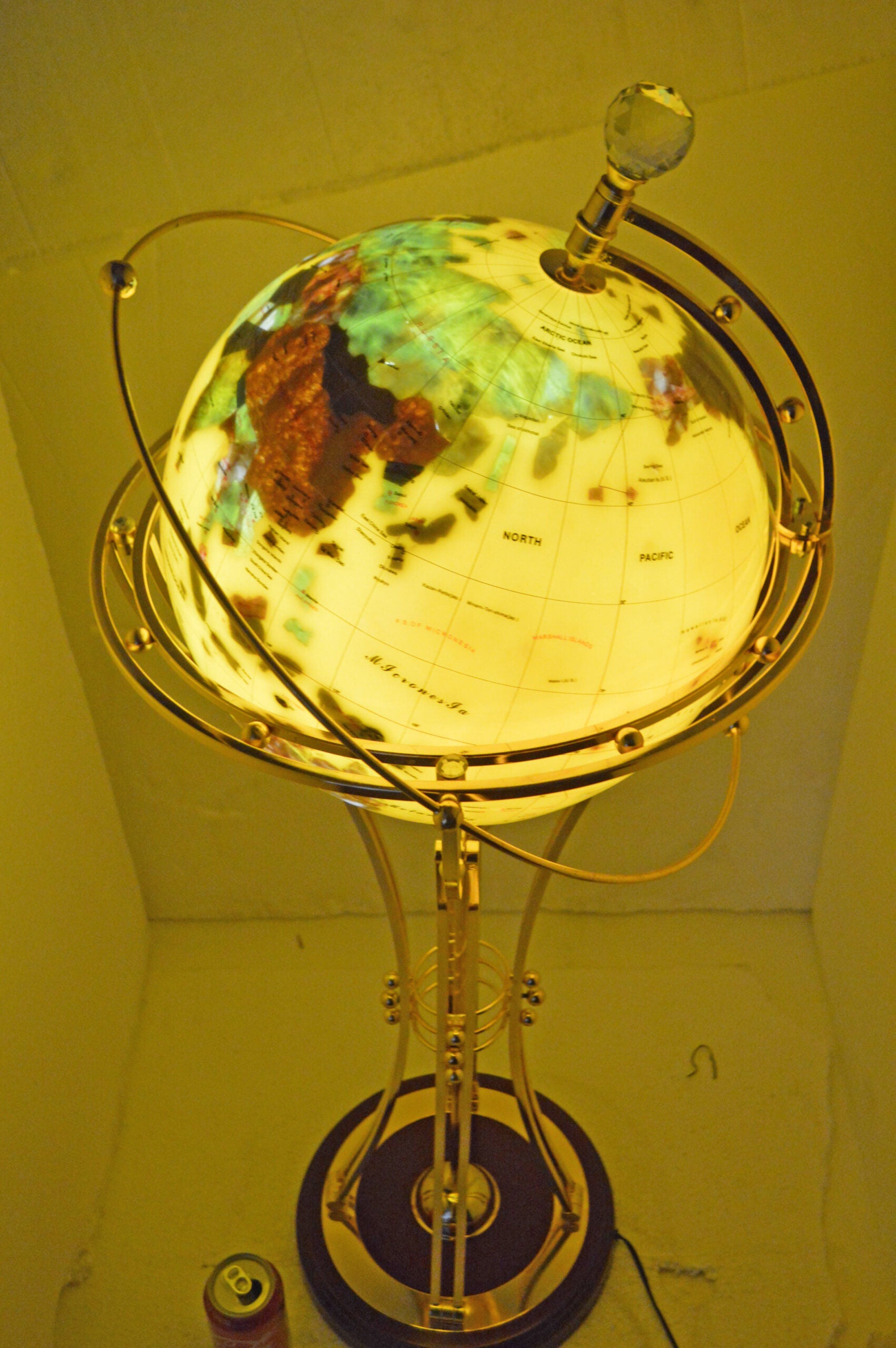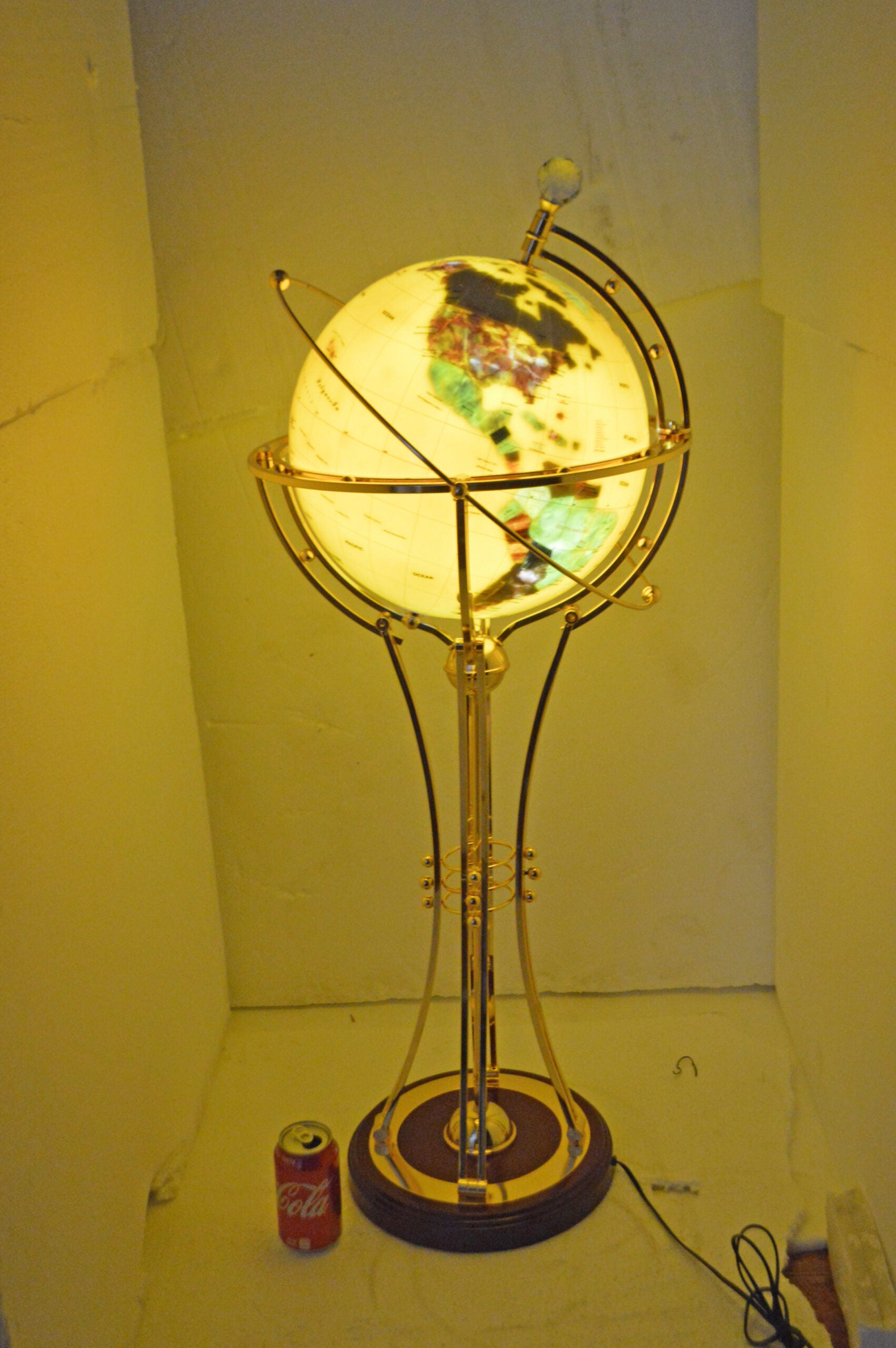 This beautiful rotating globe on a stand, illuminates, as well as has a motor that spins to show the world's cities in the dark. This beautiful globe will be a valuable addition to any area of the home or office and would look great when it lights in the dark. Size: 19"L x 19"W x 42"H. Weight is: 25Lb