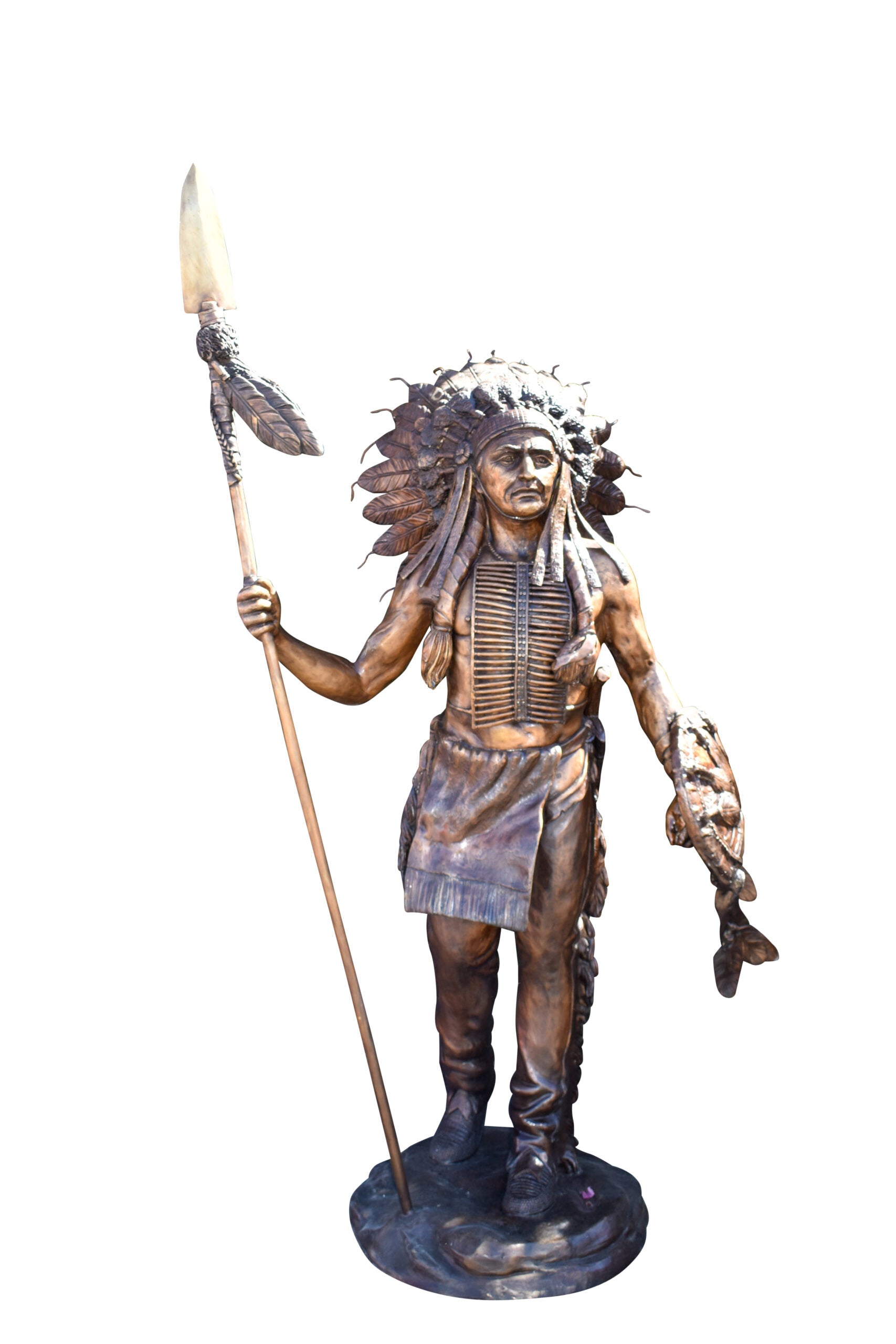 This charming Life size bronze statue depicts Native American Chief standing and holding his shield and spear. This very fine and unique abstract was casted using the ancient old Lost Wax Method with brown patina finish, handmade, from pure bronze. This beautiful bronze-cast statue will be a valuable addition to any area of the home, office, patio, or garden. Size: 50"L x 36"W x 95"H. Weight is: 390Lb