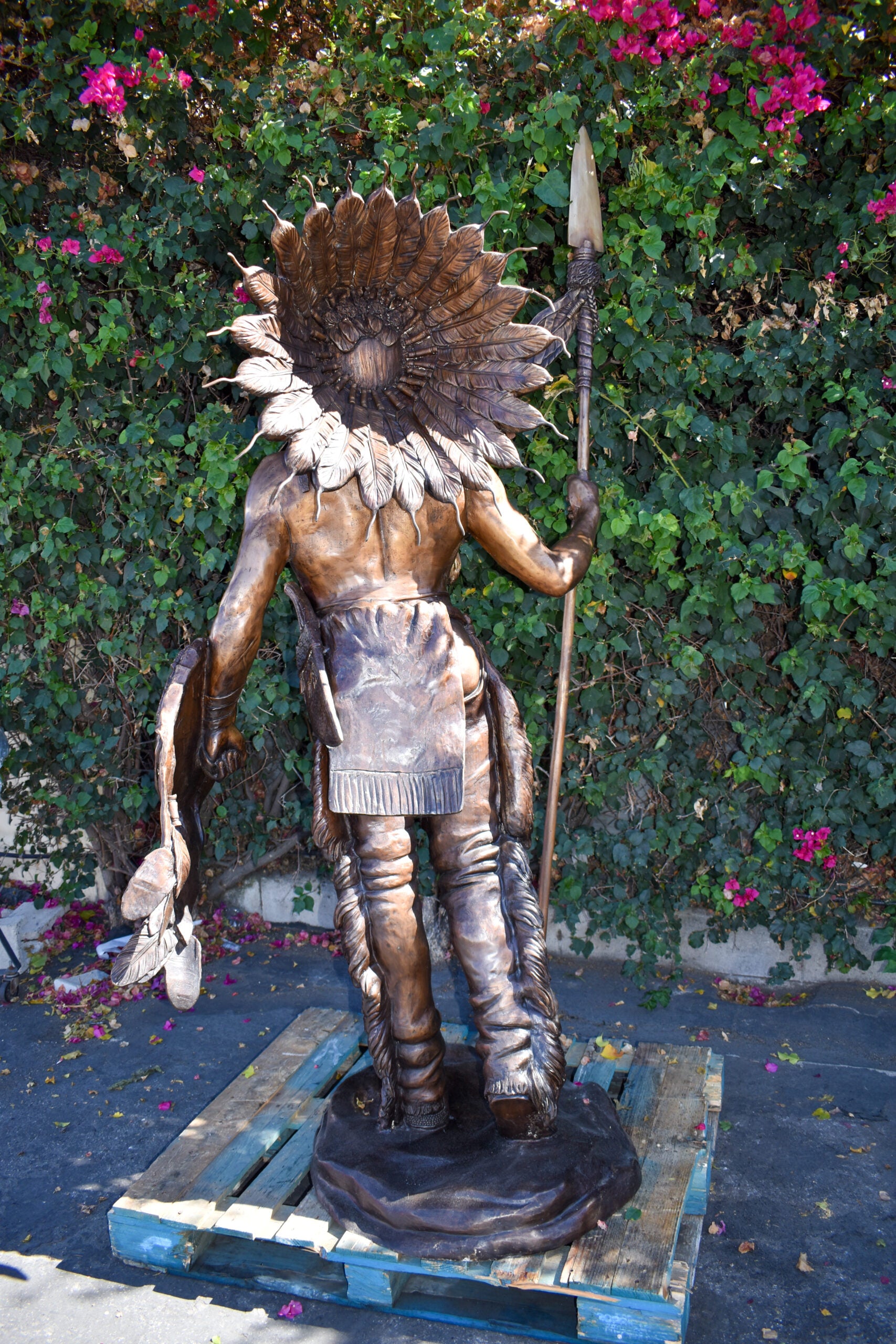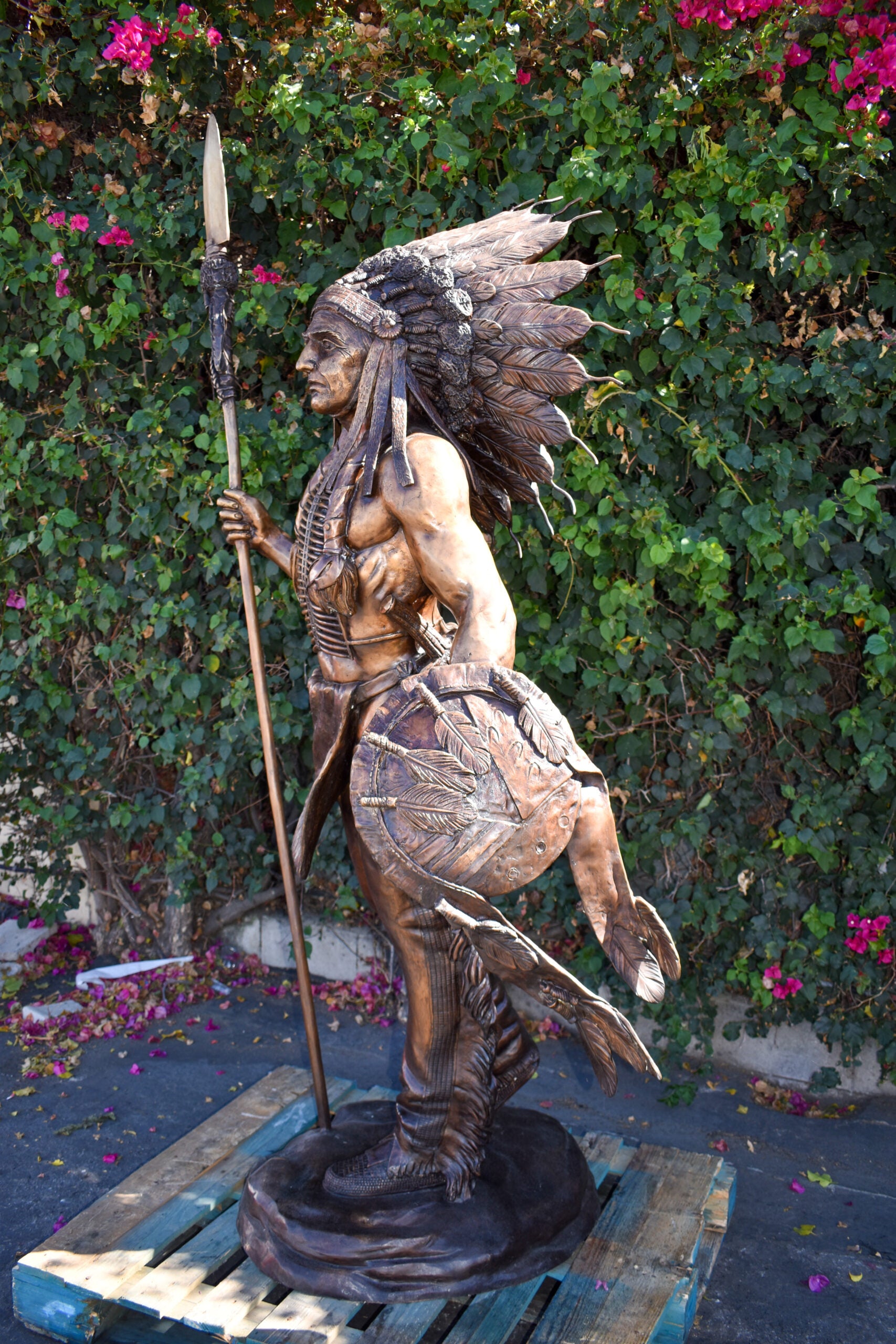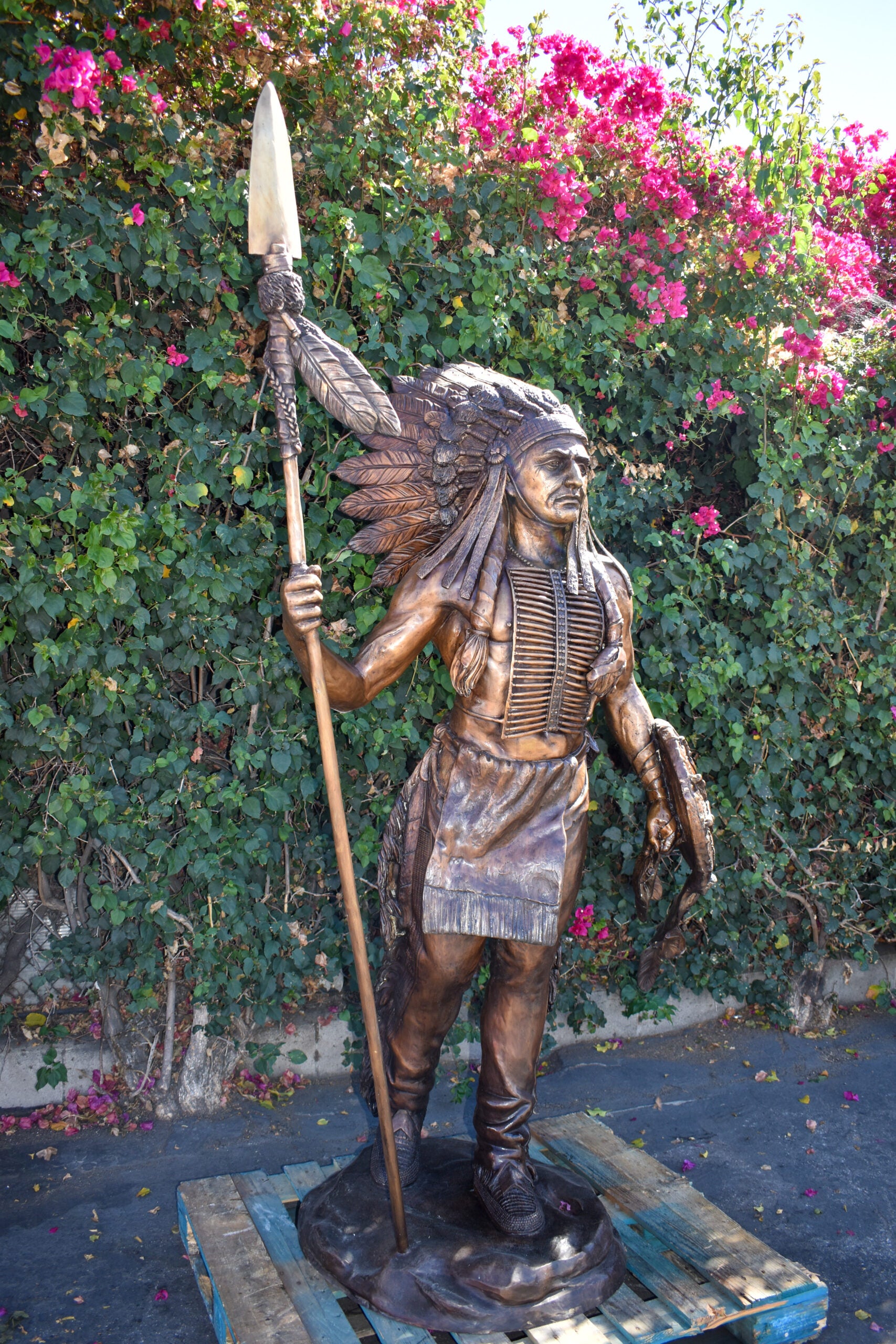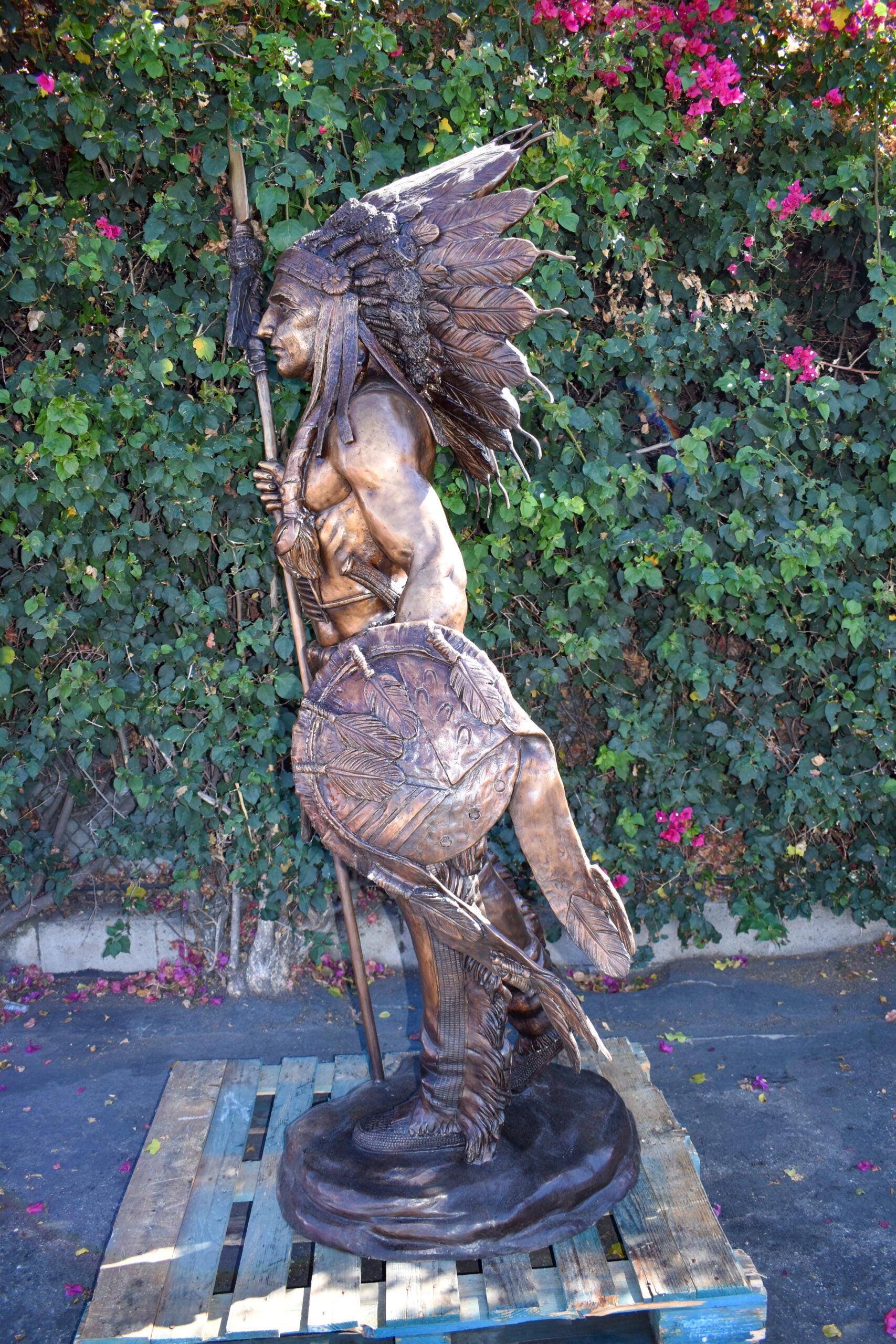 Indian Chief Brown Patina Detailed Bronze Statue Size: 50" x 36" x 95"H