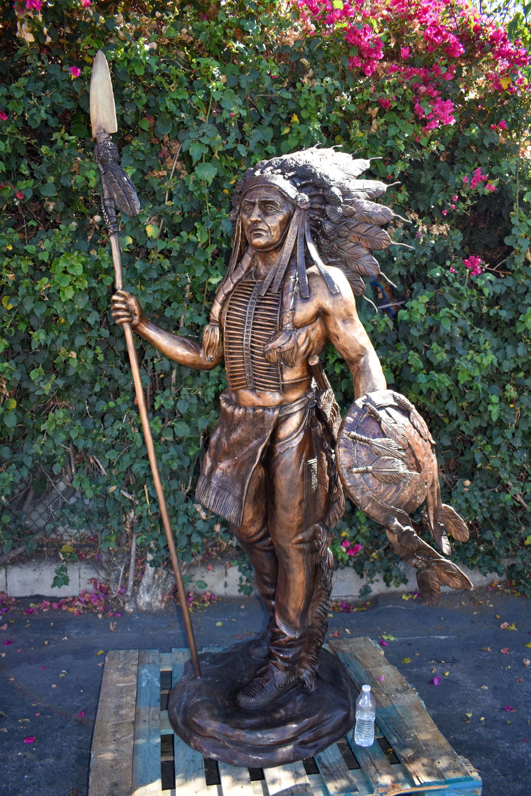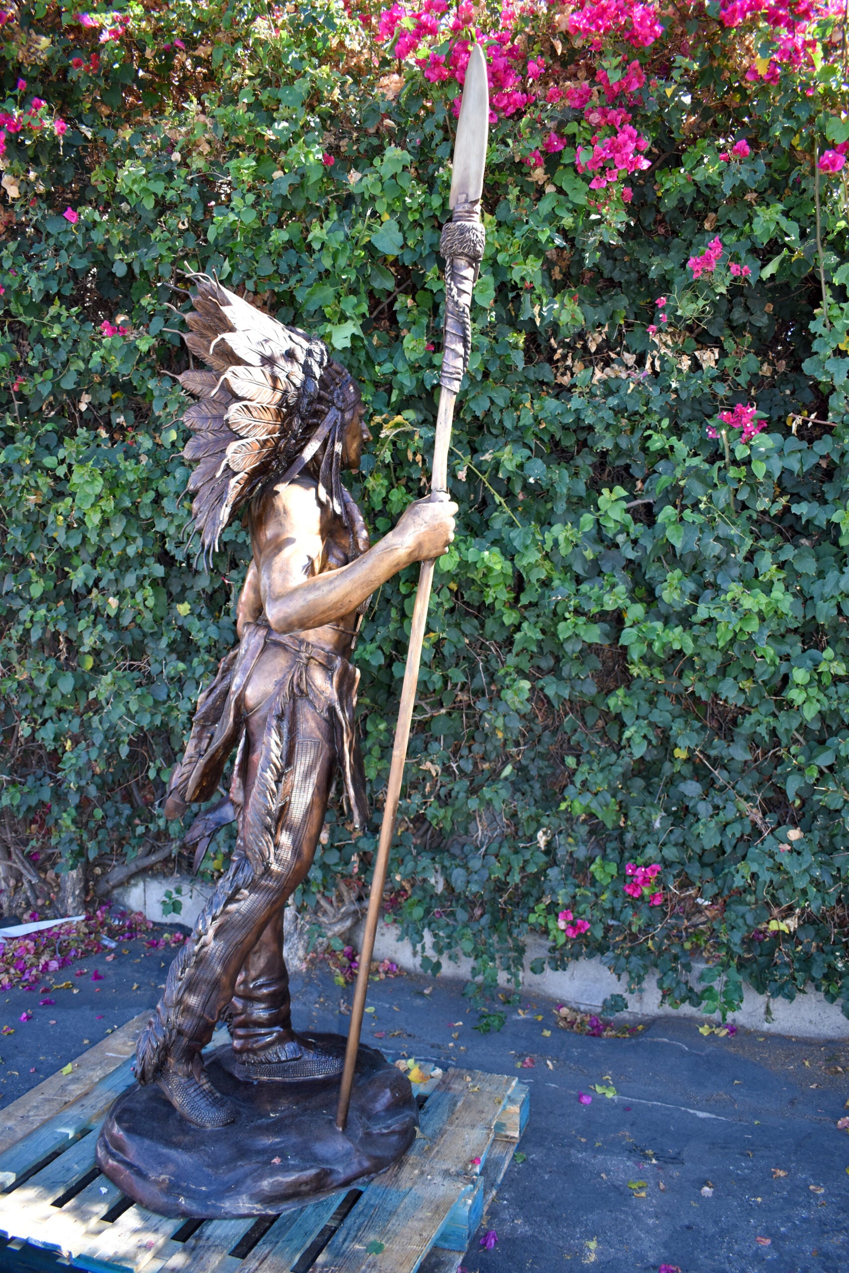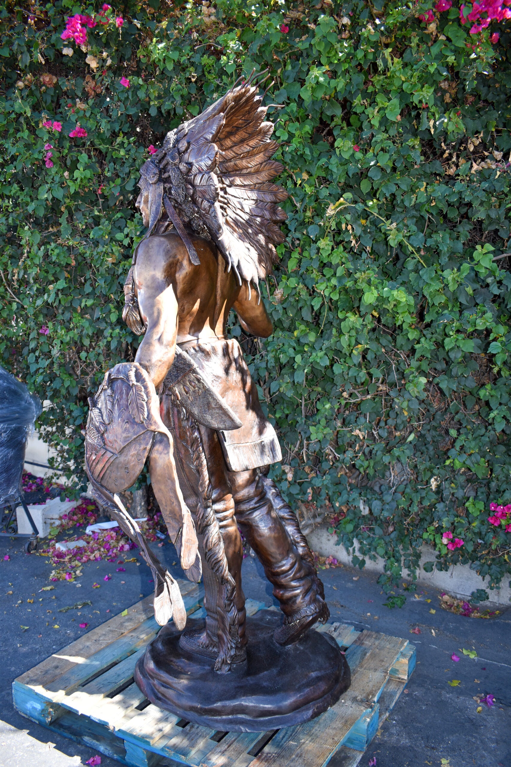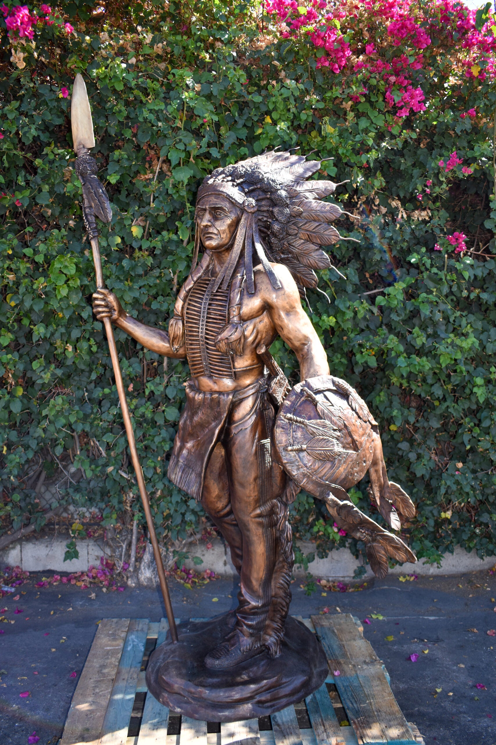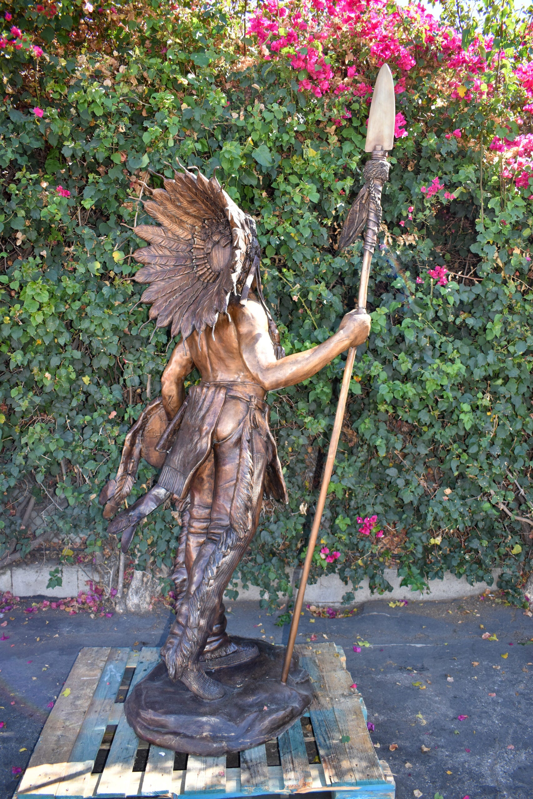 Indian Chief Brown Patina Detailed Bronze Statue Size: 50" x 36" x 95"H