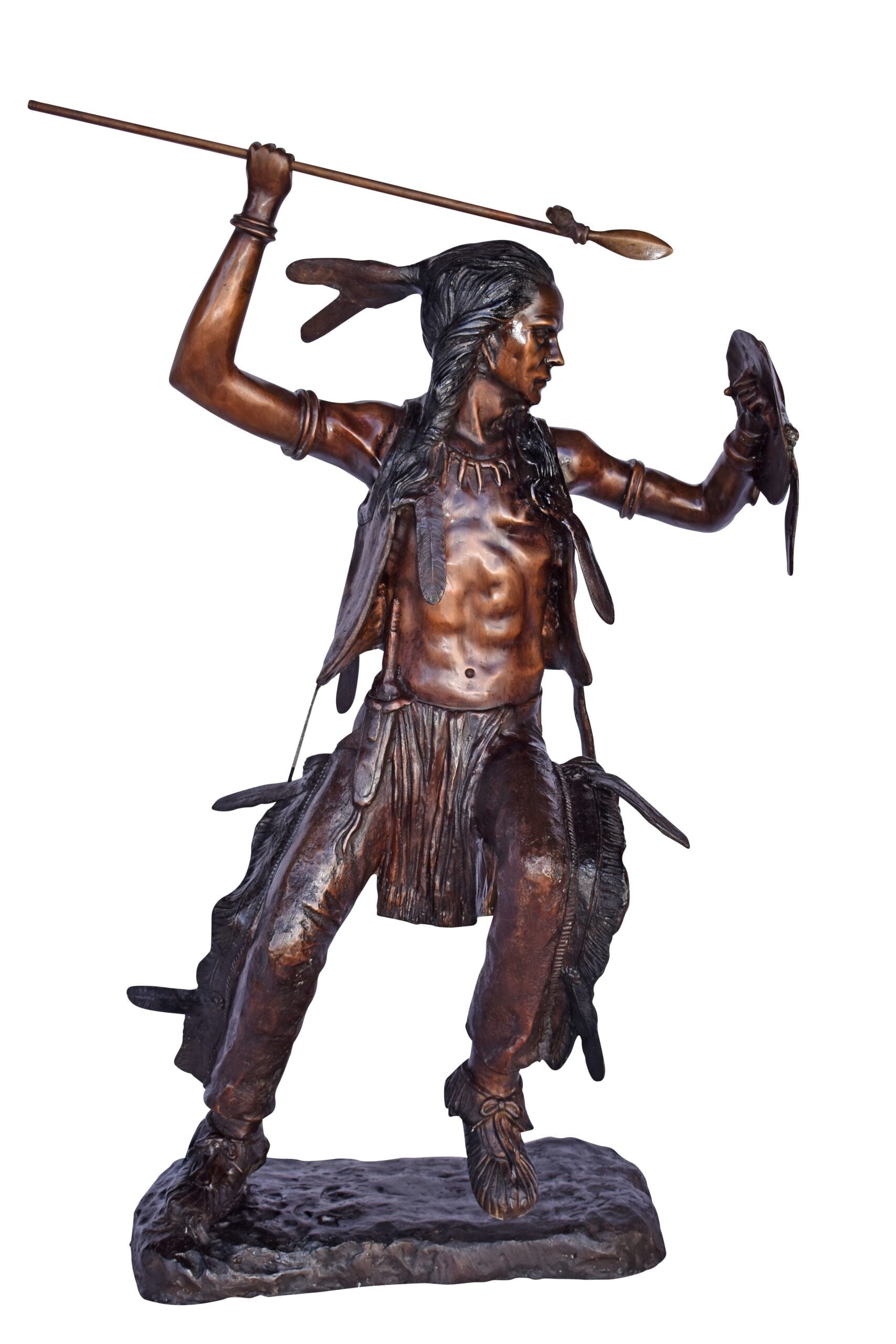Here is a magnificent, impressive bronze statue of an Indian Worrier Throwing a Spear. The sculpture is cast in the traditional lost-wax method, which highlights the exceptionally fine detail and lasting heirloom beauty. The statue is a one-of-a-kind art piece, made to give your home style, personality and will certainly add another perspective of the American history to your home. Get one for yourself or surprise a friend with an unforgettable gift! Size: 15"L x 23"W x 38"H. Weight is: 46Lb Here is a magnificent, impressive bronze statue of an Indian Worrier Throwing a Spear. The sculpture is cast in the traditional lost-wax method, which highlights the exceptionally fine detail and lasting heirloom beauty. The statue is a one-of-a-kind art piece, made to give your home style, personality and will certainly add another perspective of the American history to your home. Get one for yourself or surprise a friend with an unforgettable gift! Size: 15"L x 23"W x 38"H. Weight is: 46Lb