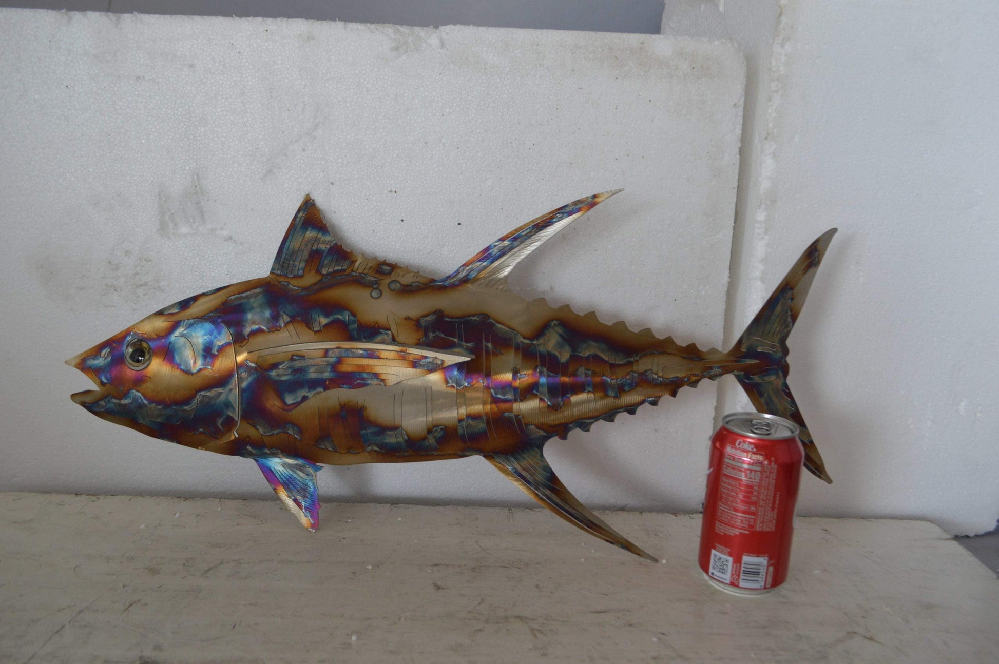 This jack fish is crafted using laser cut steel and can be mounted on any wall desiring a nautical addition. The immense detail in both the iridescent color of the fish and the shape makes it both realistic looking and unique in design. This work of art would pair well with any of the other nautical mounted wall art. Size: 25"L x 2"W x 12"H. Weight is: 2Lb