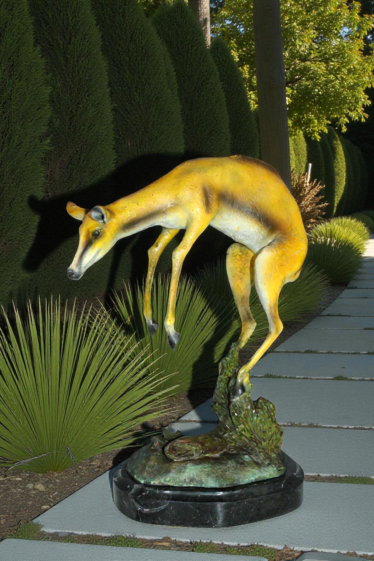 A cold painted Jumping Impala with very fine naturalistic color and details – this statue would be a great addition to your home, patio, garden, lawn, or anywhere else. (Normally sold in pairs) Size: 9"L x 7"W x 16"H. Weight is: 15Lb