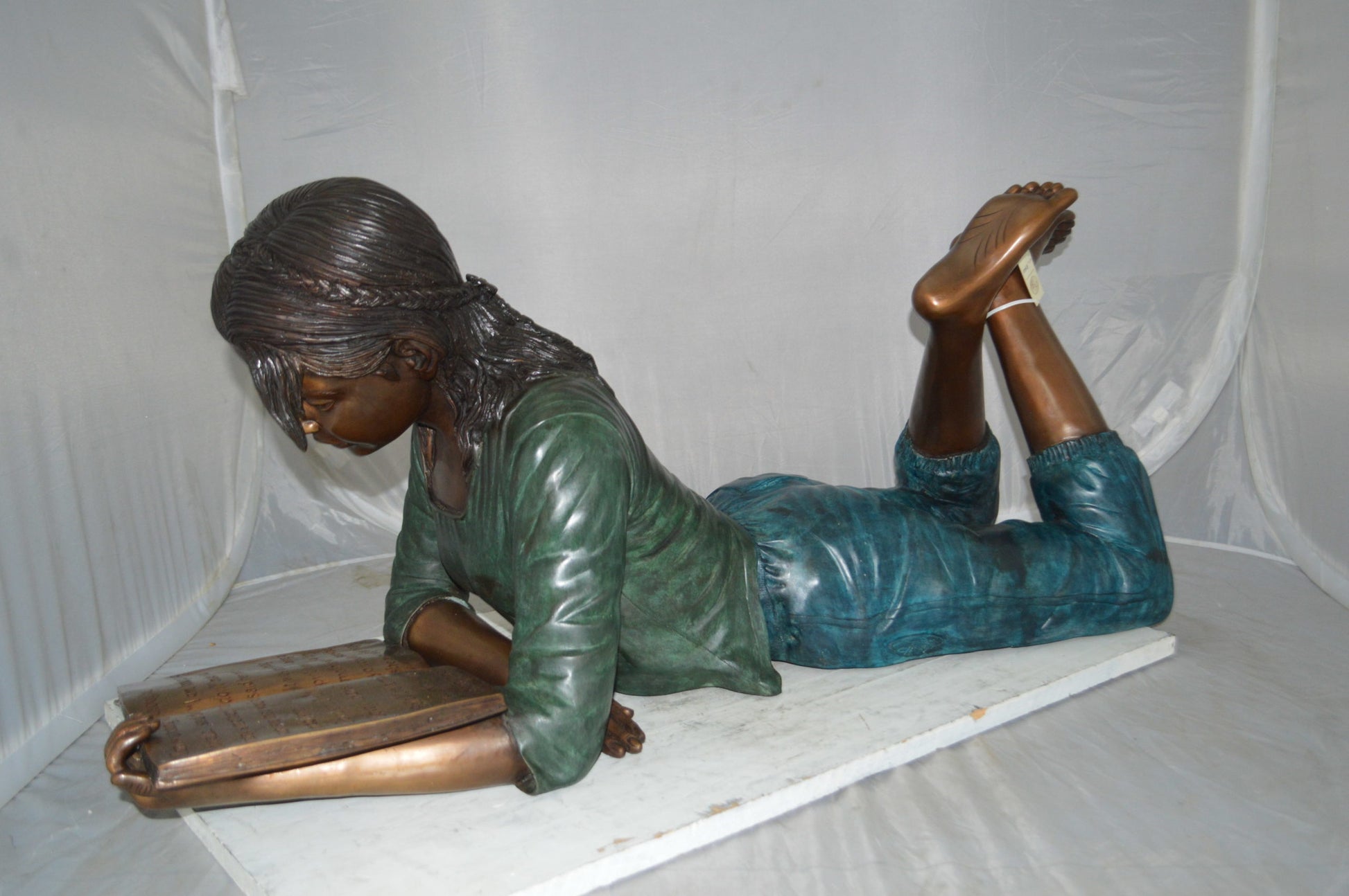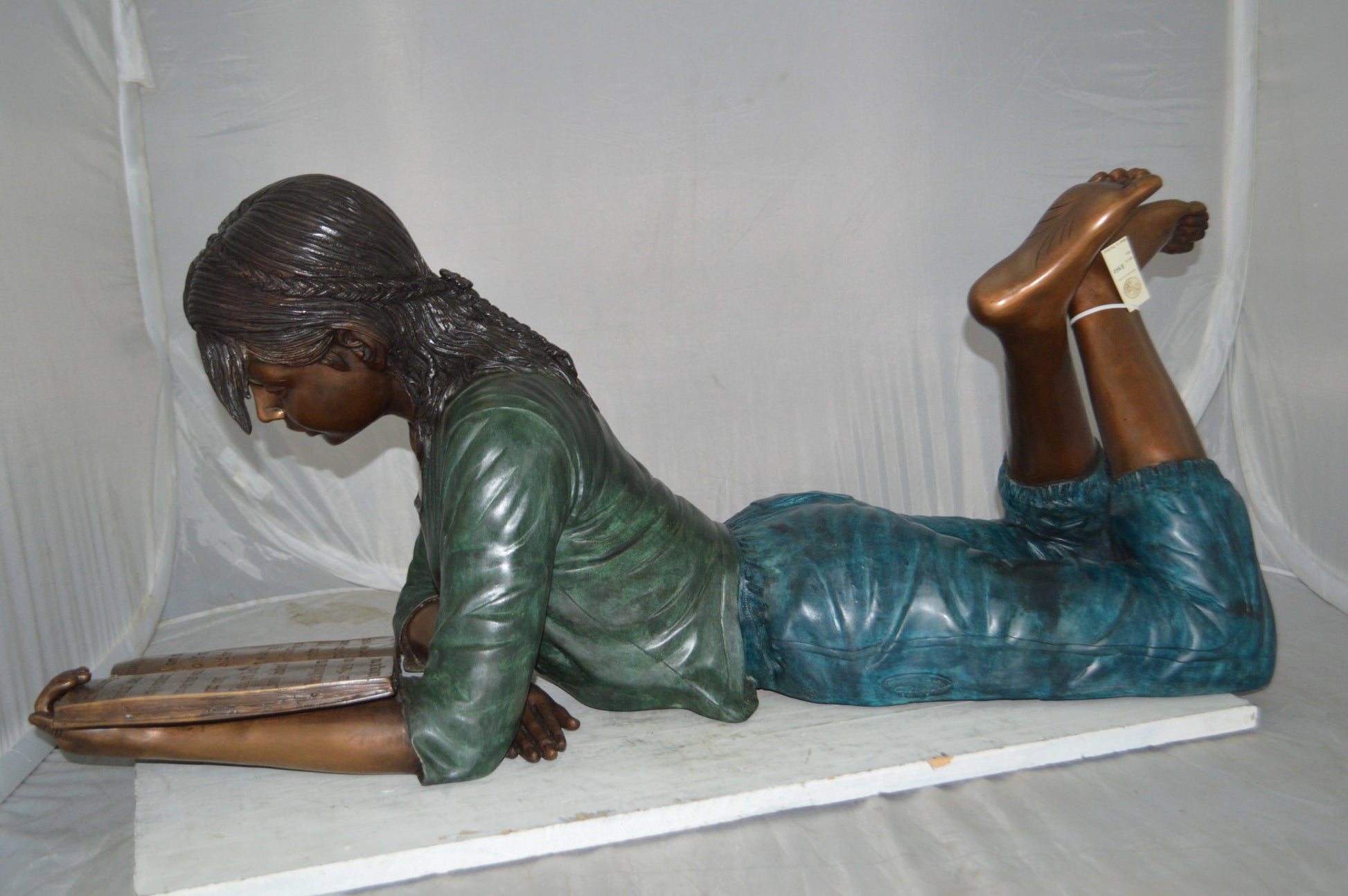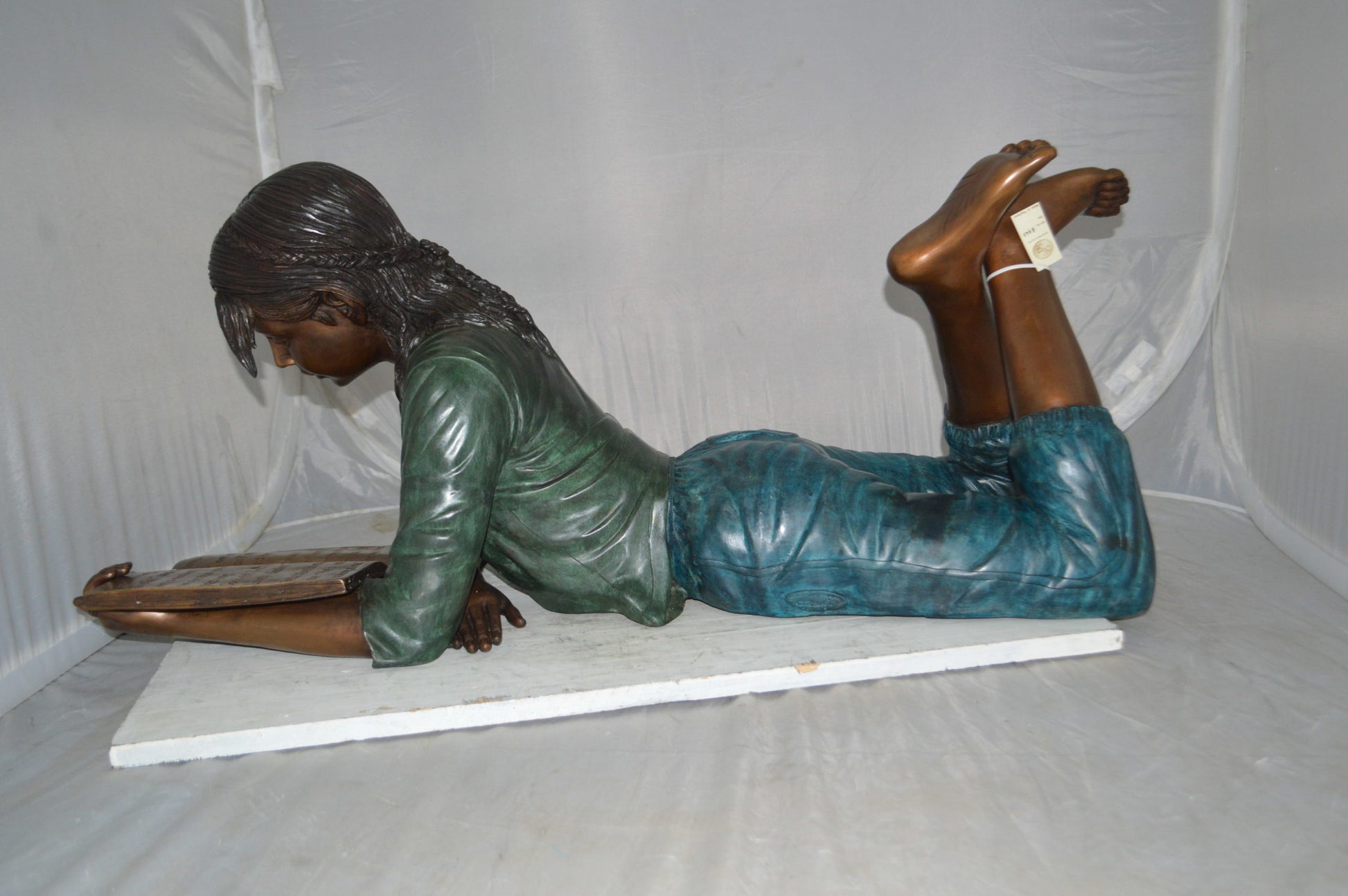 Magnificent large size bronze statue of a young girl laying down outside and reading a book. The joy of youth, lost in a book and putting thoughts to paper, will make your landscape come alive. The sculpture tones are finished in a lacquer patina on a heavy bronze base. This is a perfect addition to a home, and reminds us of the simple things in life. Size: 42"L x 18"W x 17"H. Weight is: 58Lb