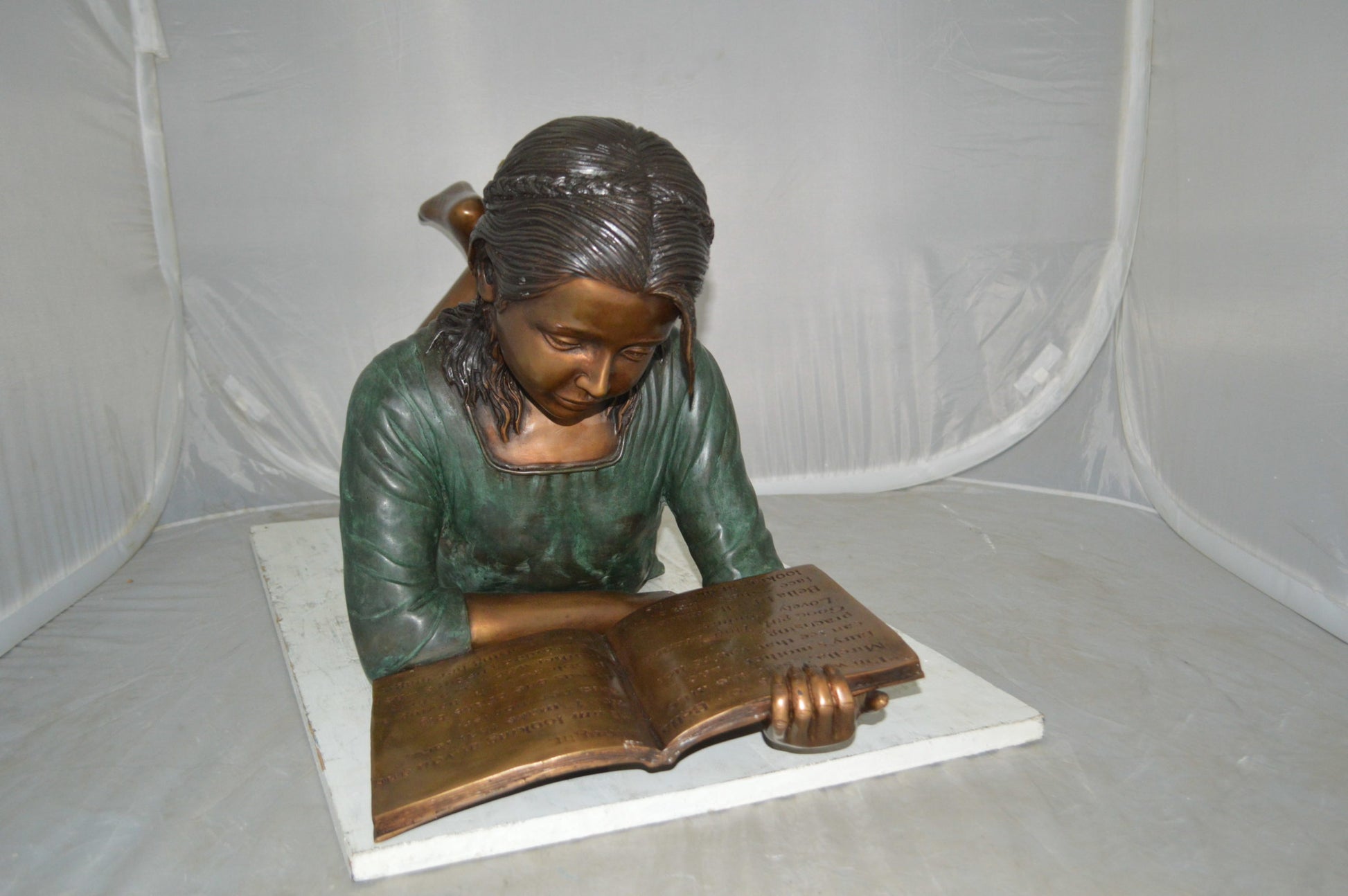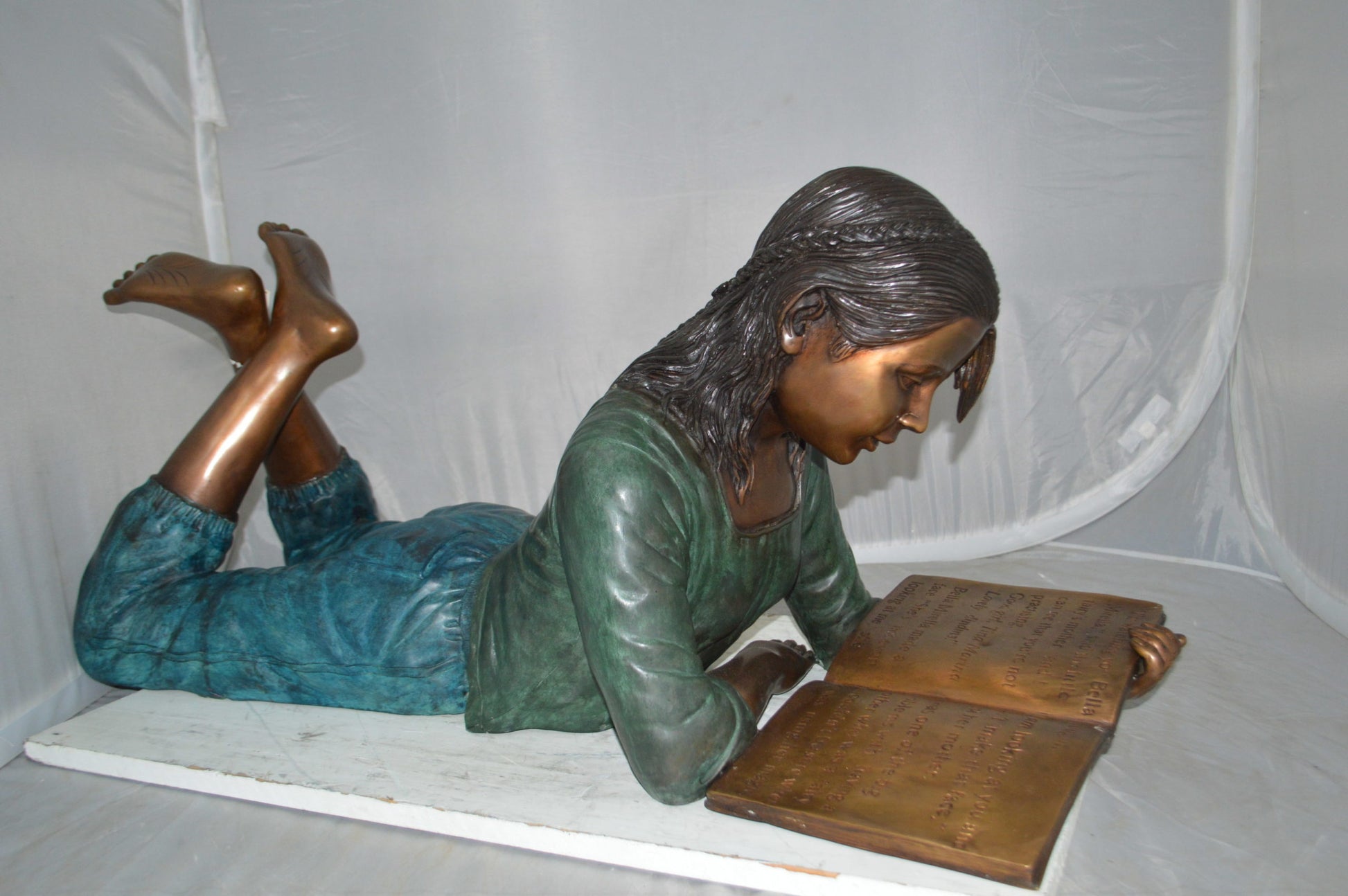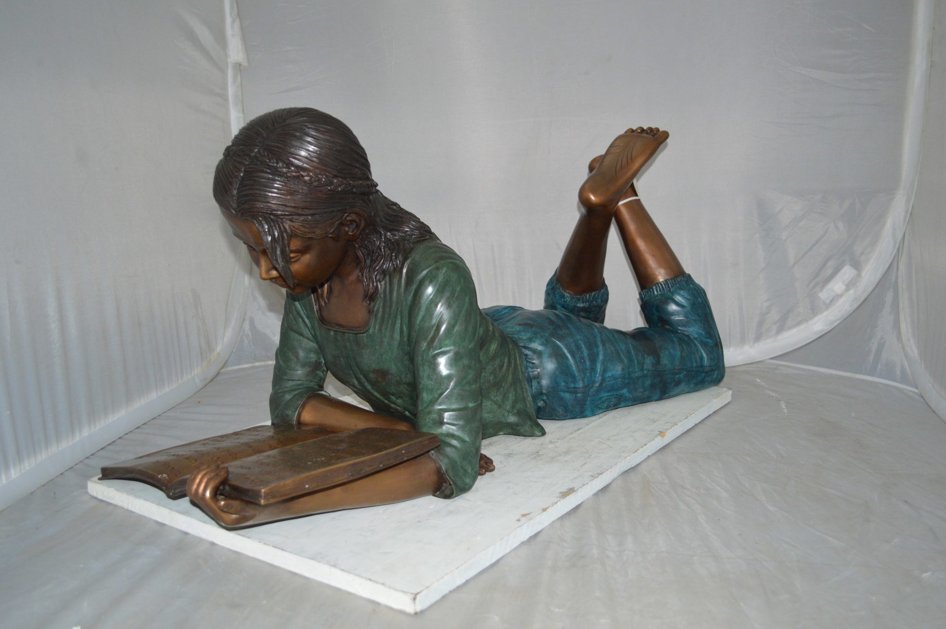 Magnificent large size bronze statue of a young girl laying down outside and reading a book. The joy of youth, lost in a book and putting thoughts to paper, will make your landscape come alive. The sculpture tones are finished in a lacquer patina on a heavy bronze base. This is a perfect addition to a home, and reminds us of the simple things in life. Size: 42"L x 18"W x 17"H. Weight is: 58Lb