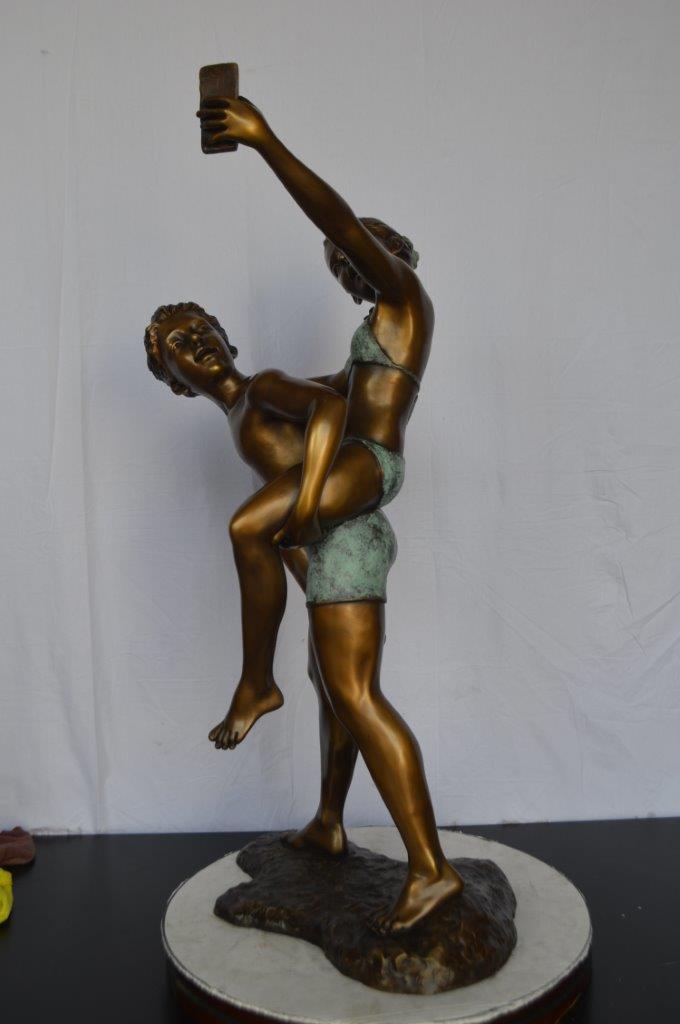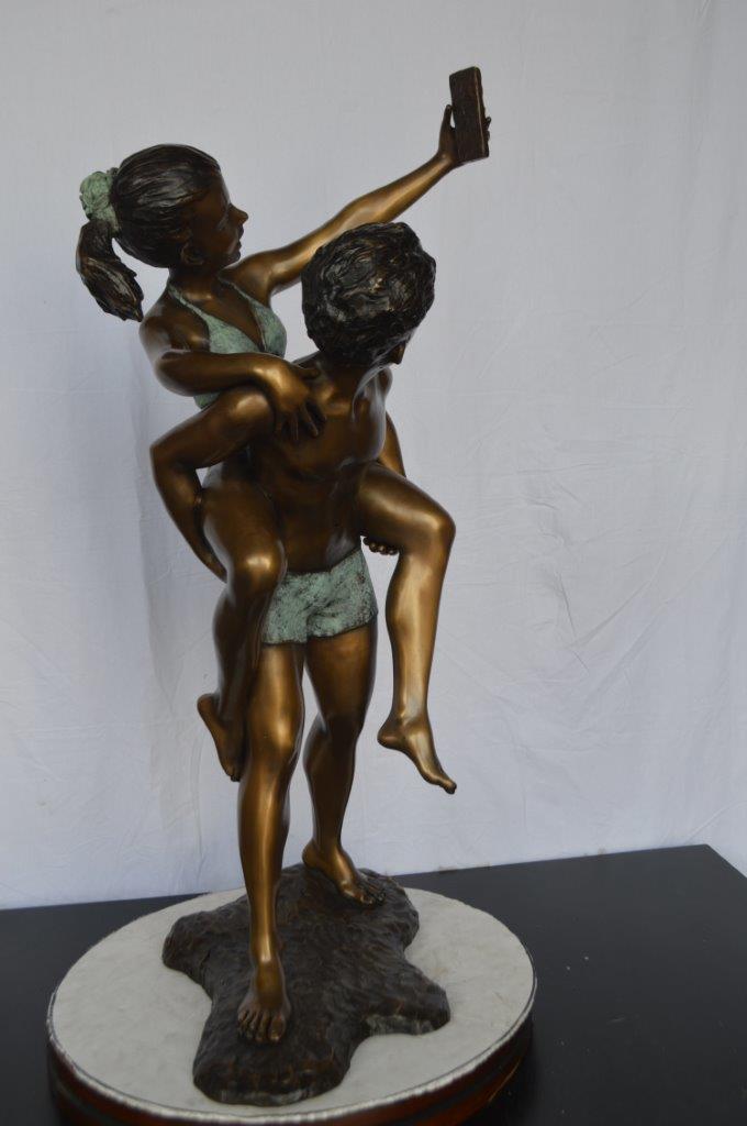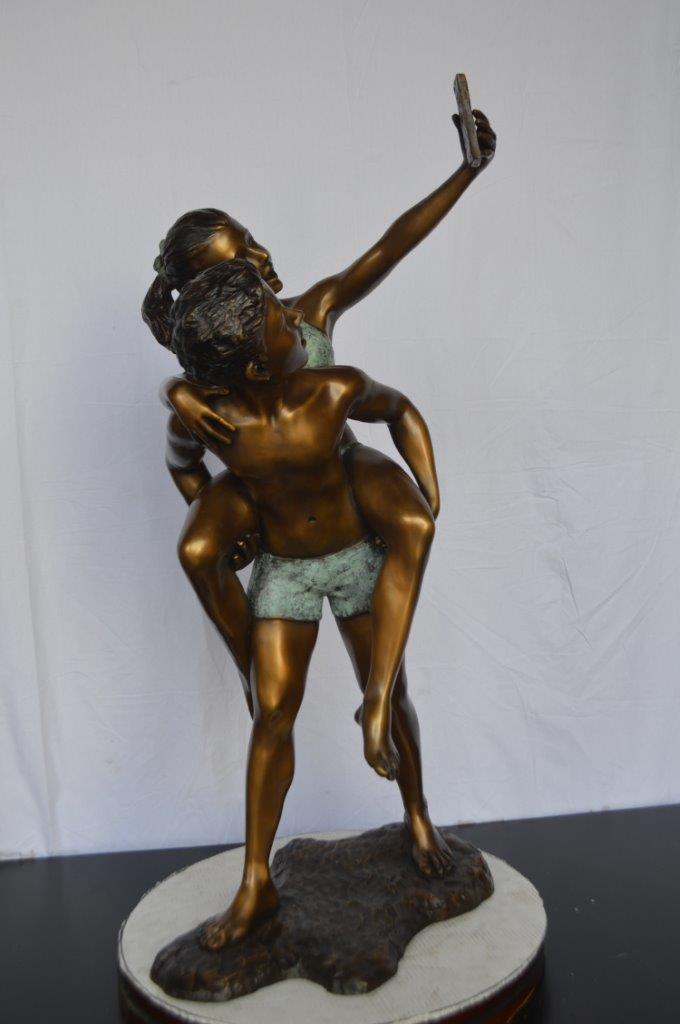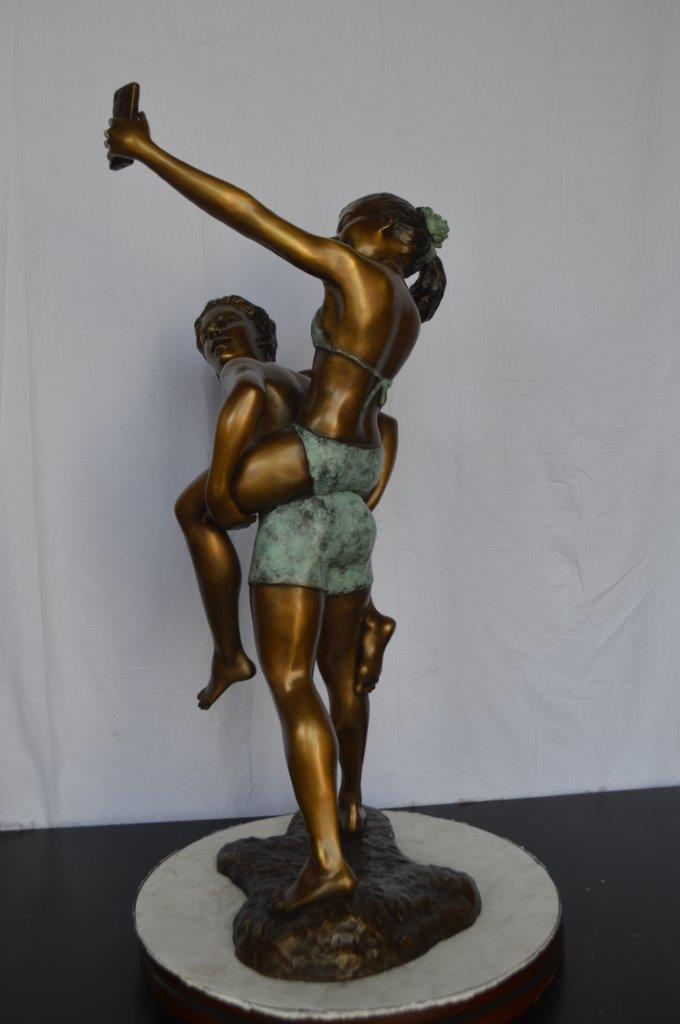 This is a very modern and humorous statue. The kids are taking a selfie picture with their smartphone. This large statue is sure to bring joy to your home. This is a beautiful bronze statue stained in green and brown patina with clear finish for preservation. This bronze statue is museum quality and hand-cast in high-quality pure bronze using the Lost Wax Process of bronze casting. Size: 23"L x 20"W x 43"H. Weight is: 53Lb