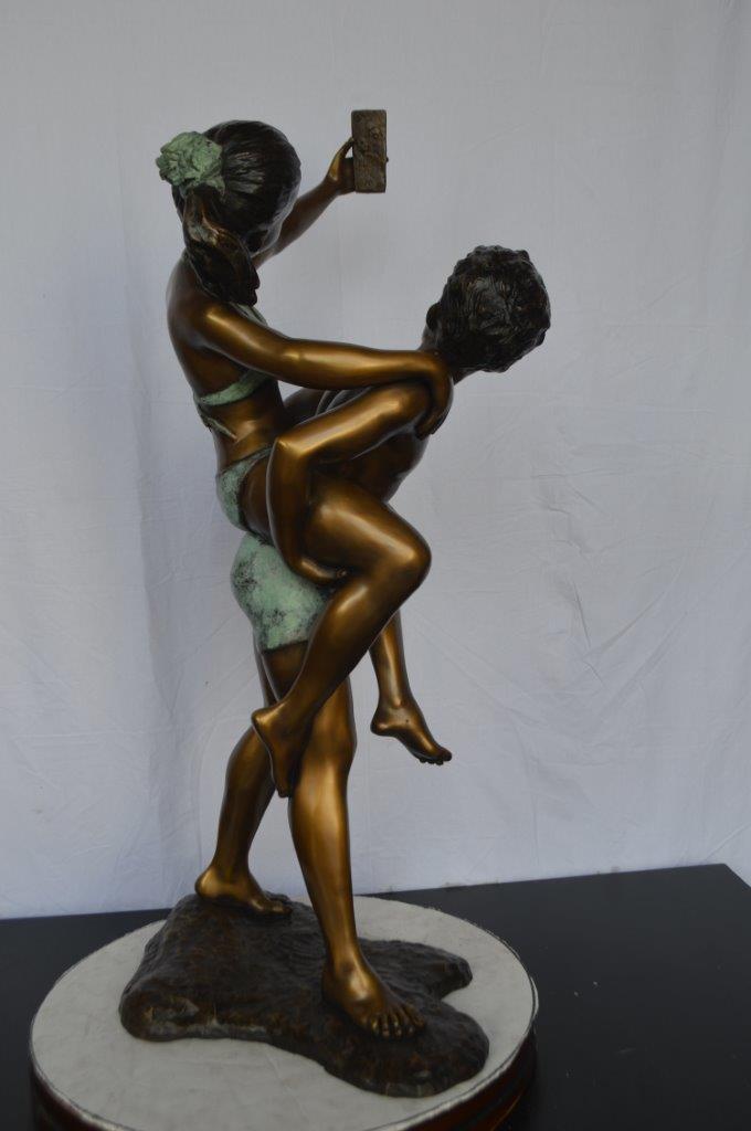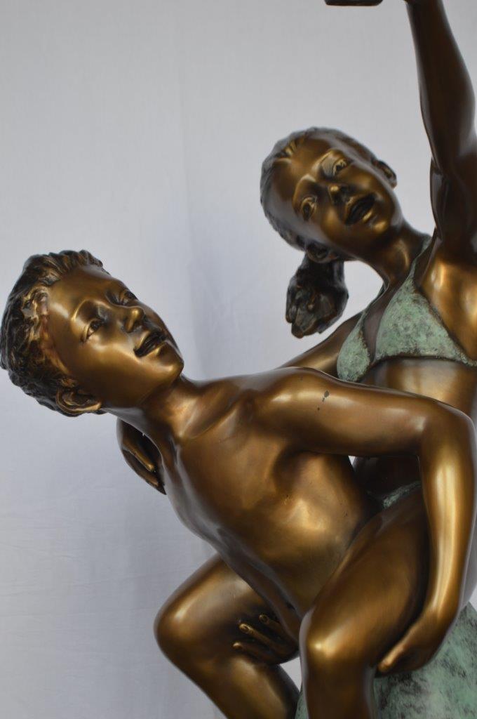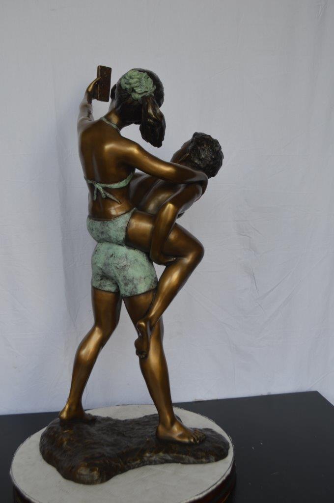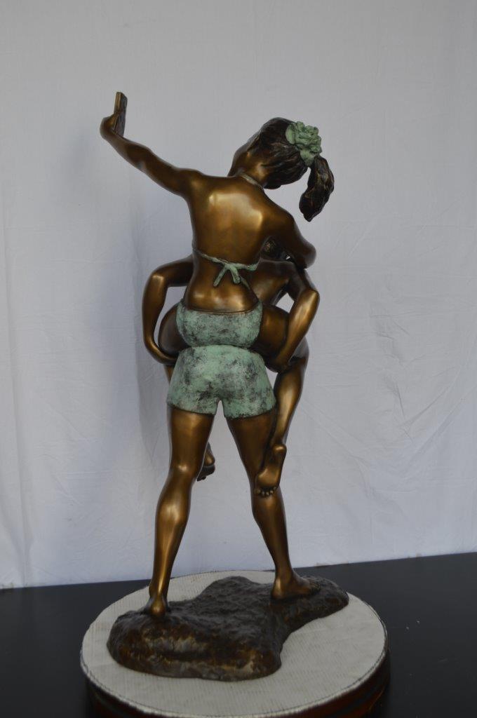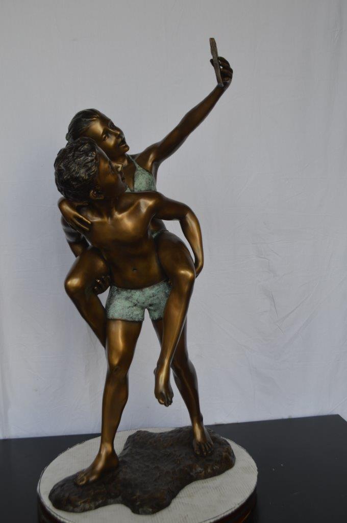 This is a very modern and humorous statue. The kids are taking a selfie picture with their smartphone. This large statue is sure to bring joy to your home. This is a beautiful bronze statue stained in green and brown patina with clear finish for preservation. This bronze statue is museum quality and hand-cast in high-quality pure bronze using the Lost Wax Process of bronze casting. Size: 23"L x 20"W x 43"H. Weight is: 53Lb