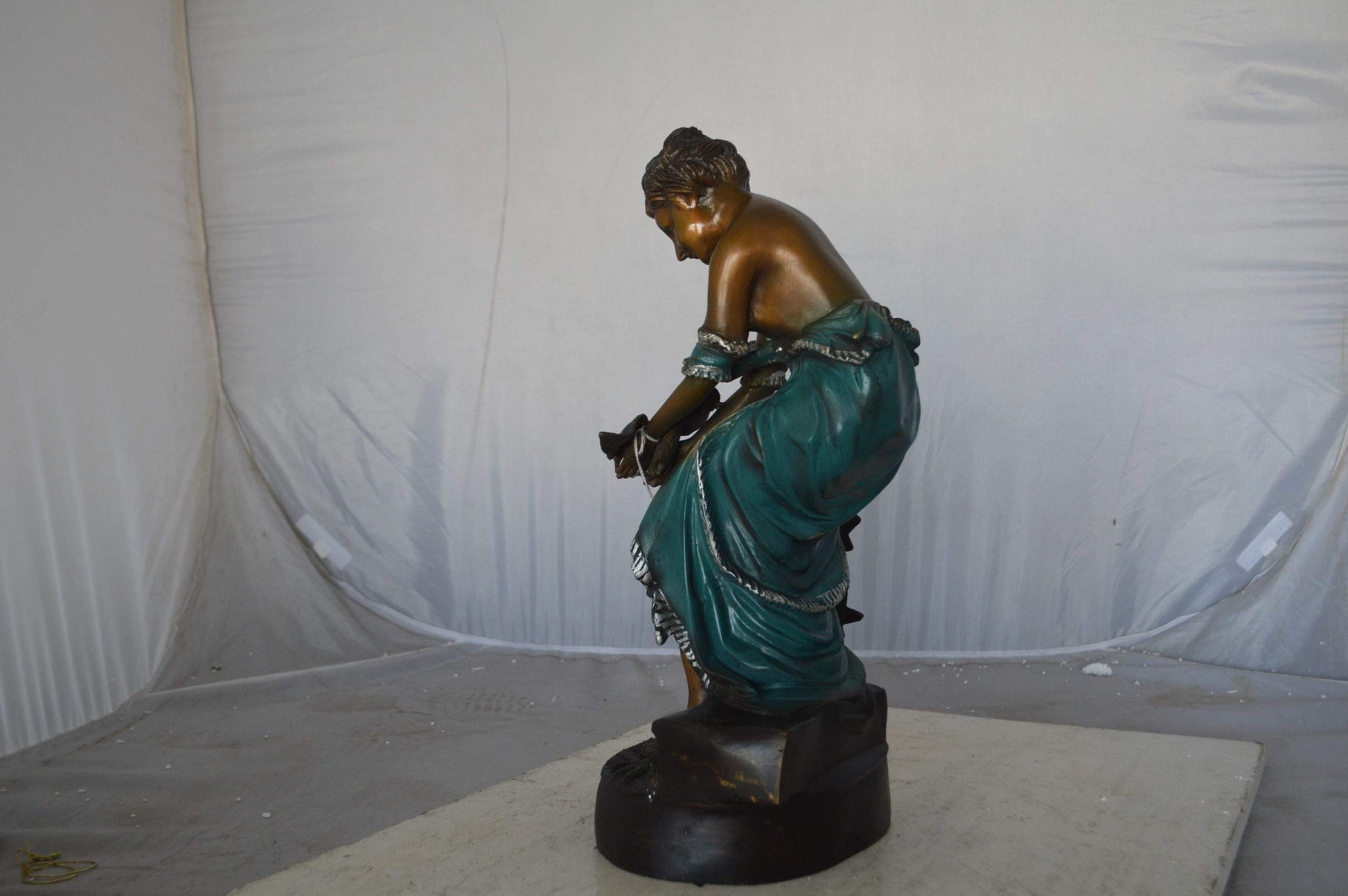 This half bare woman is a symbol of grace as she makes her way down a graceful forgotten path. The bronze statue uses enameling over bronze, to create the colored dress. The artist ensured detail through the presence of the flowers and design of her hair. Place this piece in any room to add grace and beauty. Size: 10"L x 9"W x 20"H. Weight is: 9Lb