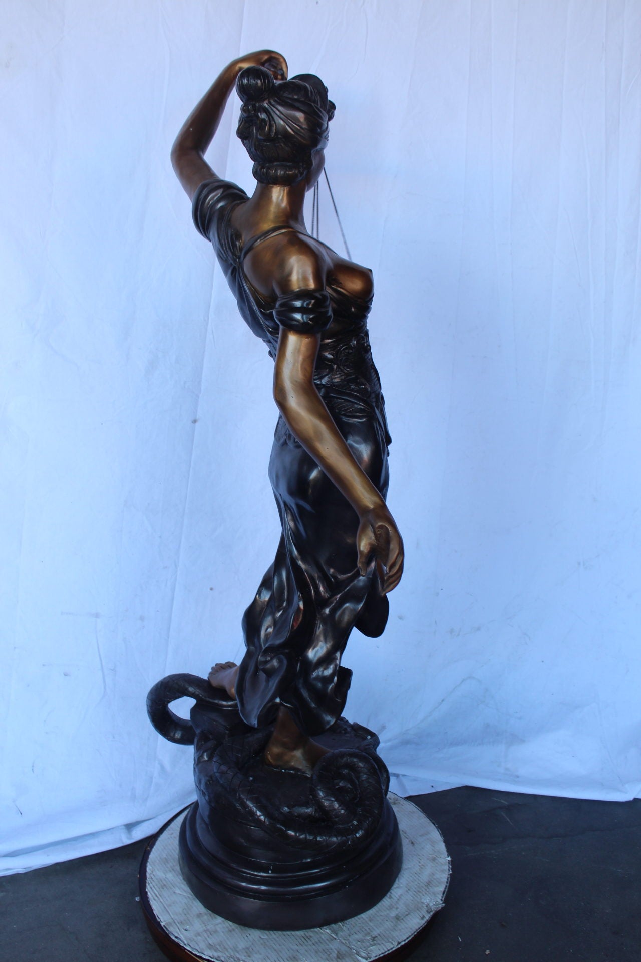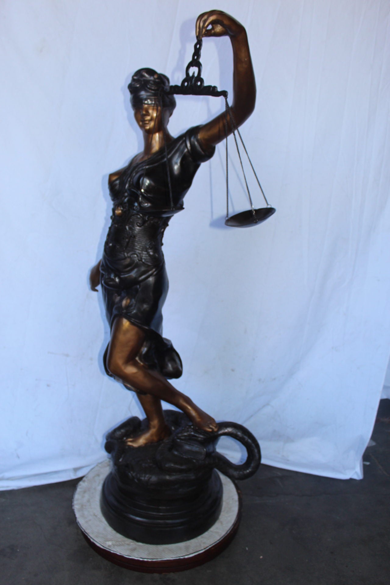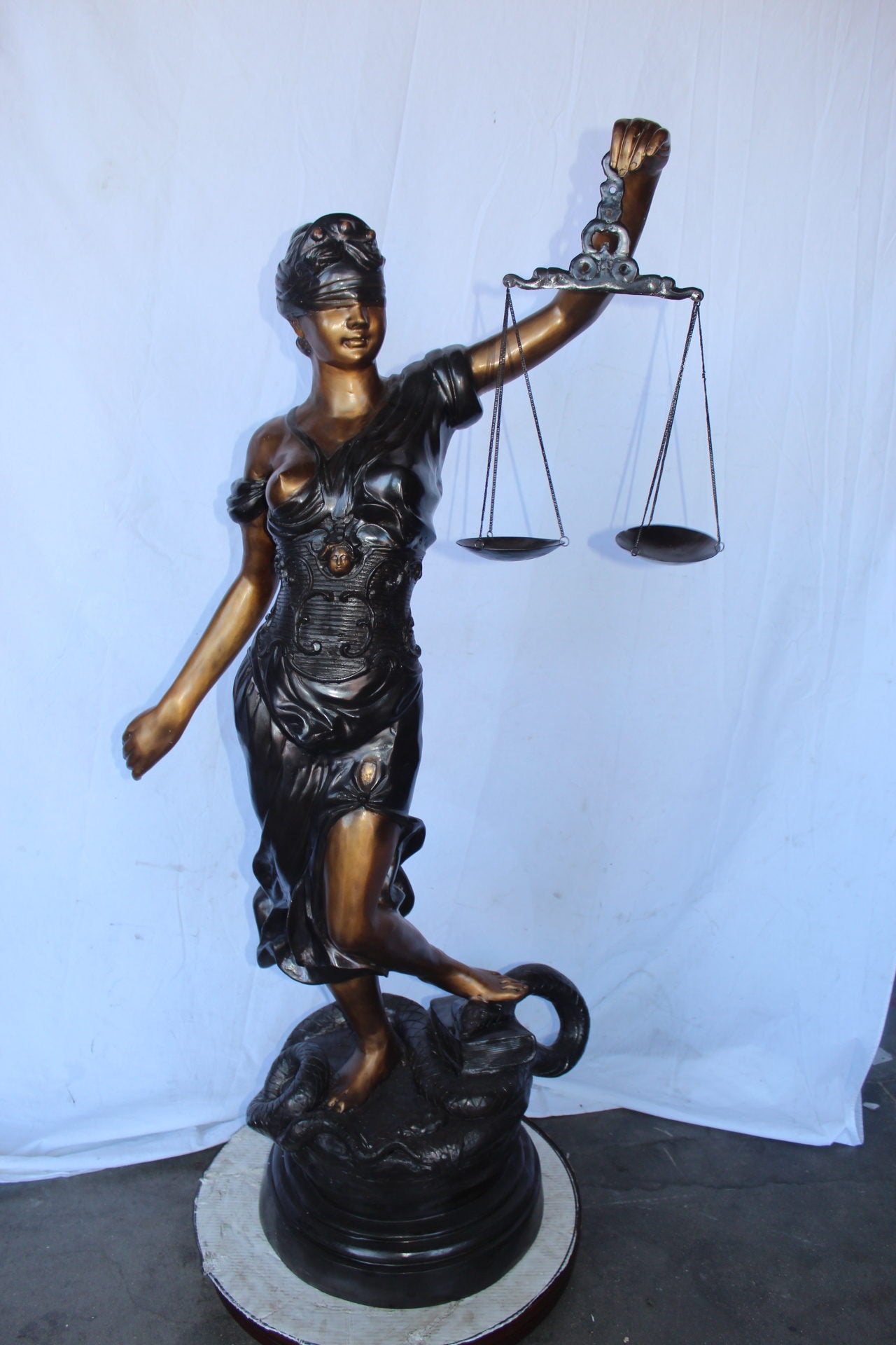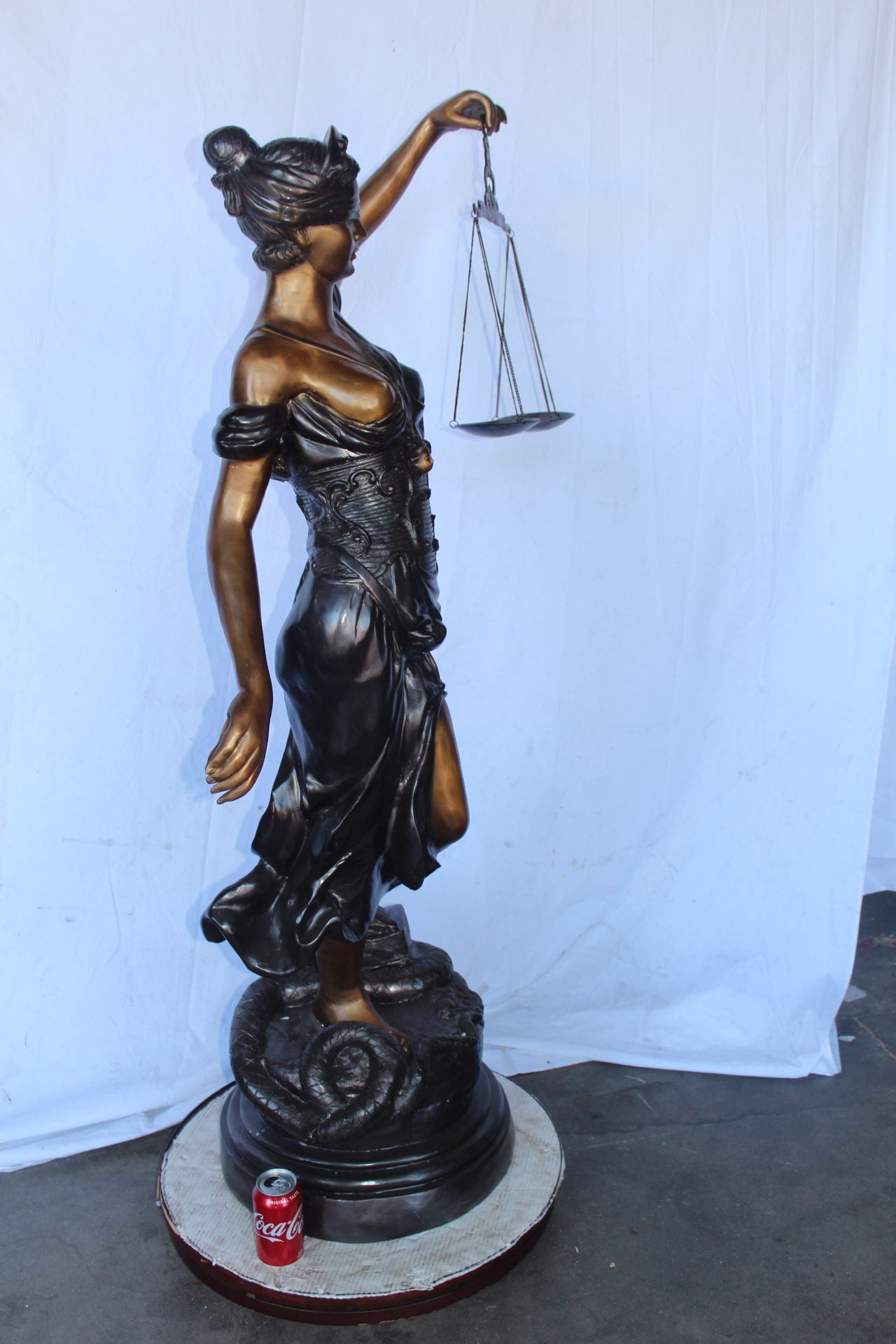 This unique bronze statue illustrates well known statue of Lady Justice in great detail. Wearing a beautifully designed dress, the woman holds a scale and has a historical mythical character to her. This large life-size statue would look specifically beautiful in a large living room or entry way. Size: "L x "W x "H. Weight is: Lb