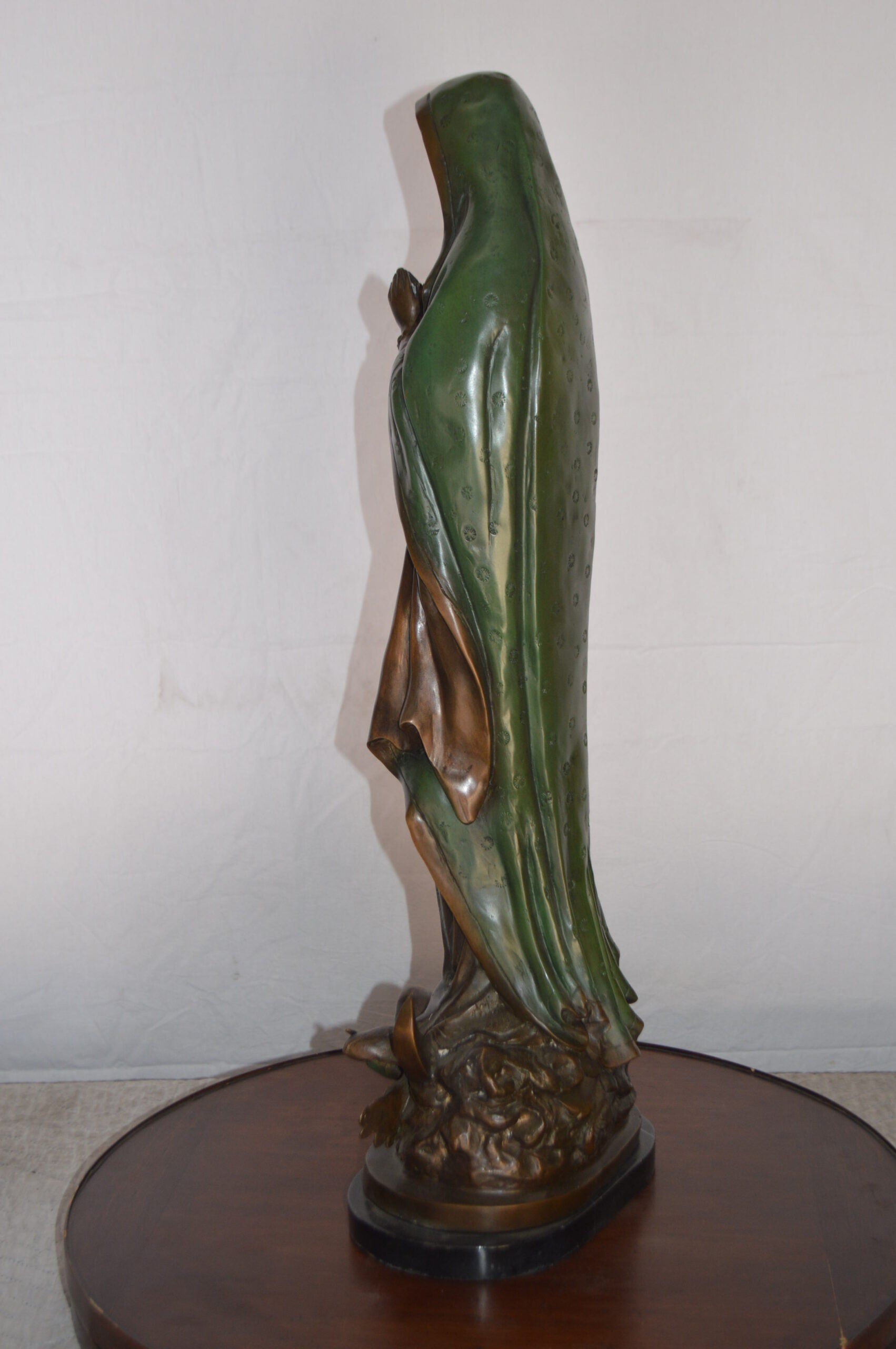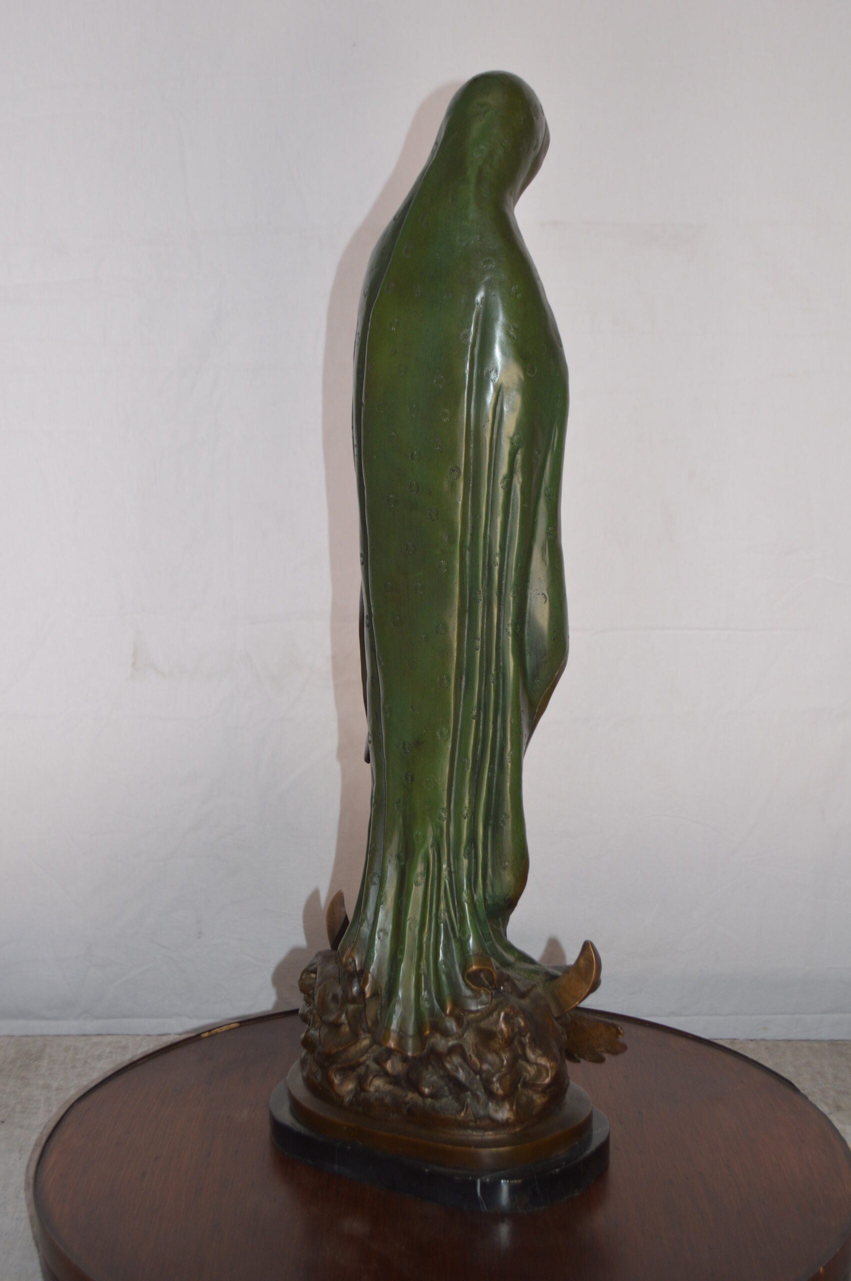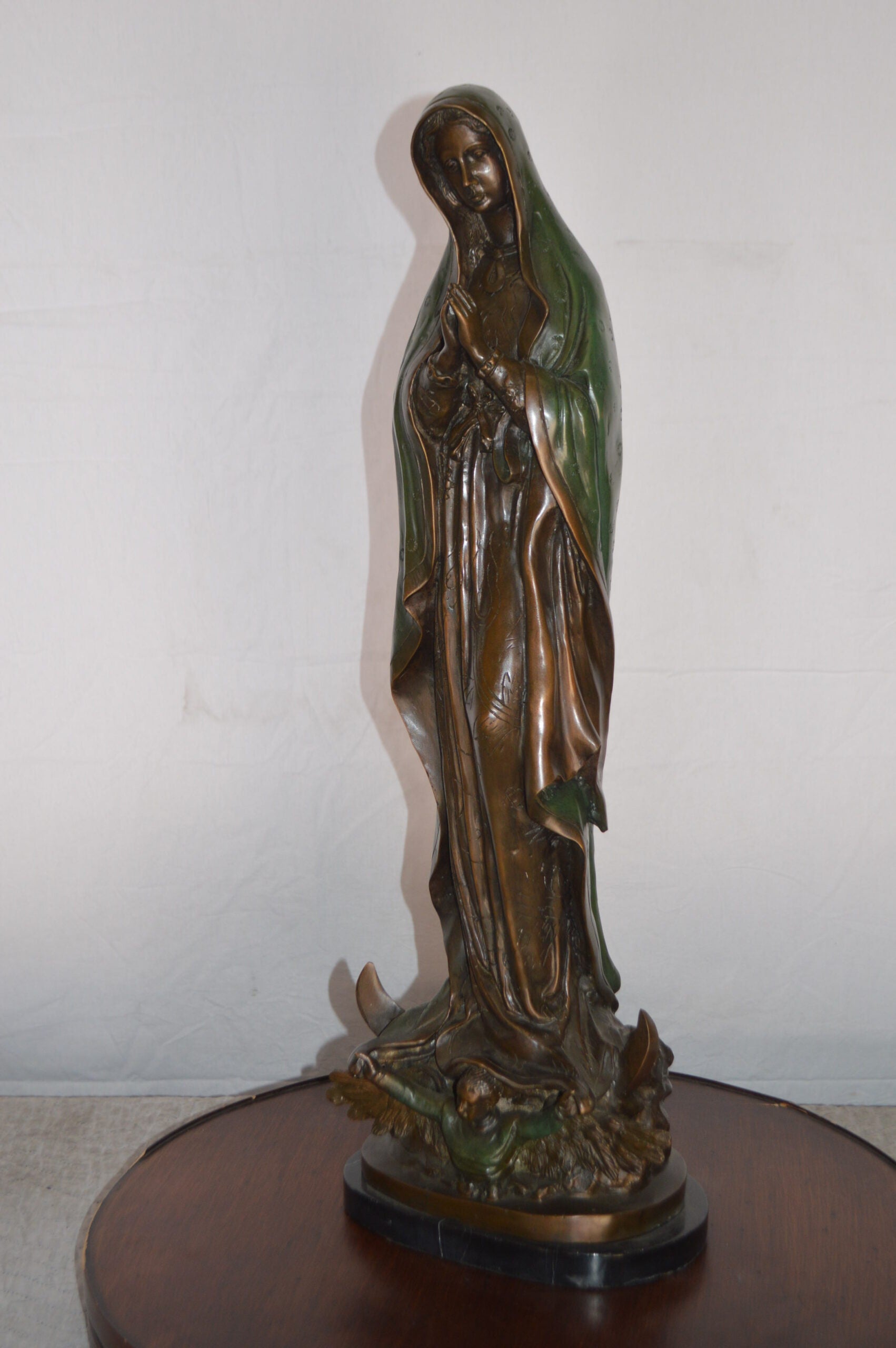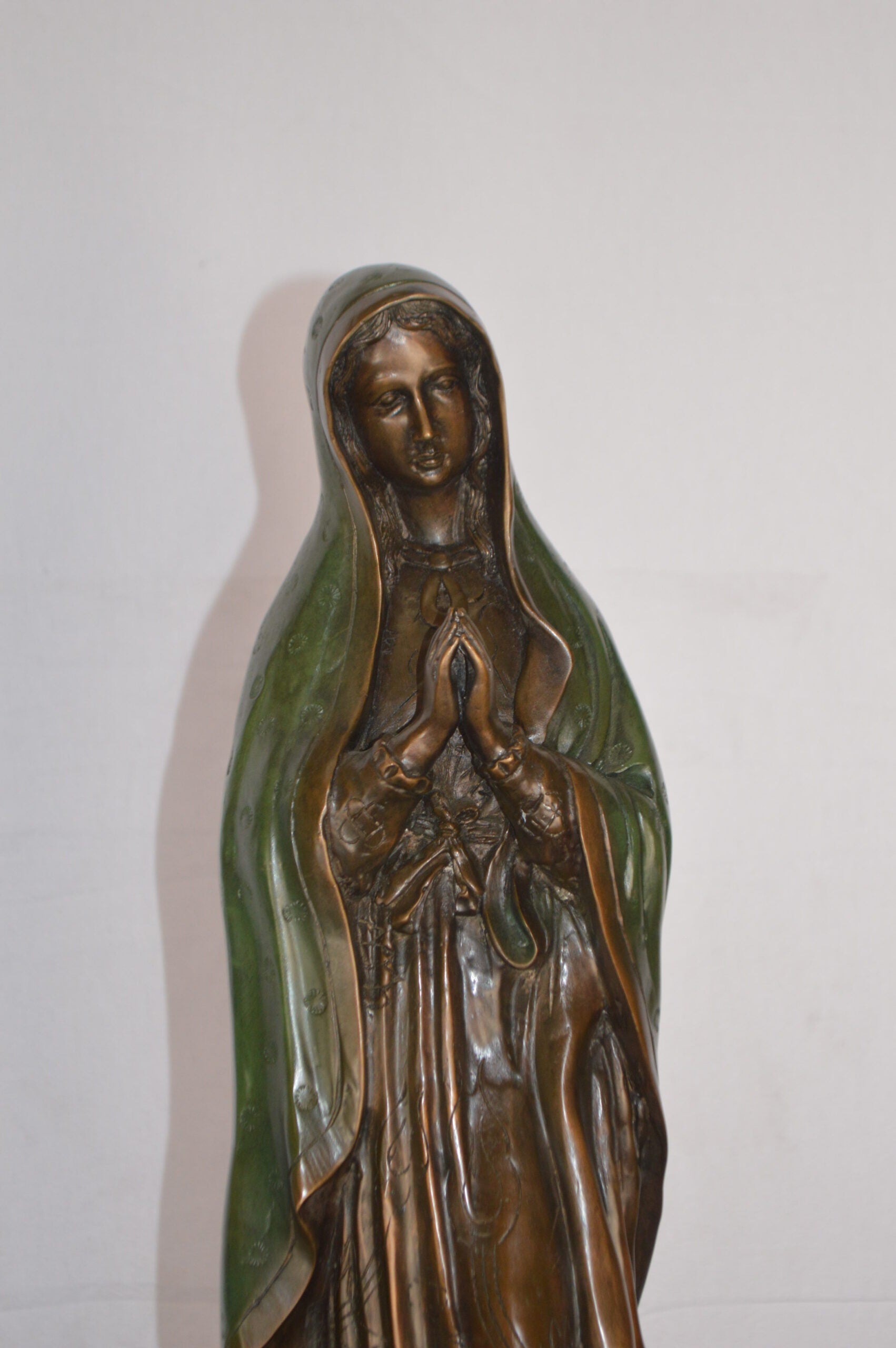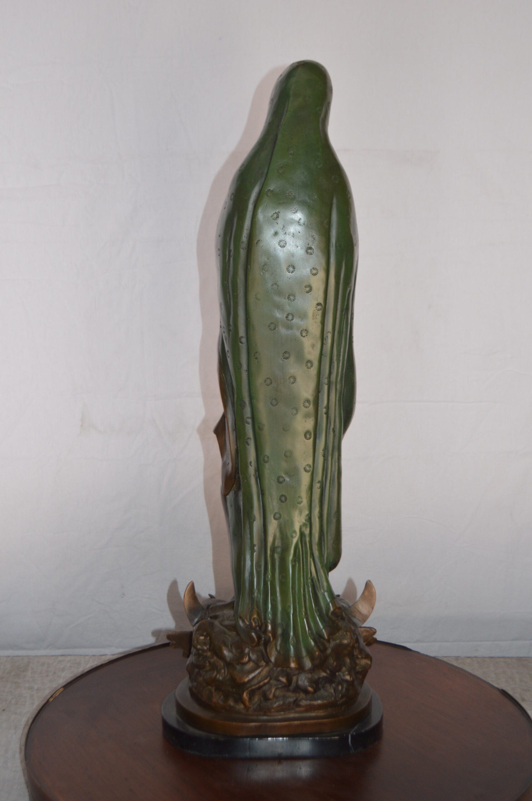 A beautiful bronze statue of Lady of Guadalupe on a Marble Base. This is a great piece of bronze work that details how intricate this type of art can be. The slightest strands are strong and capable of conveying great jollity. This is a beautiful bronze statue stained in green and brown patina with clear finish for preservation. This bronze statue is museum quality and hand-cast in high-quality pure bronze using the Lost Wax Process of bronze casting. Size: 10"L x 6"W x 31"H. Weight is: 31Lb