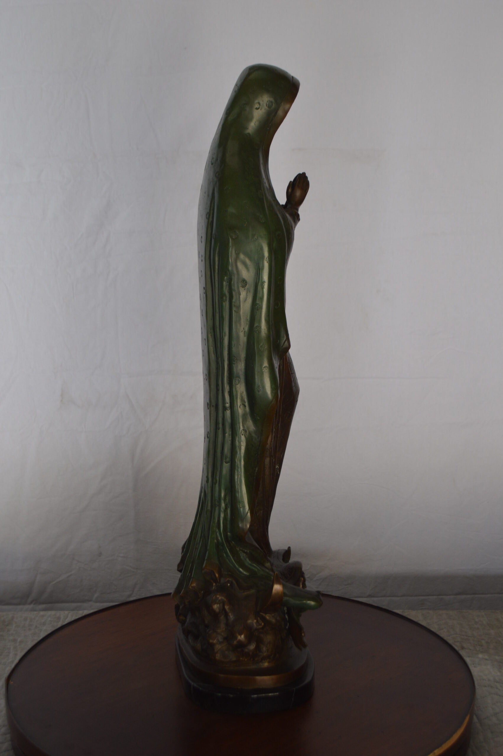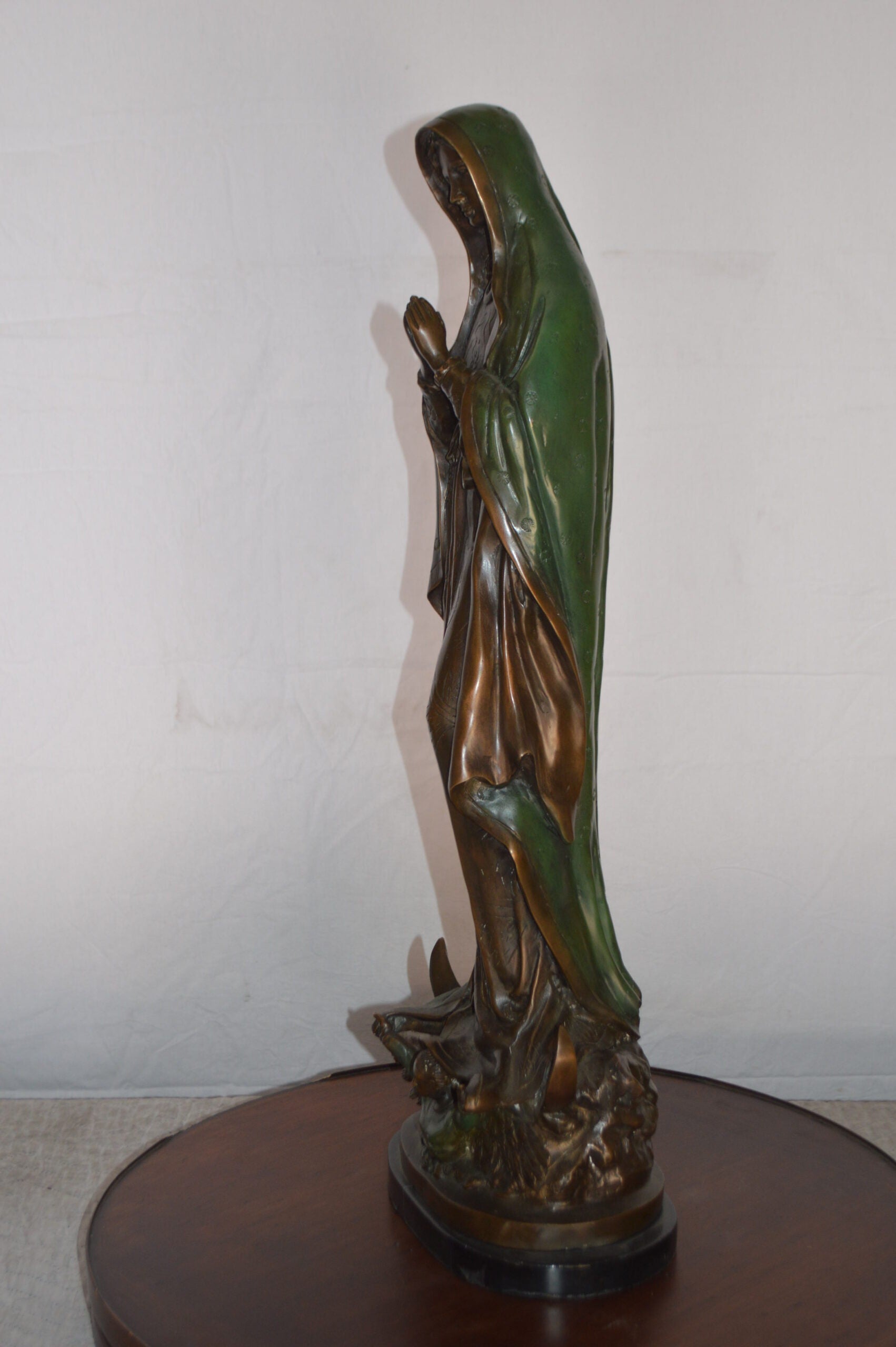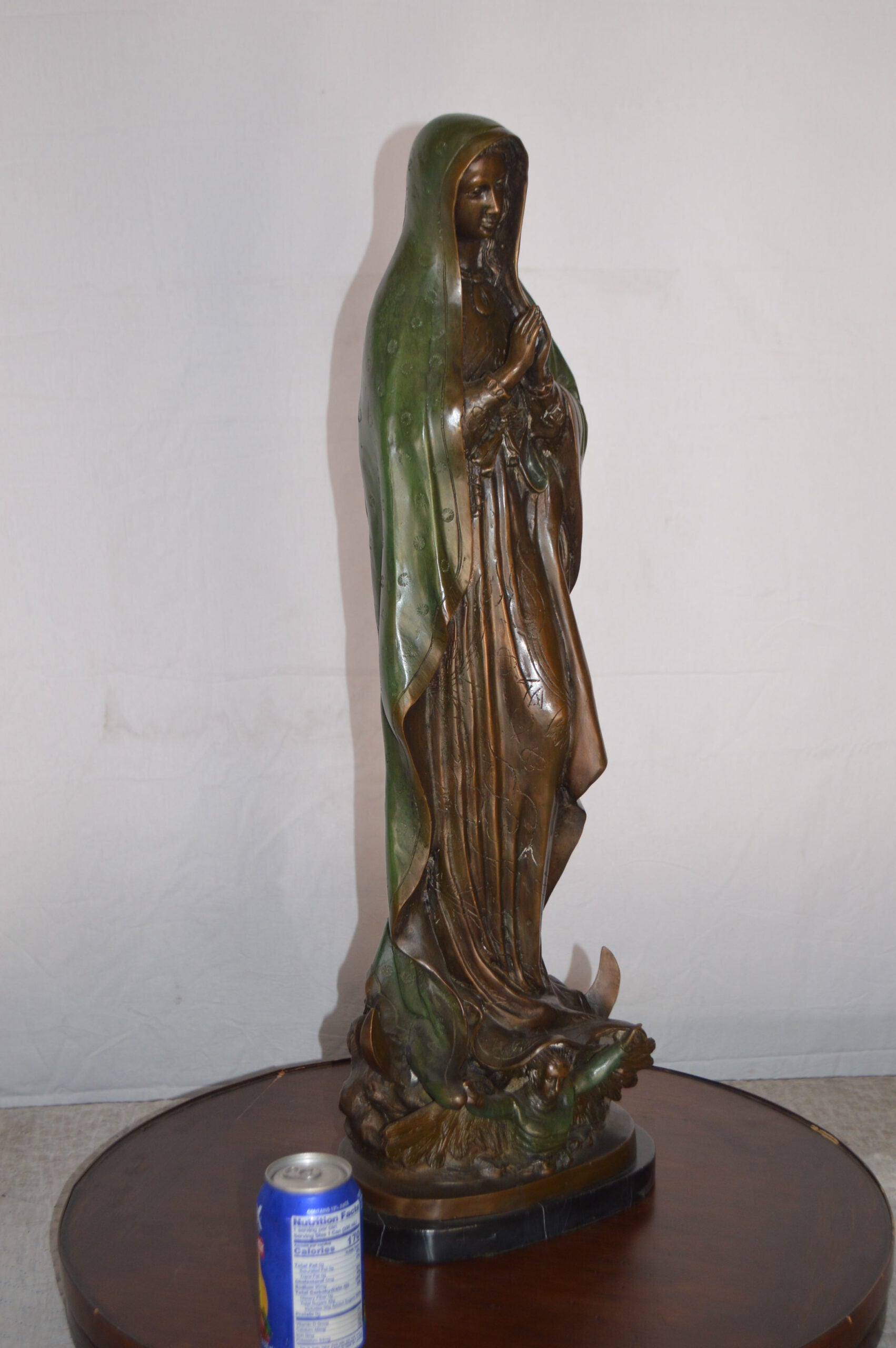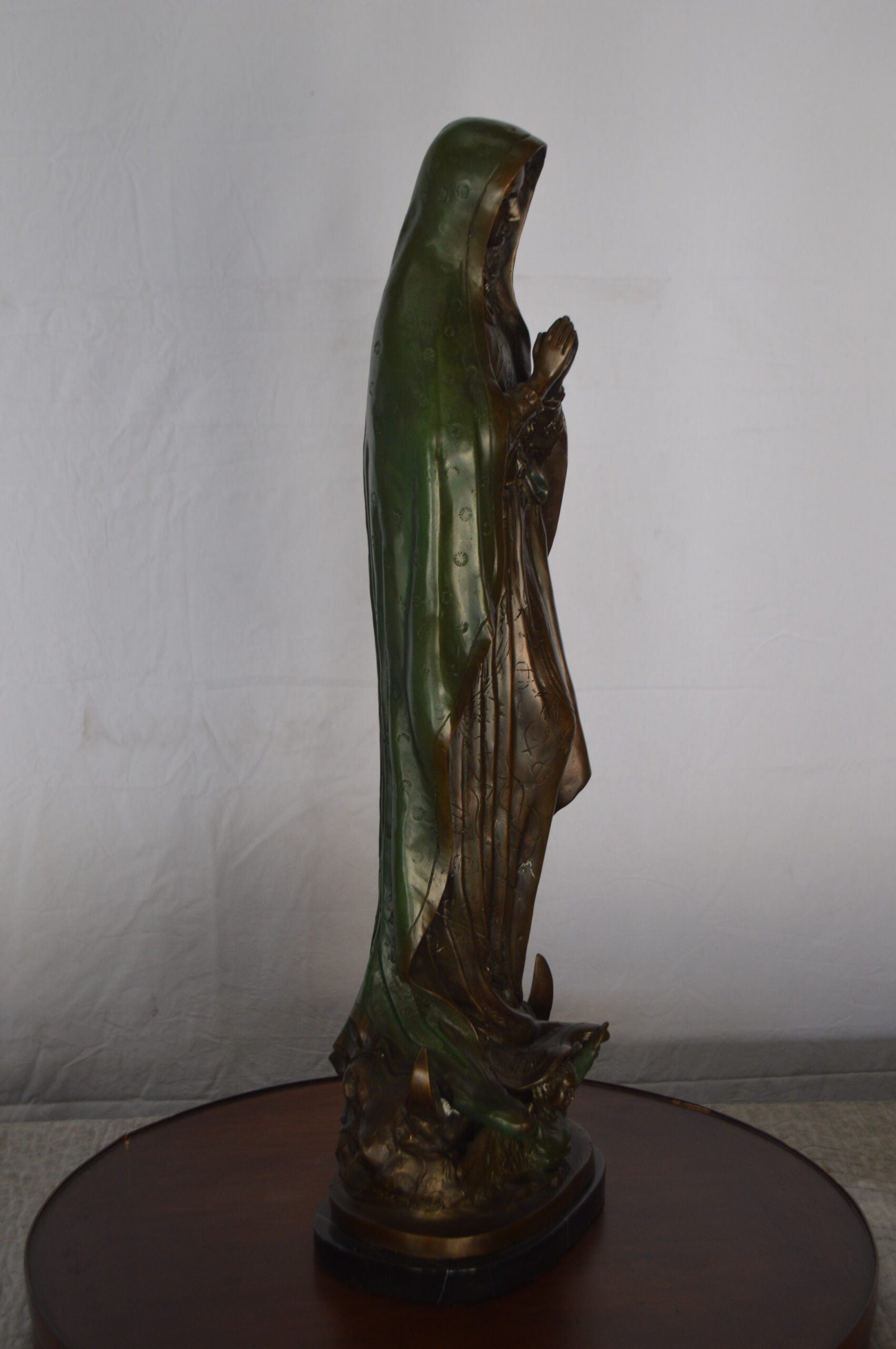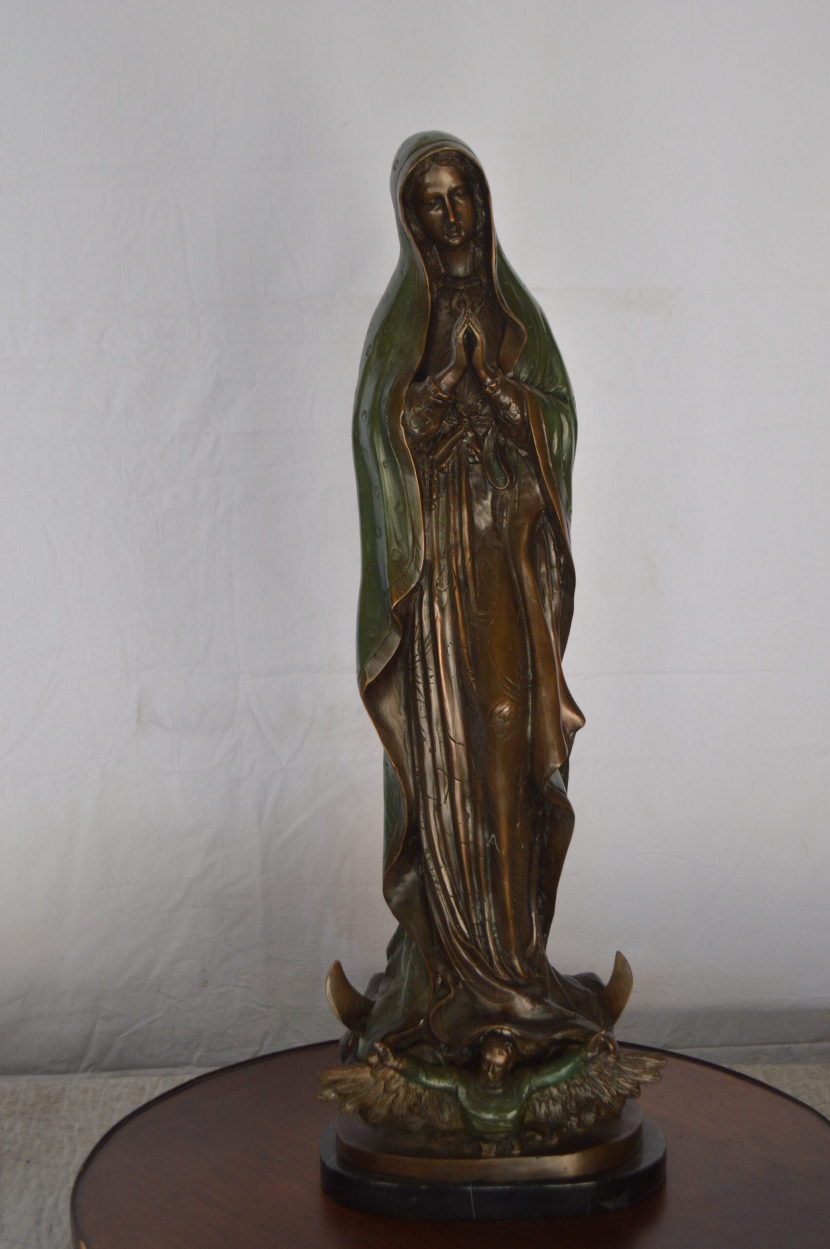 A beautiful bronze statue of Lady of Guadalupe on a Marble Base. This is a great piece of bronze work that details how intricate this type of art can be. The slightest strands are strong and capable of conveying great jollity. This is a beautiful bronze statue stained in green and brown patina with clear finish for preservation. This bronze statue is museum quality and hand-cast in high-quality pure bronze using the Lost Wax Process of bronze casting. Size: 10"L x 6"W x 31"H. Weight is: 31Lb