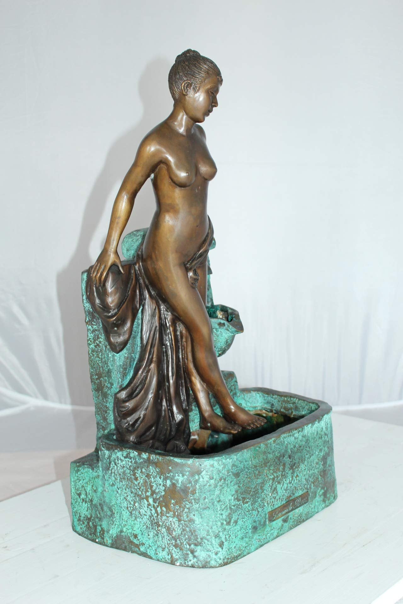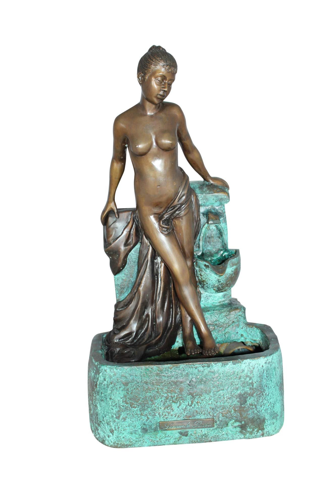 Sculpted beautiful naked Female standing over a water fountain bronze Sculpture. This sculpture is a finely crafted, highly detailed work of art. You will be very pleased with the quality of this amazing female sculpture. This bronze sculpture was cast using the lost Wax Method. This beautiful large bronze-cast statue will be a valuable addition to any area of the home, office, patio, or garden. Size: 12"L x 9"W x 21"H. Weight is: 40Lb