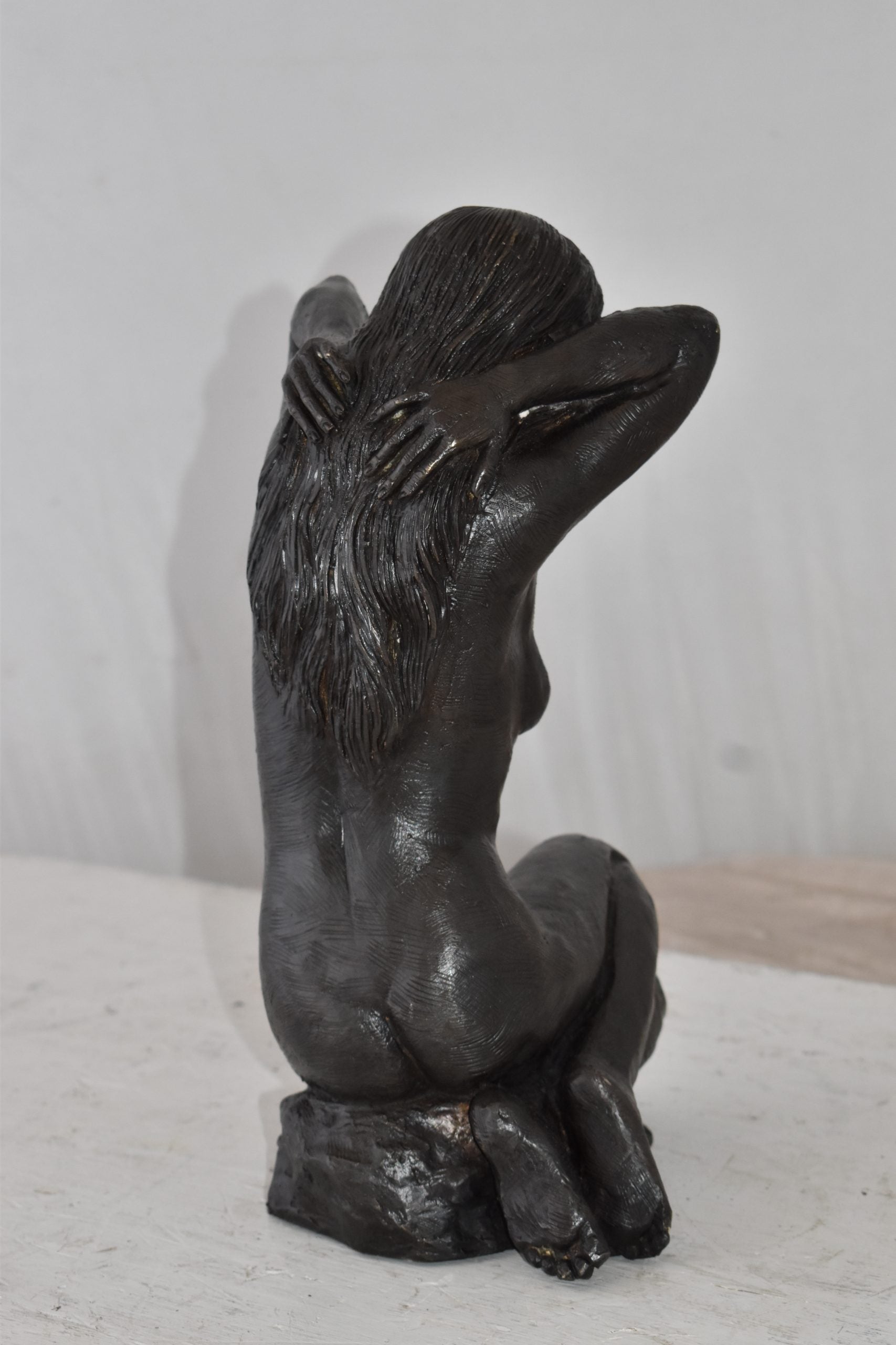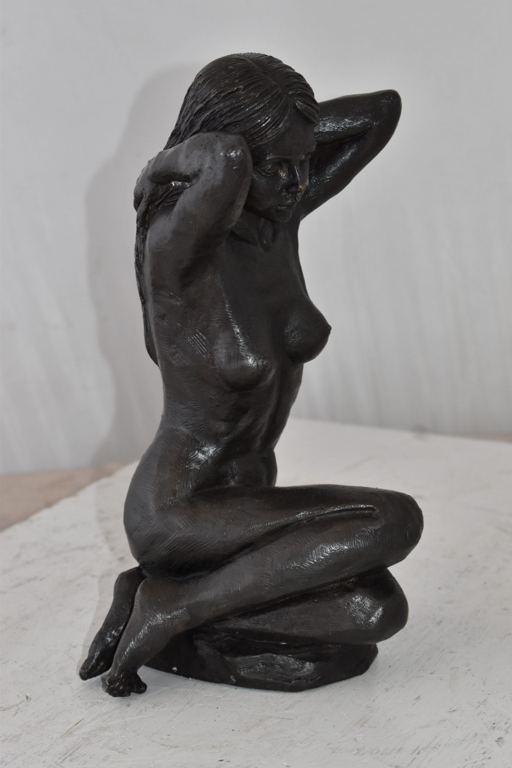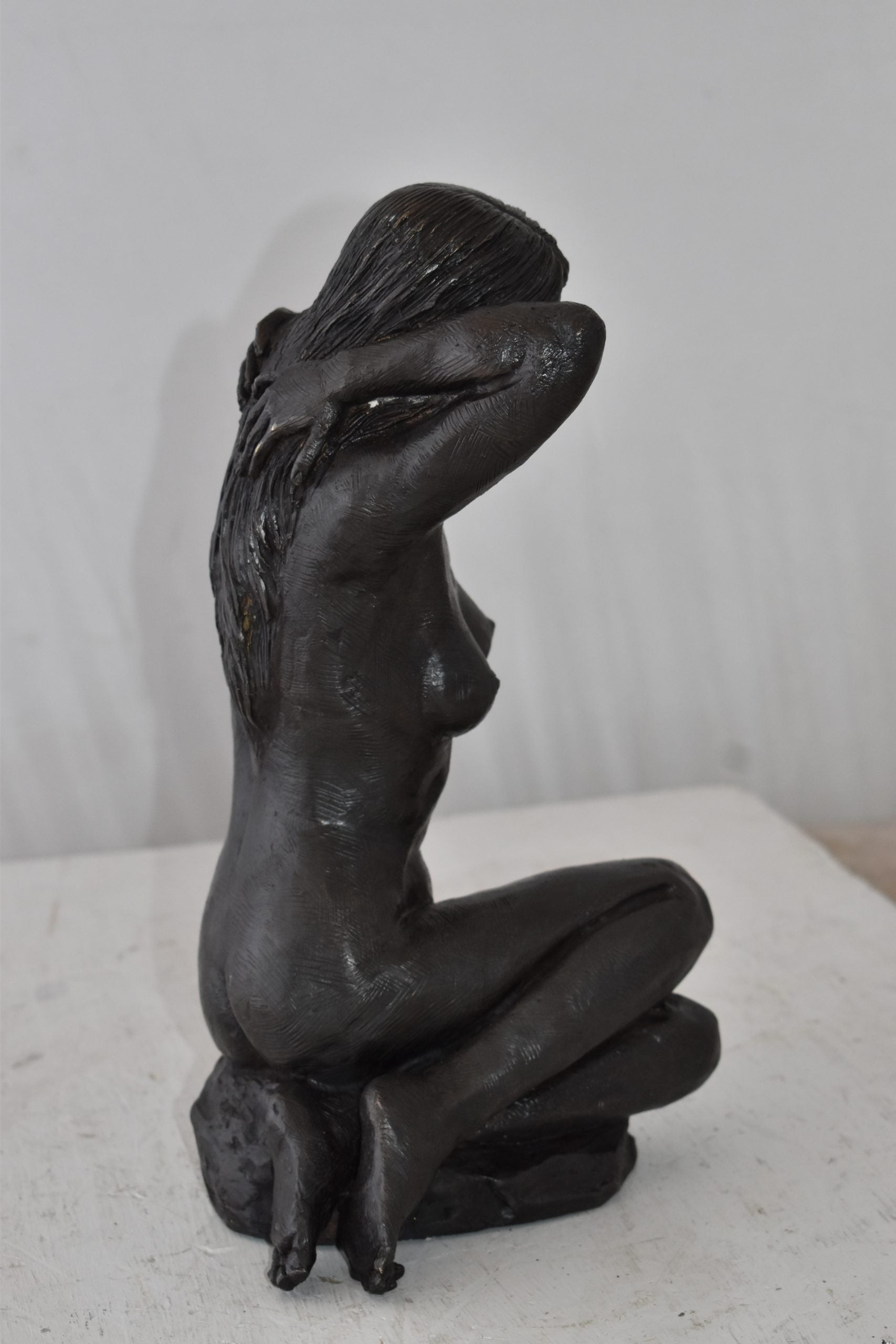 This charming bronze statue depicts Beautiful Young Lady sitting nude mounted on a bronze base. This very fine and unique abstract was casted using the ancient old Lost Wax Method with brown patina finish for preservation, handmade, from pure bronze. This beautiful bronze-cast statue will be a valuable addition to any area of the home, office, patio, or garden. Size: 7"L x 8"W x 13"H. Weight is: 8Lb