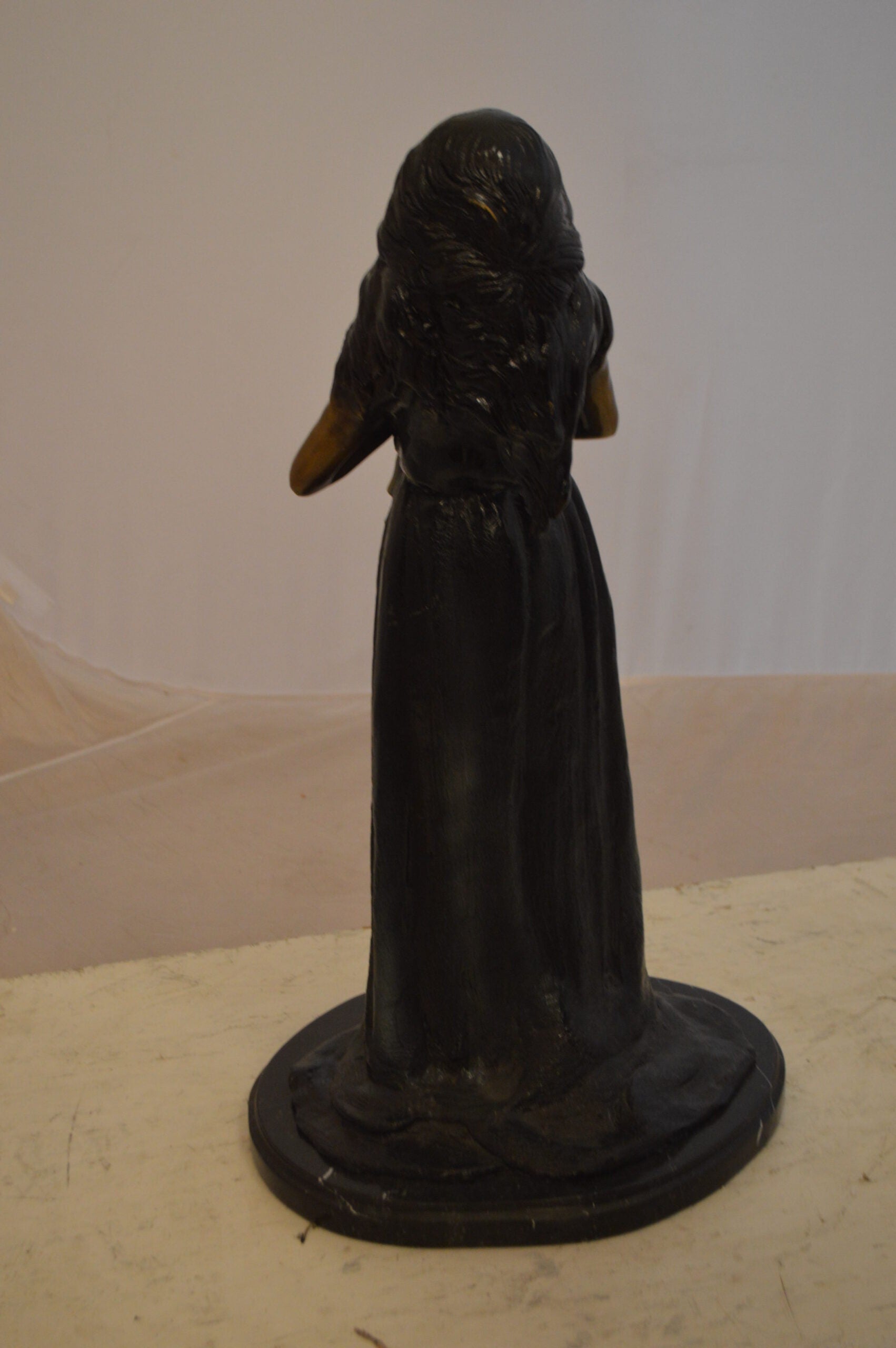 The beautiful musical girl thanking her audience after playing the violin Statue is a fantastical depiction of a young girl enjoying performing the sound of music. This is a great piece of bronze work that details how intricate this type of art can be. This reproduction bronze statue is museum quality hand-casted in high-quality bronze using the Lost Wax Process of bronze and patina casting. The patina chosen for this Timeless Creation is a mix of hand finishing with different colors and Polychrome techniques also referred to as enameling over bronze. This impressive Bronze Statue will be a permanent fixture on the grounds of your estate for years to come. Size: 11"L x 8"W x 23"H. Weight is: 25Lb