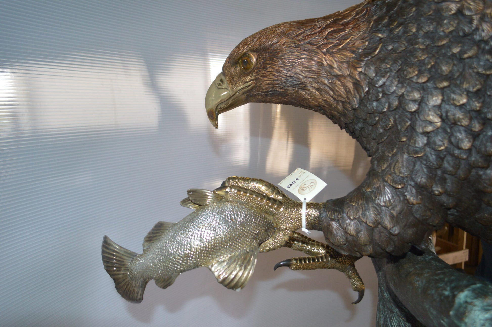 A giant eagle made of bronzed metal landing on a tree. This extraordinary sculpture features a realistic tree trunk that supports the eagle in life-size detail. The eagle is shown with marvelous detail to the feathers, beaks and eyes each with a unique expression and pose. This very fine and unique abstract was casted using the ancient old Lost Wax Method with brown patina finish for preservation. Handmade using pure bronze. This impressive Bronze Statue will be a permanent fixture on the grounds of your estate for years to come. Size: 72"L x 36"W x 88"H. Weight is: 220Lb
