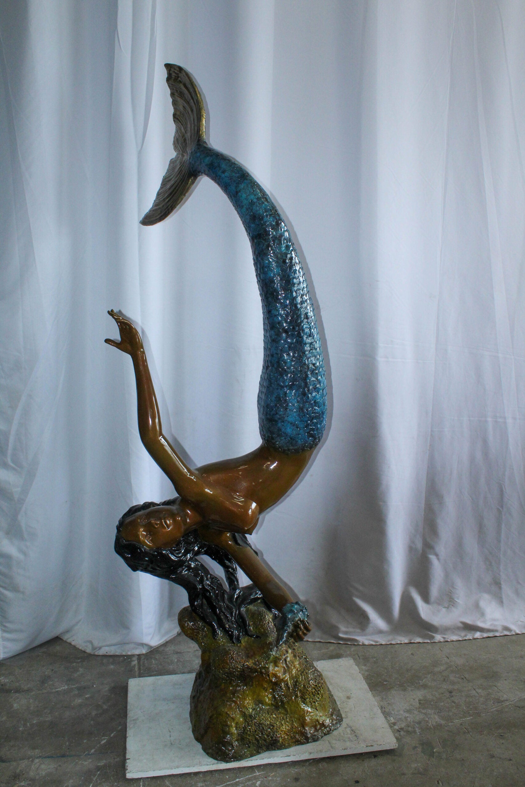 Magnificent 85-inch tall bronze mermaid fountain statue with an upside down pose, flowing hair, and blue tail. Crafted using the lost wax method for fine detail. Ideal for garden or patio decor. Functions as a water fountain with graceful movement. Pump not included. A hand-finished piece that brings elegance to any space. Size: 37"L x 30"W x 85"H. Weight: 112Lb