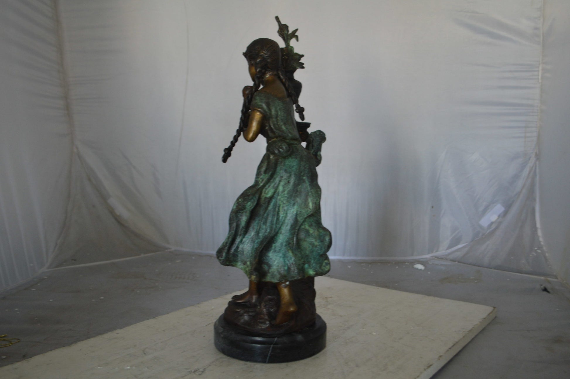 The beautiful sculpture is a fantastical depiction of a young Girl casually walking by the park fastened by the view in front of her. Her simple cloths is slightly exposing her body. This is a great piece (also known as Les Amenes) of bronze work that details how intricate this type of art can be. This reproduction bronze statue is museum quality and hand-cast in high-quality bronze using the Lost Wax Process of bronze casting and cold painting process. Size: 9"L x 8"W x 27"H. Weight is: 10Lb