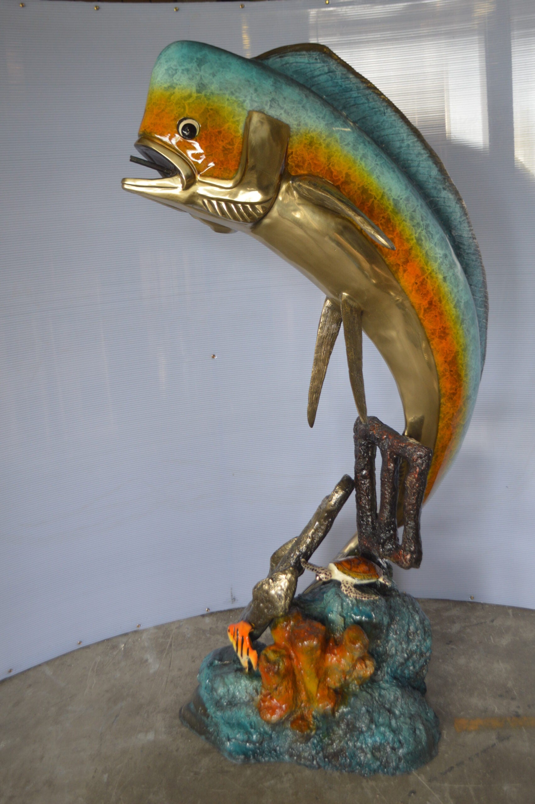 A beautiful very large Mahi Mahi fish swimming in the ocean standing sculpture/fountain with turtle and fish. Featuring in a natural form a big game fish. Water sprays out from its mouth with the use of a fountain pump (pump not included). A timeless Creation in lost wax cast bronze with the most beautiful gallery quality finishing. The patina chosen for this Timeless Creation is a mix of hand finishing with different colors and Polychrome techniques also referred to as enameling over bronze. Size: 30"L x 32"W x 69"H. Weight is: 180Lb