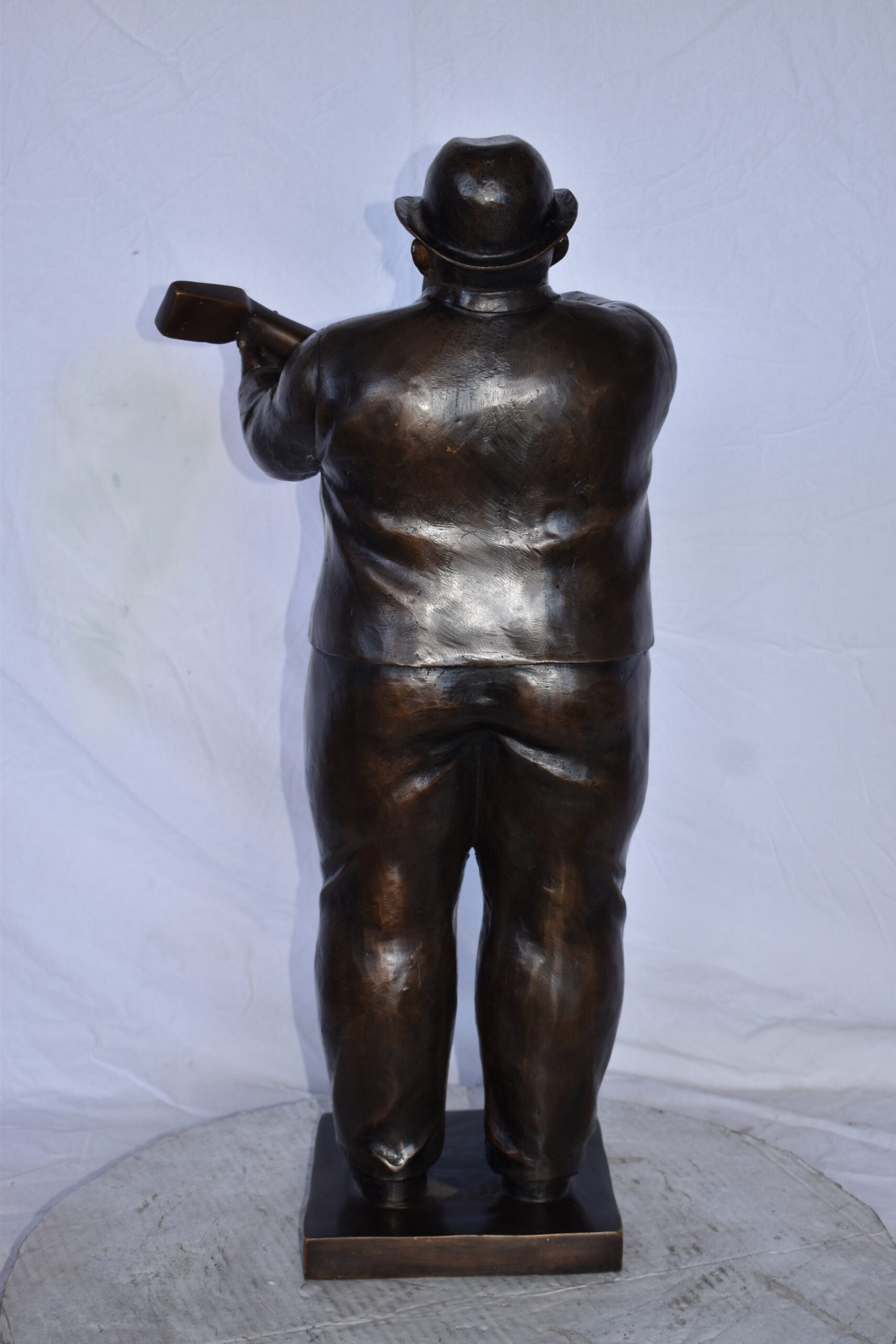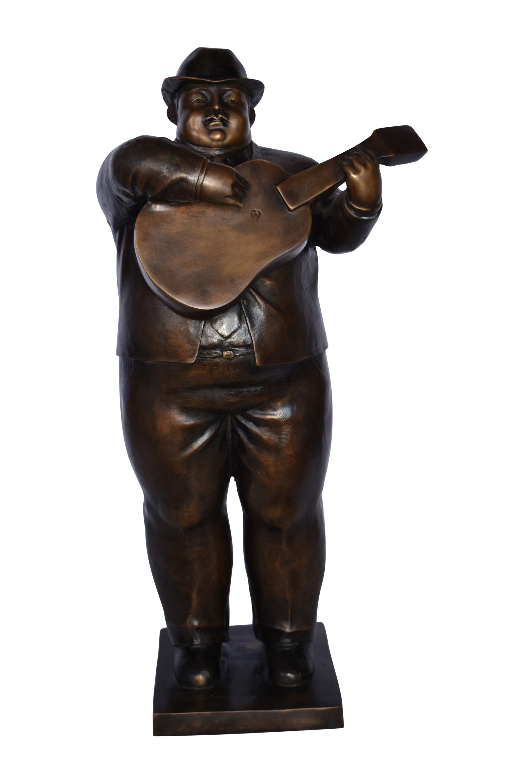 This proportionally exaggerated bronze sculpture is characteristic of Fernando Botero abstract and representational style. The fat man is playing the Guitar. The artist dramatic emphasis on shape and volume creates a great attraction and tangibility to form. The sculpture was molded using the lost-wax casting method and finished with brown patina. This is an exquisite three-dimensional work of art for anyone who is F. Botero enthusiast. Size: 14"L x 11"W x 30"H. Weight is: 48Lb