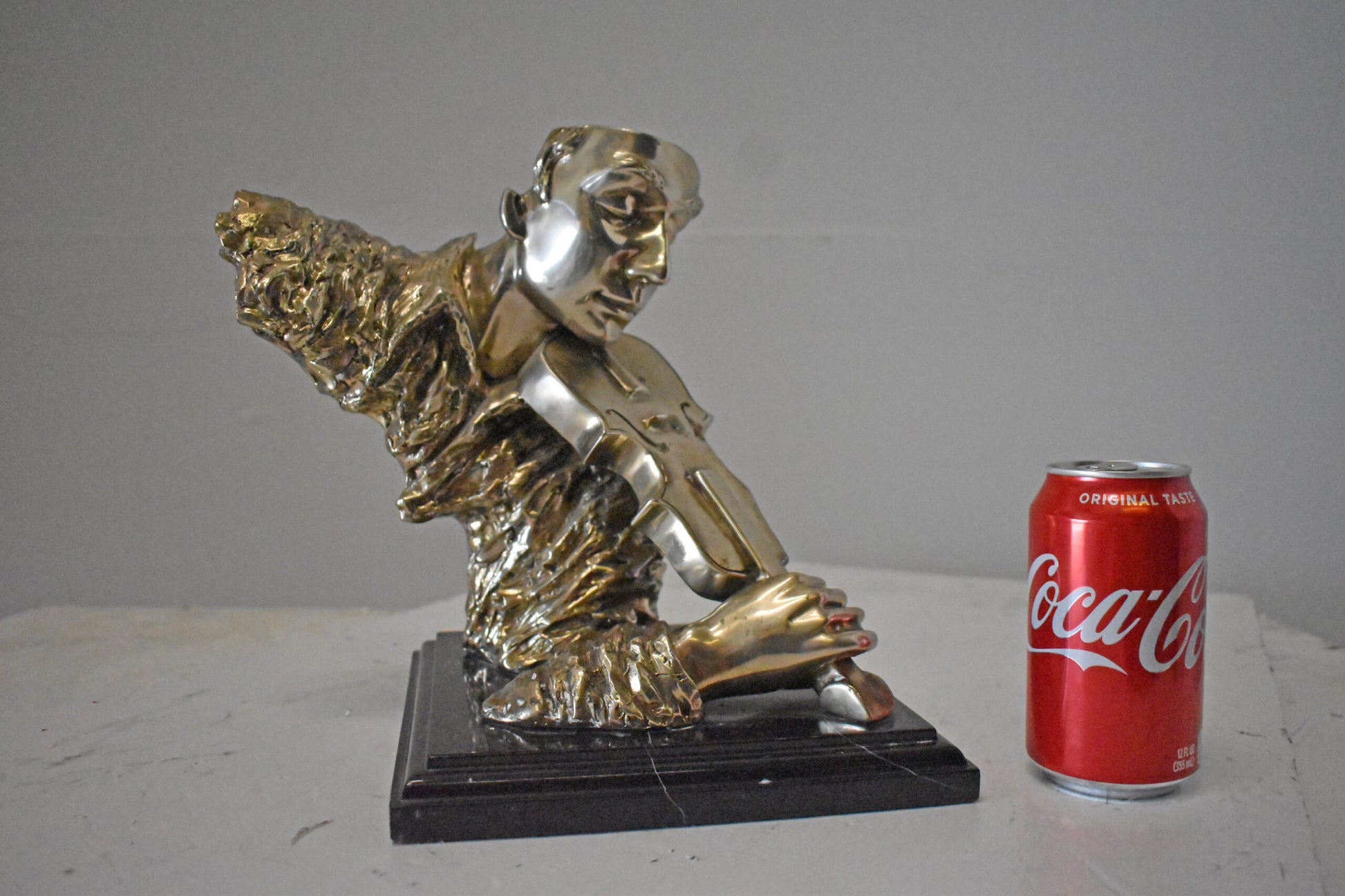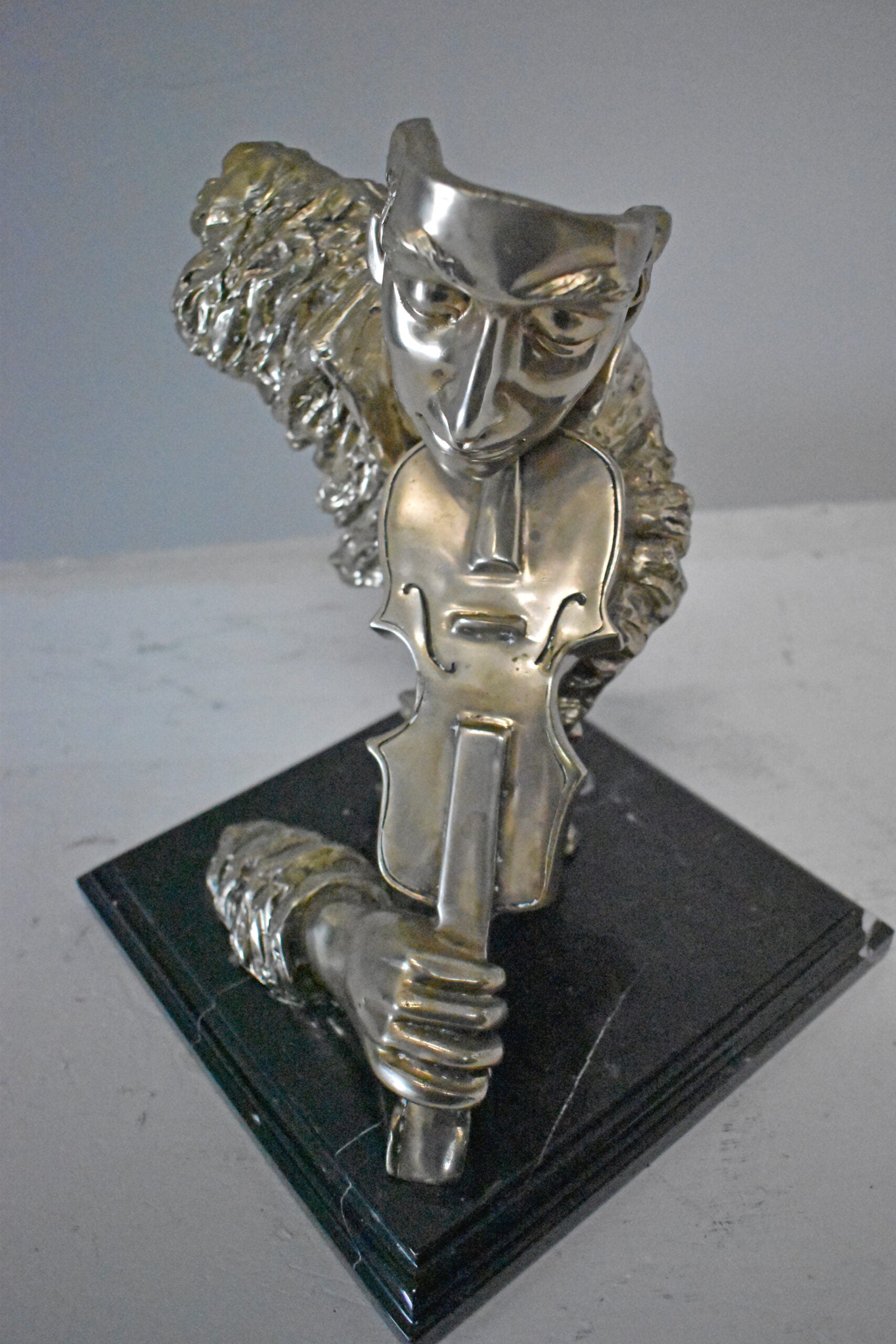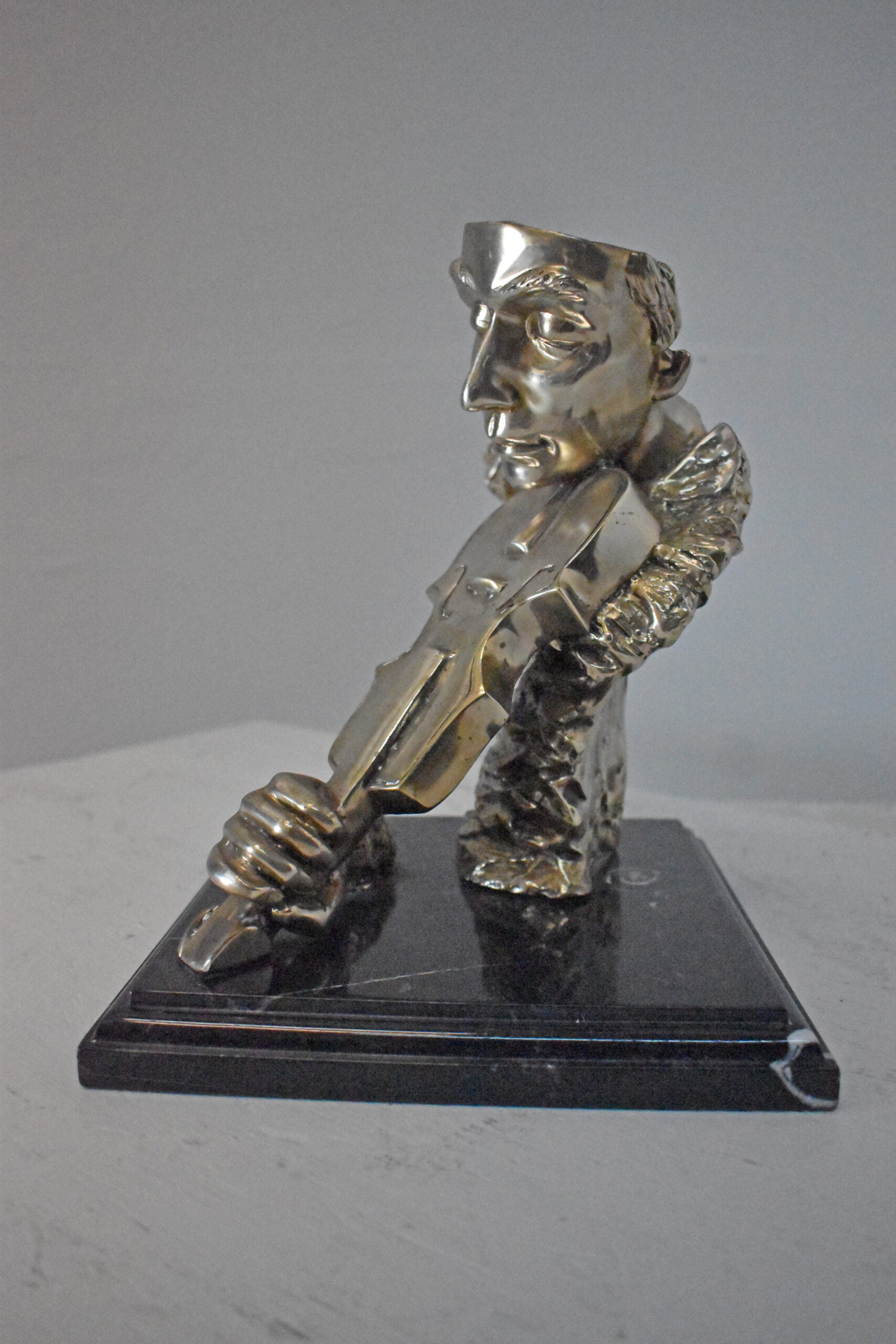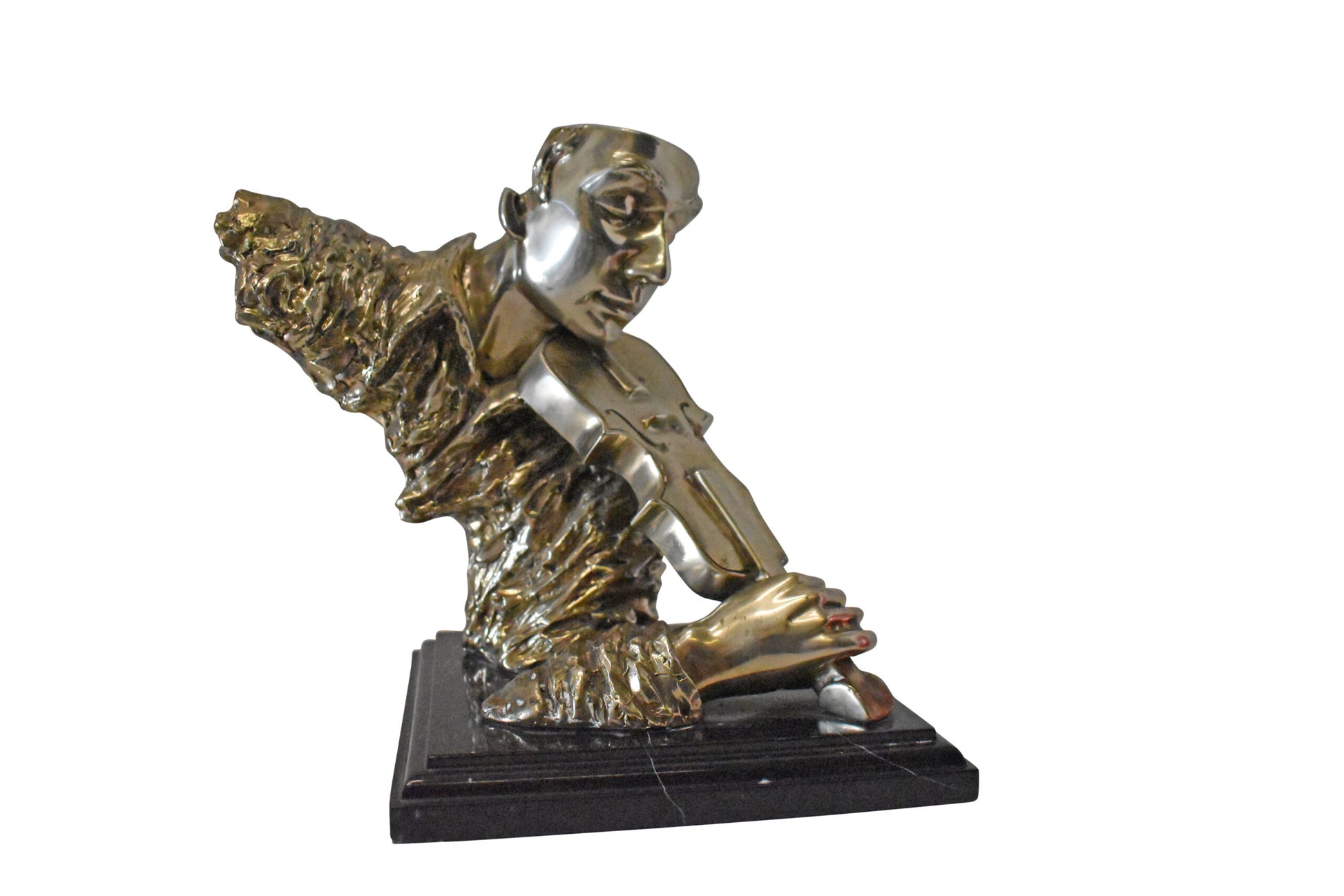 This amazing and creative abstract of a musician playing his violin is exquisite. The sculpture is made with the creation of your imagination. His eyes are concentrating on each string, making sure he does not make any mistakes. The artist only captures the man head, face, hand, and violin. This exceptionally fine and unique abstract was casted using the ancient old Lost Wax Method with silver finish for preservation, mounted atop a black marble base. The piece would stand out in any room and catch the eyes of any viewer, making it a great addition for any space. This bronze statue is a perfect fit for any art or music lover home. Size: 12"L x 9"W x 11"H. Weight is: 13Lb