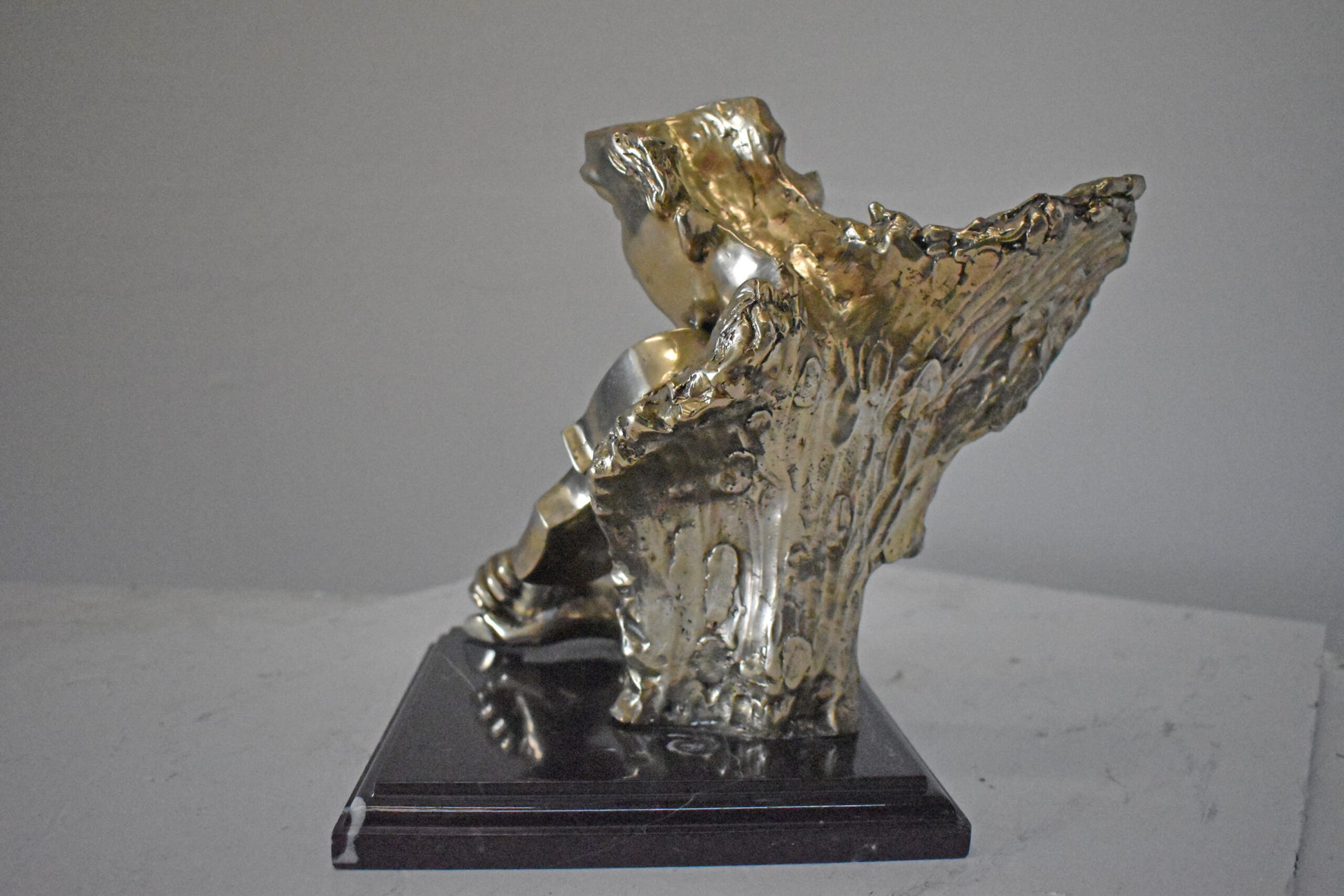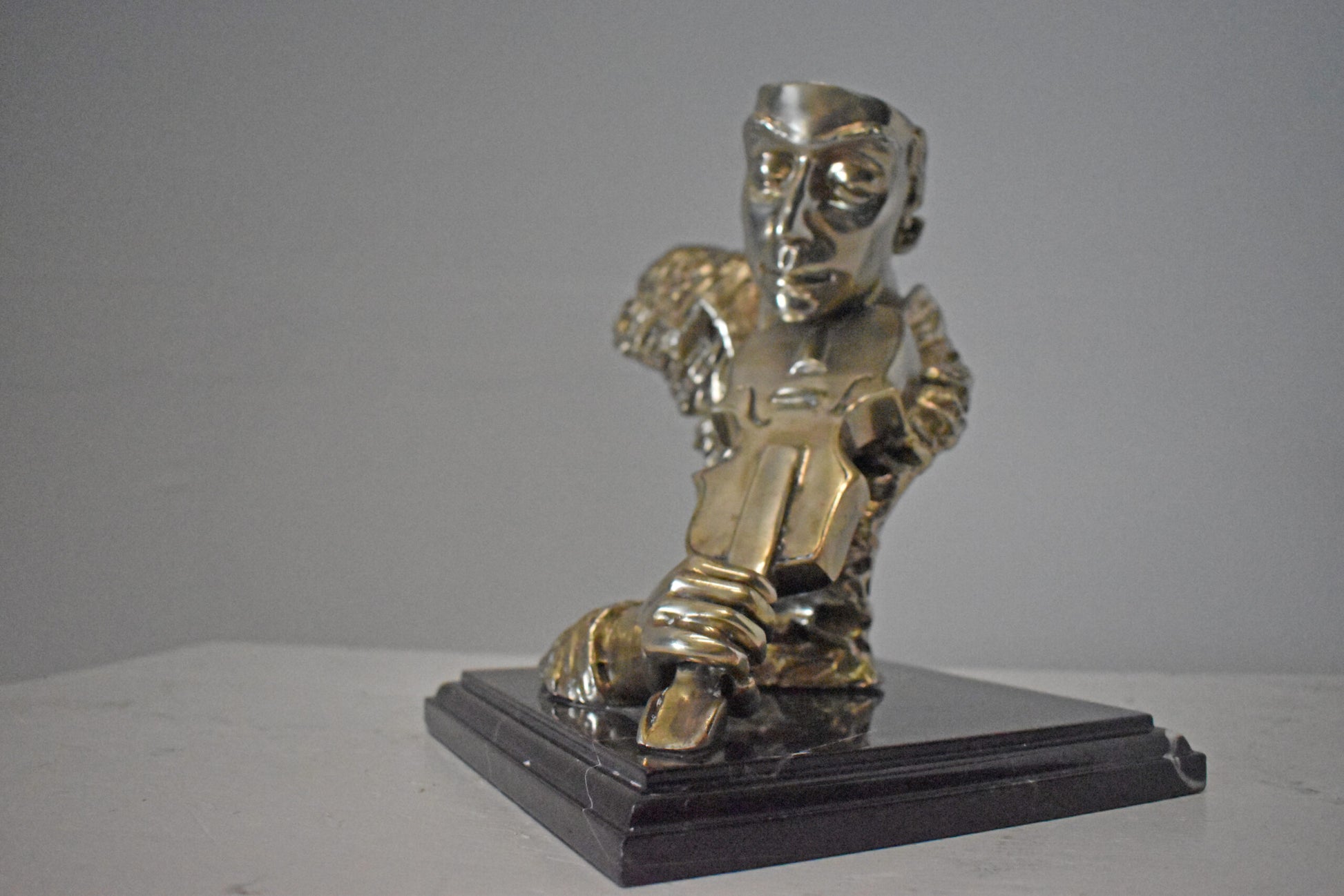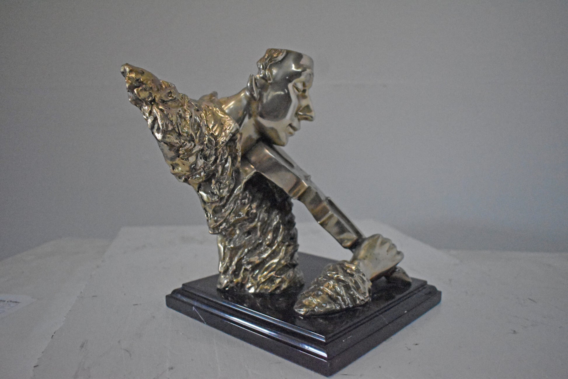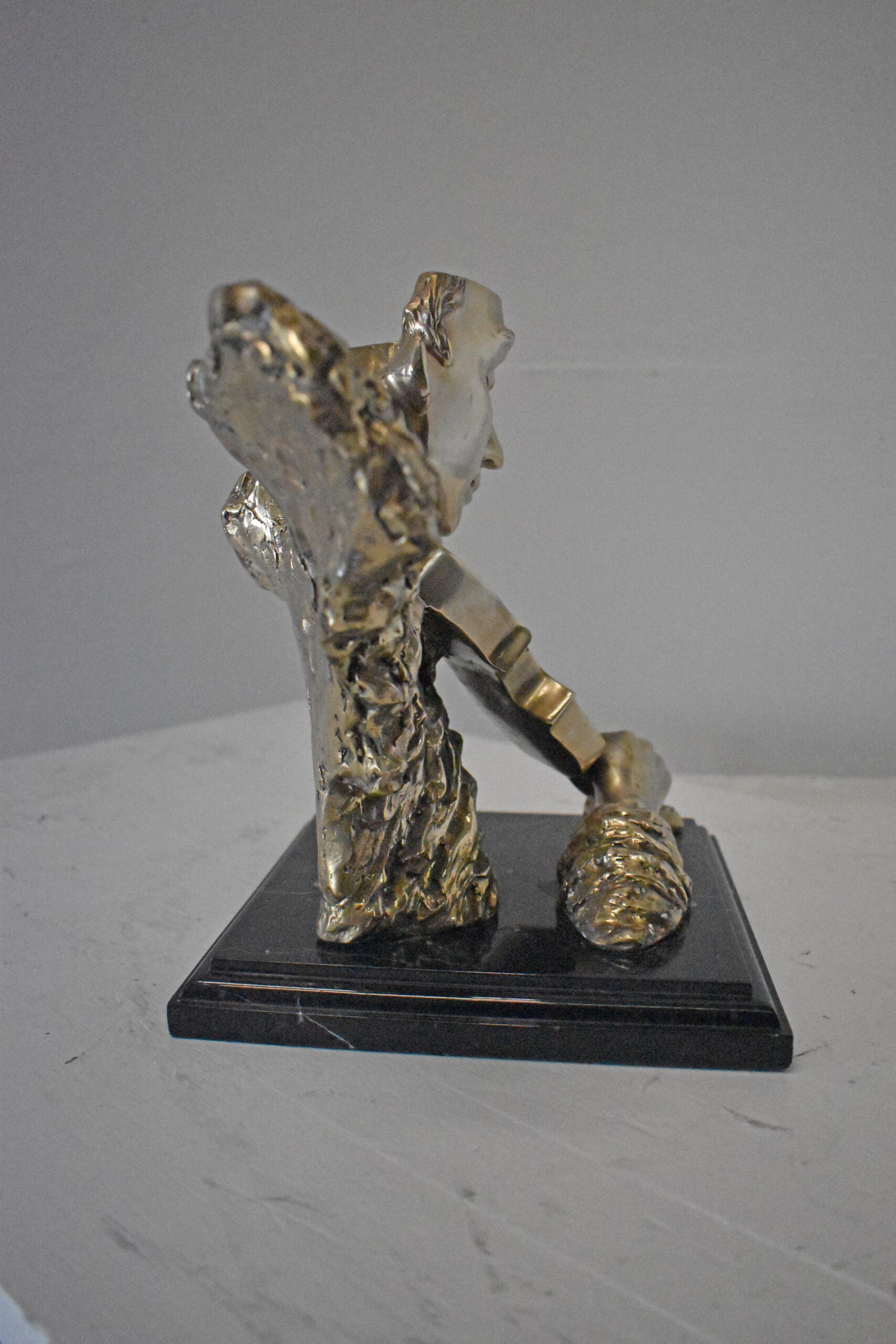 This amazing and creative abstract of a musician playing his violin is exquisite. The sculpture is made with the creation of your imagination. His eyes are concentrating on each string, making sure he does not make any mistakes. The artist only captures the man head, face, hand, and violin. This exceptionally fine and unique abstract was casted using the ancient old Lost Wax Method with silver finish for preservation, mounted atop a black marble base. The piece would stand out in any room and catch the eyes of any viewer, making it a great addition for any space. This bronze statue is a perfect fit for any art or music lover home. Size: 12"L x 9"W x 11"H. Weight is: 13Lb