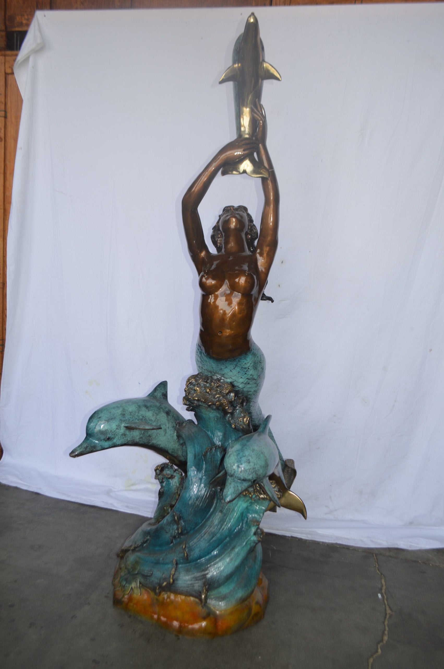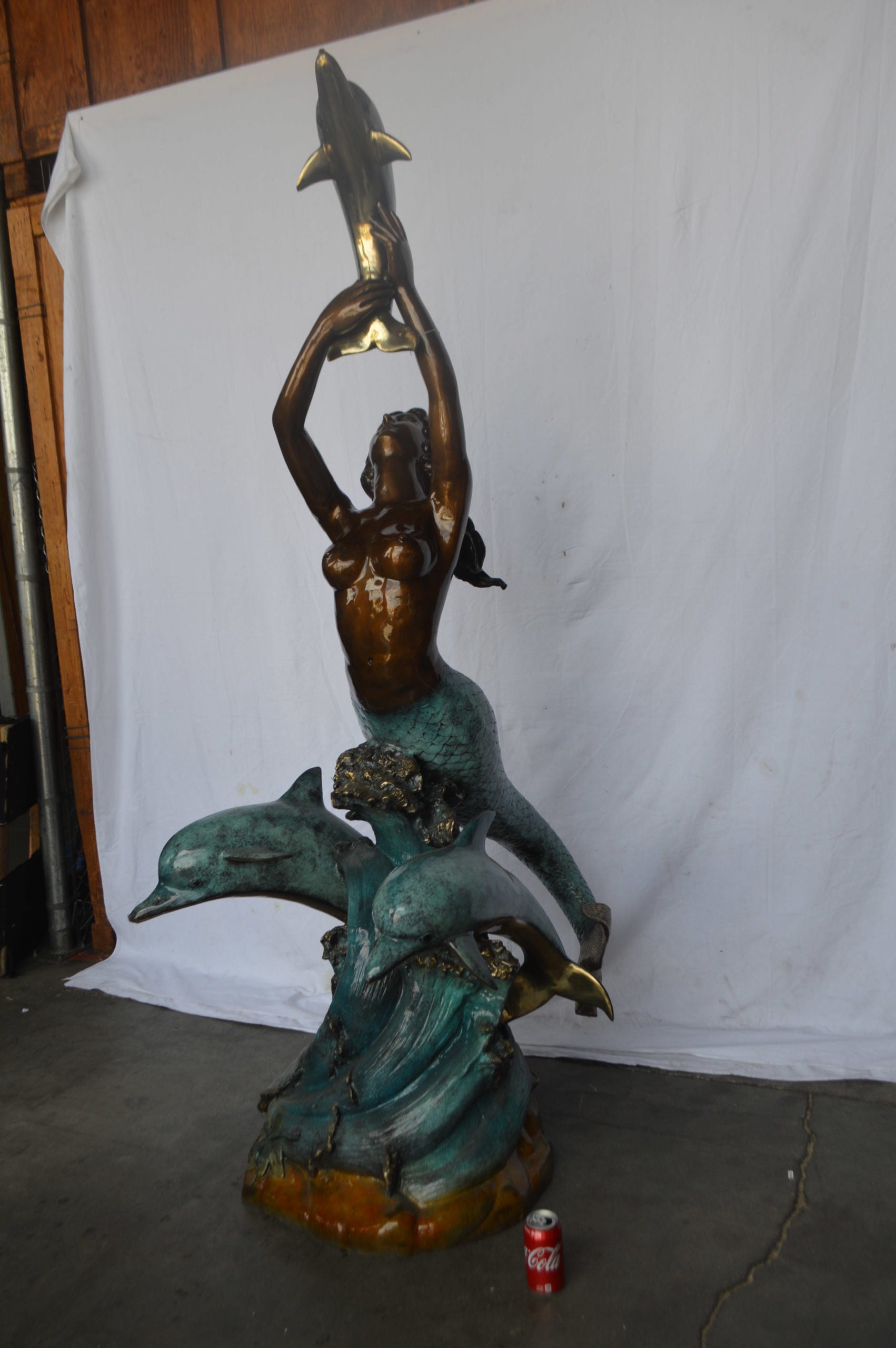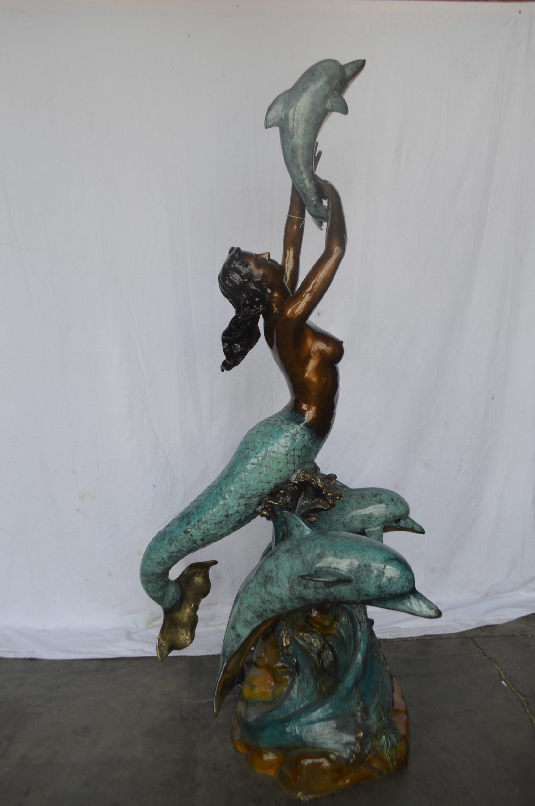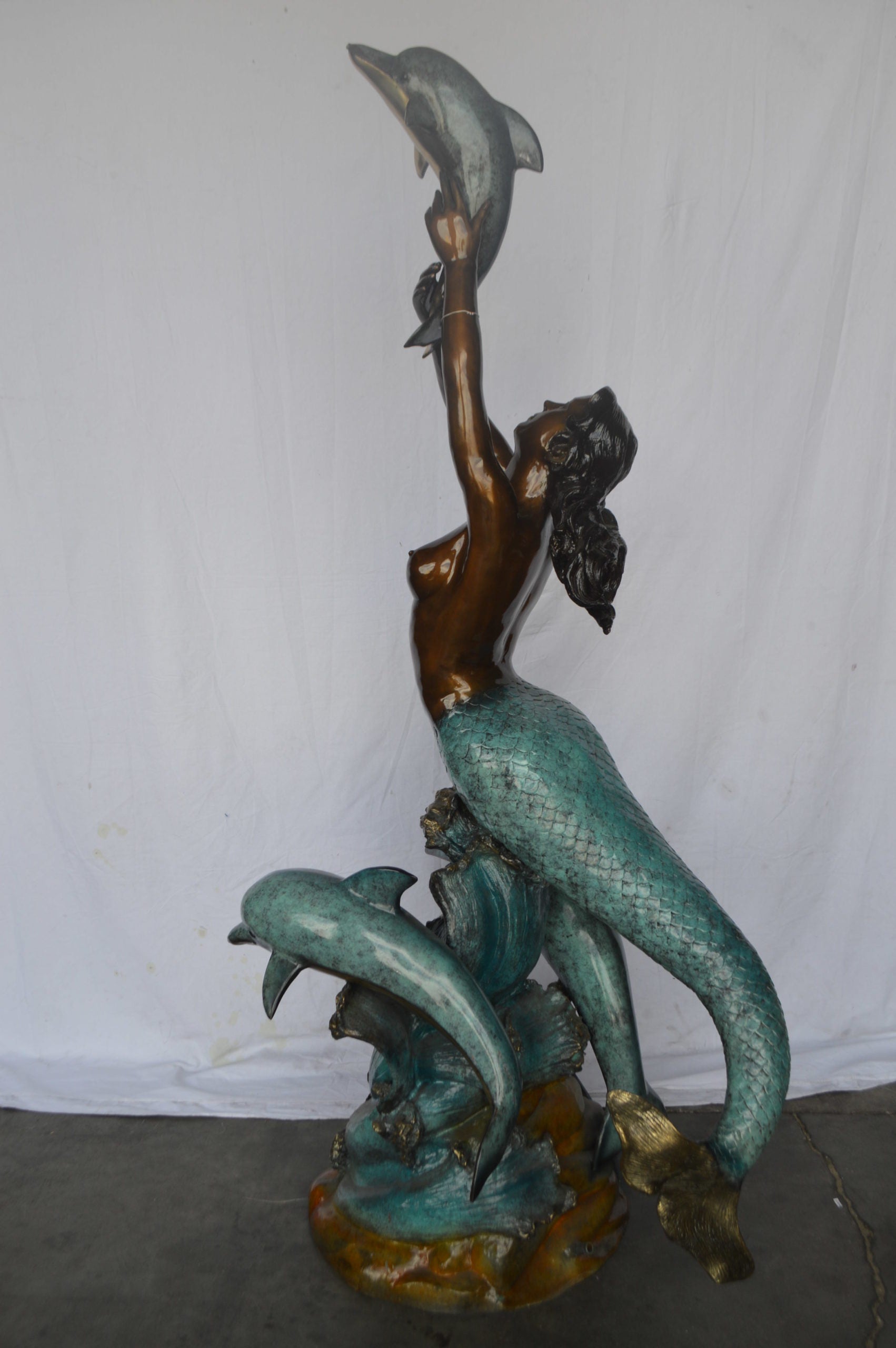 Mermaid and Three dolphins fountain bronze statue - Size: 34"L x 41"W x 83"H.