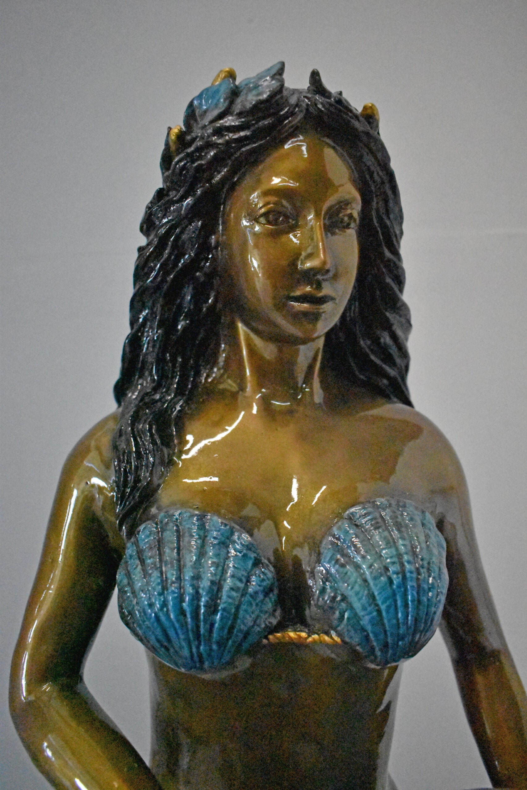 No lover of timeless sea lore and the mysteries of the deep can resist this incredibly detailed Mermaid holding a shell fountain. Water spills from the shell with the help of a water pump (pump is not included). Handcrafted in cast brass and finished with colors deeper than the ocean itself, this breathtaking expression of the world beneath the waves beautifies any space and enhances any decor. . The patina chosen for this Timeless Creation is a mix of hand finishing with different colors and Polychrome techniques also referred to as enameling over bronze, sits on a marble base. This bronze statue is museum quality and hand-cast in high-quality pure bronze using the Lost Wax Process of bronze casting. Size: 18"L x 19"W x 46"H. Weight is: 50Lb