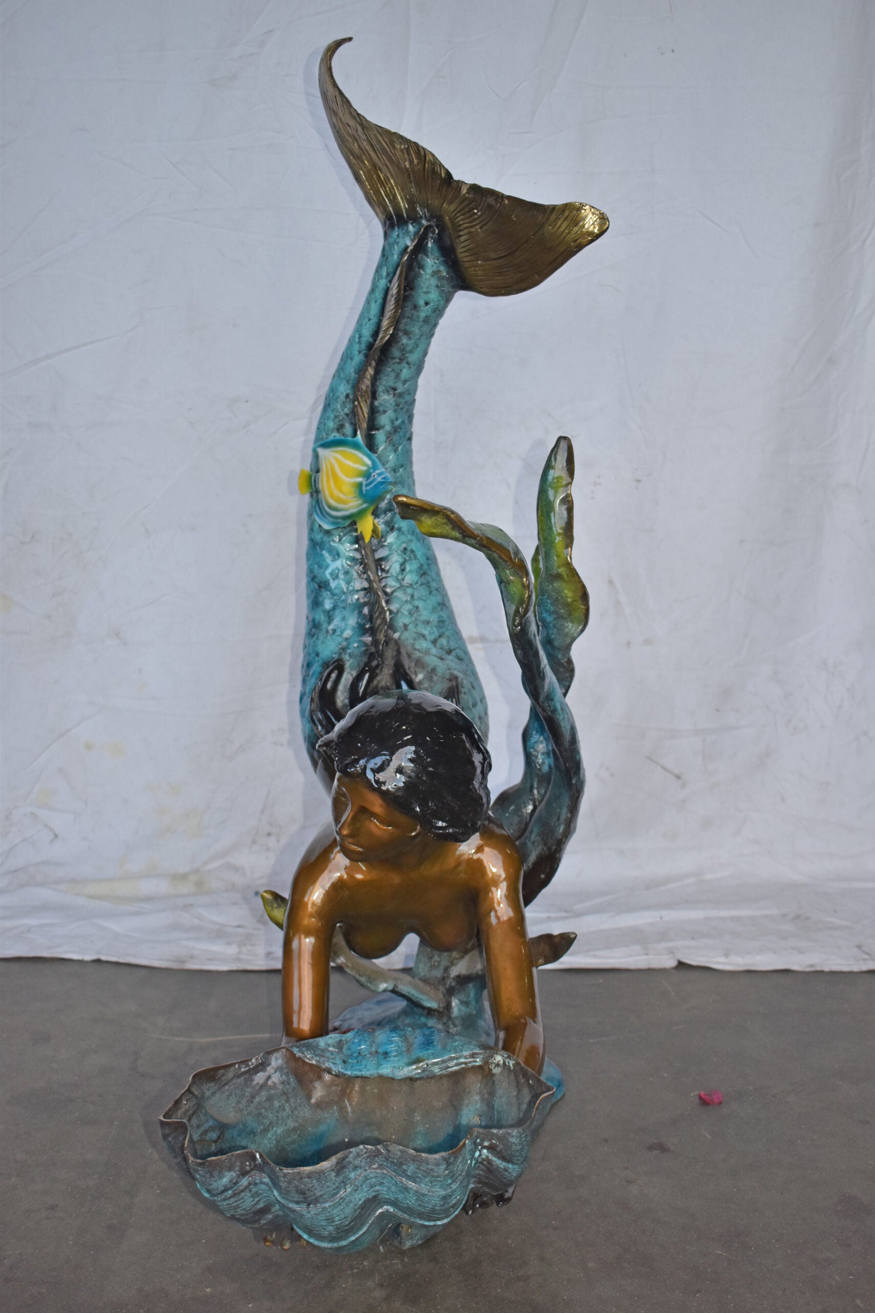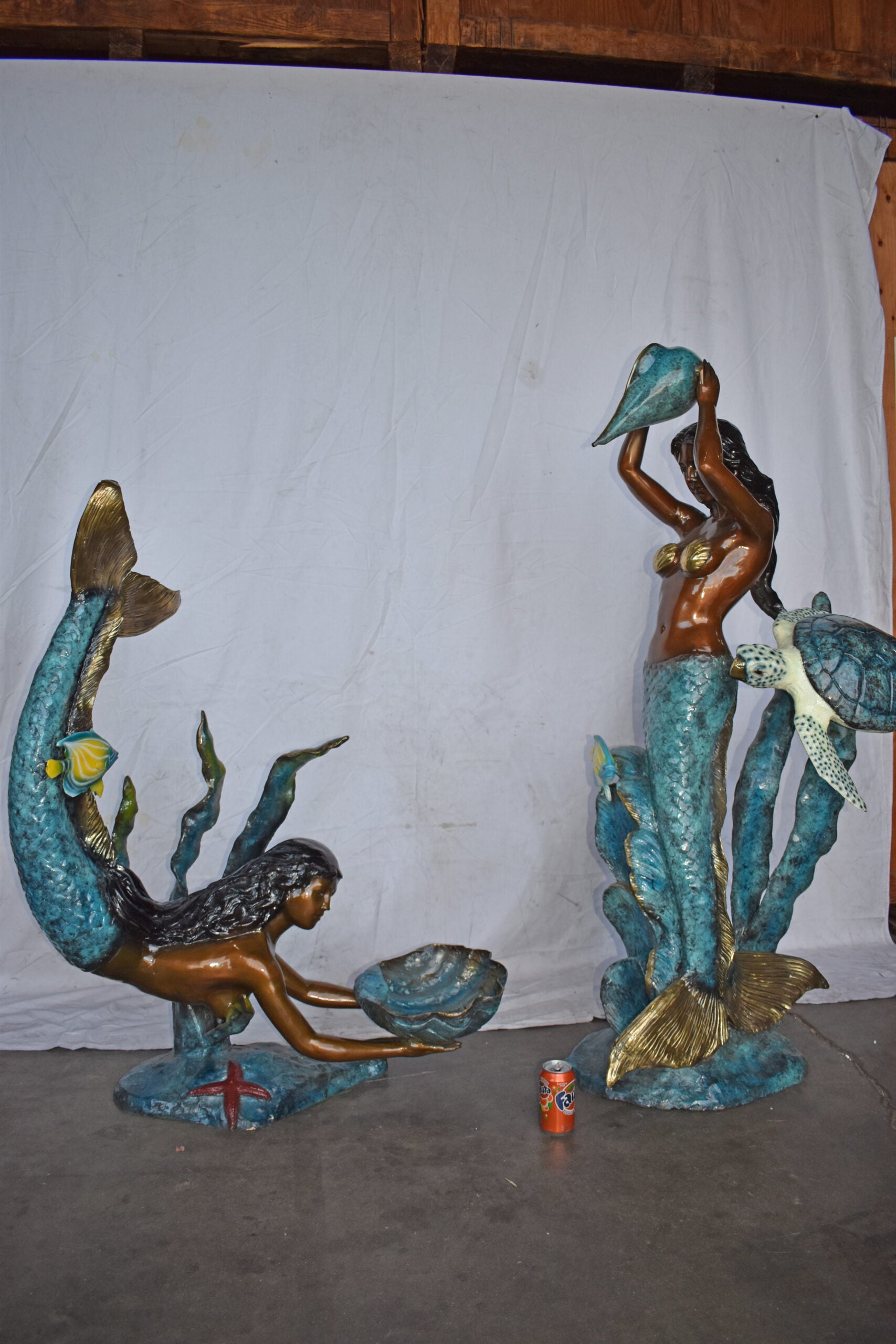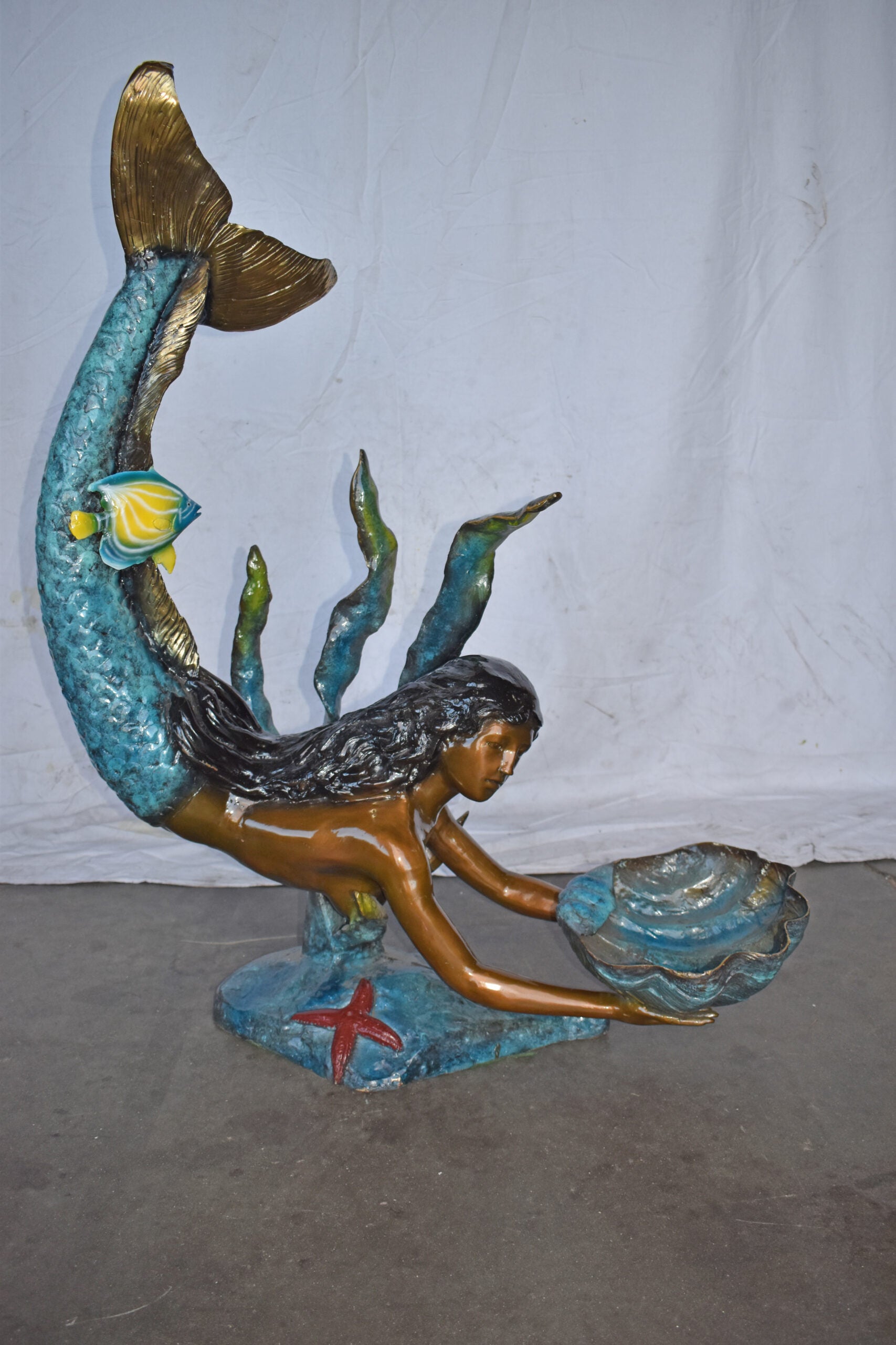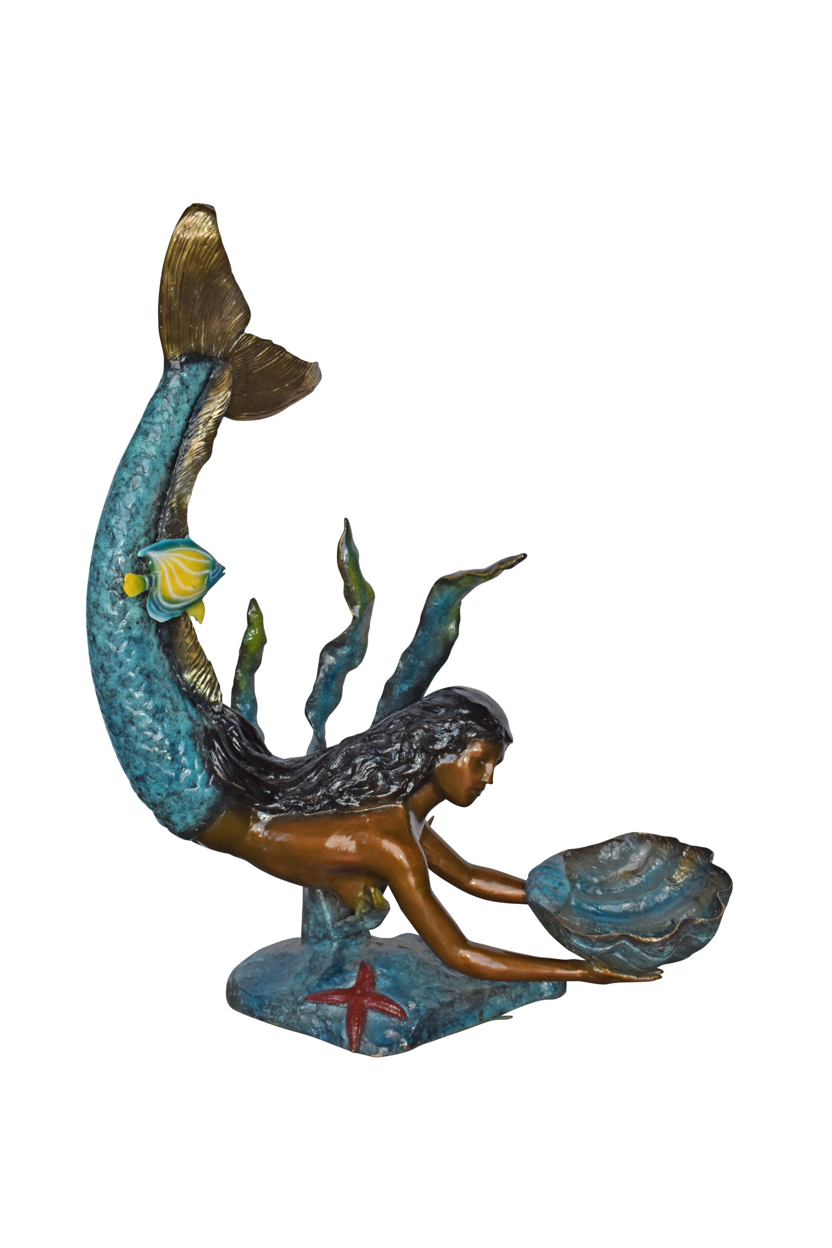 No lover of timeless sea lore and the mysteries of the deep sea can resist this incredibly detailed statue, of a mermaid diving down to the bottom of the ocean and holding a large shell. Handcrafted in cast brass and finished with colors deeper than the ocean itself, this breathtaking expression of the world beneath the waves beautifies any area in your garden or house. This impressive Bronze Statue will be a permanent fixture on the grounds of your estate for years to come. This statue often sold as a pair to another mermaid fountain that spills the water on the shell – look at my store for: Mermaid Holding a Shell Fountain W Turtle Bronze Statue Size: 16"L x 38"W x 48"H. Weight is: 80Lb