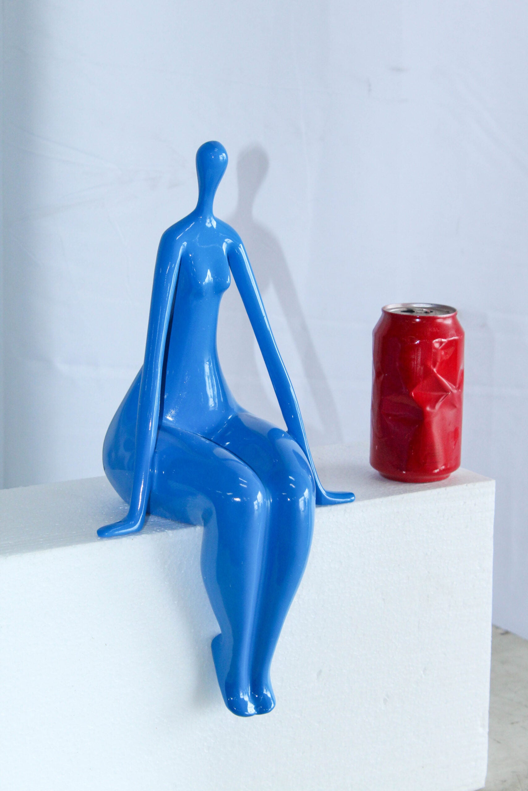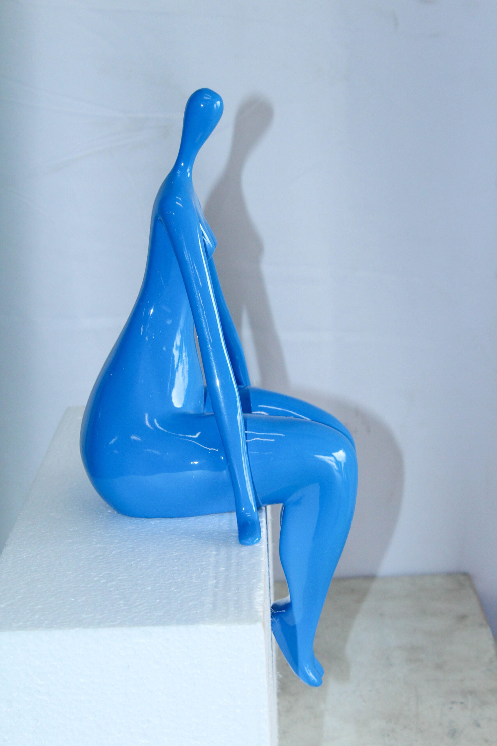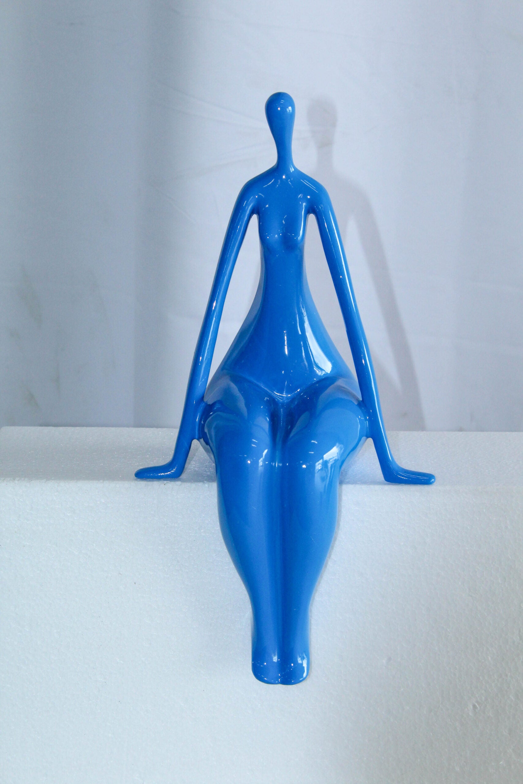 Elegant abstract woman sitting on edge, sculpture in a smooth, glossy blue finish. Minimalist design with elongated arms and soft curves. The seated pose adds a modern, artistic touch to a shelf edge, desk, or display ledge. Crafted from durable resin. Great for contemporary home decor, gifts, or office accents. Similar in height to a soda can. Ideal for collectors of abstract art. Size: 8"L x 6"W x 15"H. Weight: 2Lb