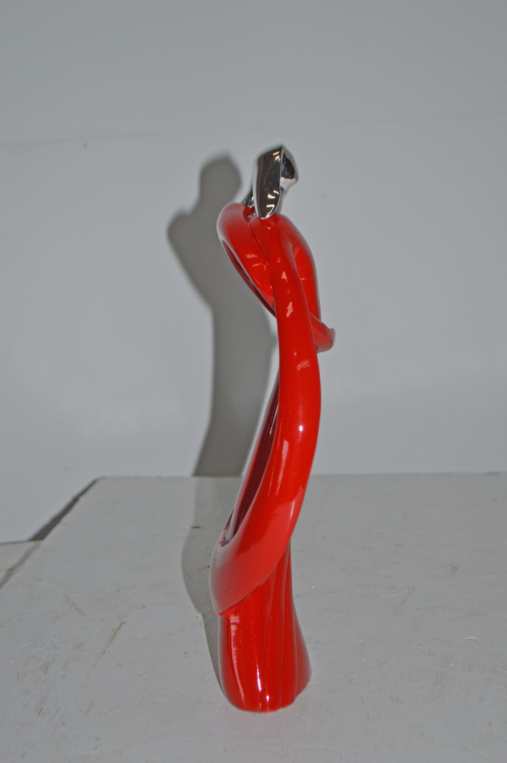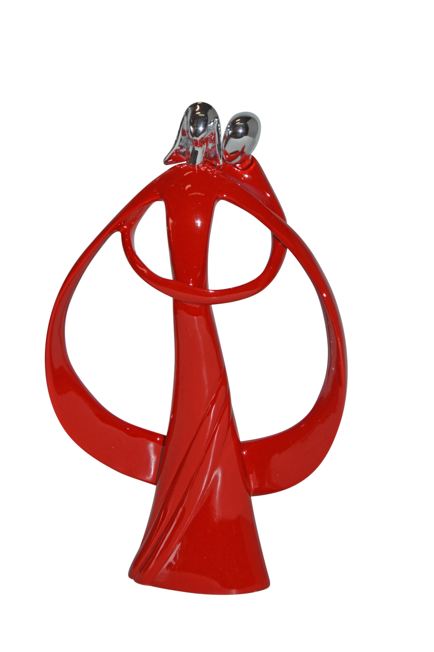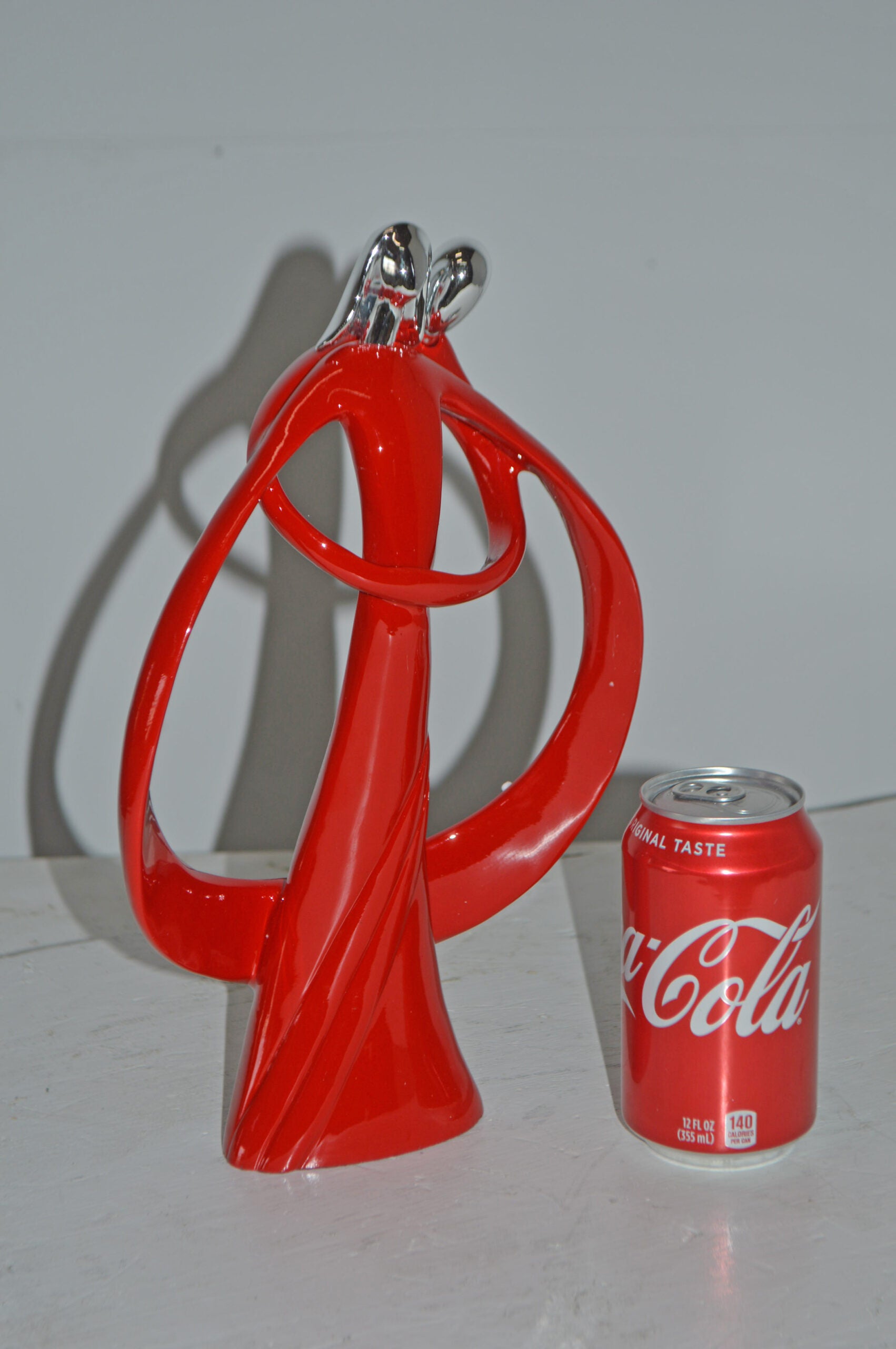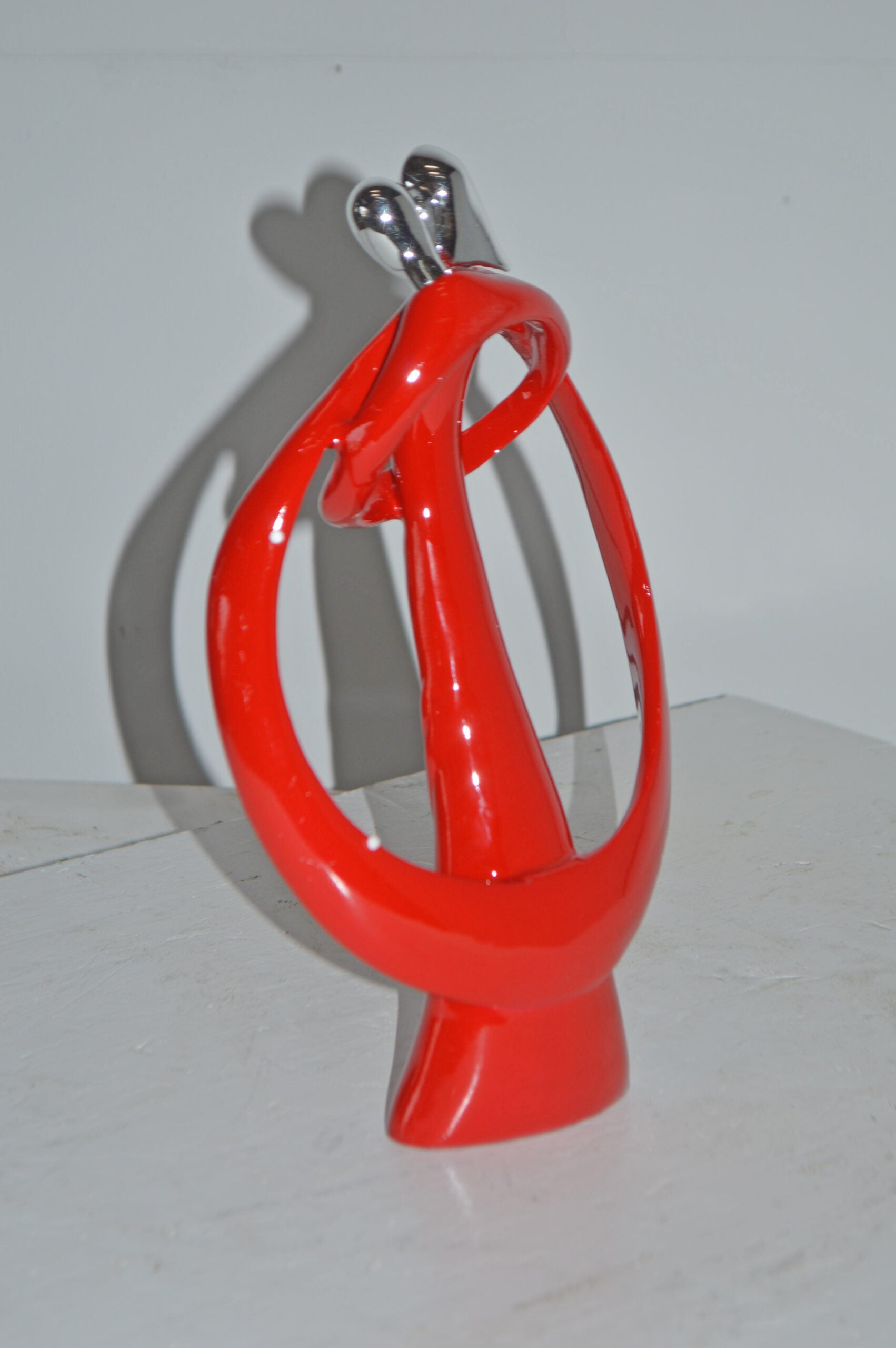 The beautiful modern art resin statue of a young couple hugging, colored red with shiny chrome heads. This impressive resin Statue will be a permanent fixture at your home for years to come. This statue comes in color red and black – customer often buy both as a set Size: 8"L x 2"W x 12"H. Weight is: 2Lb