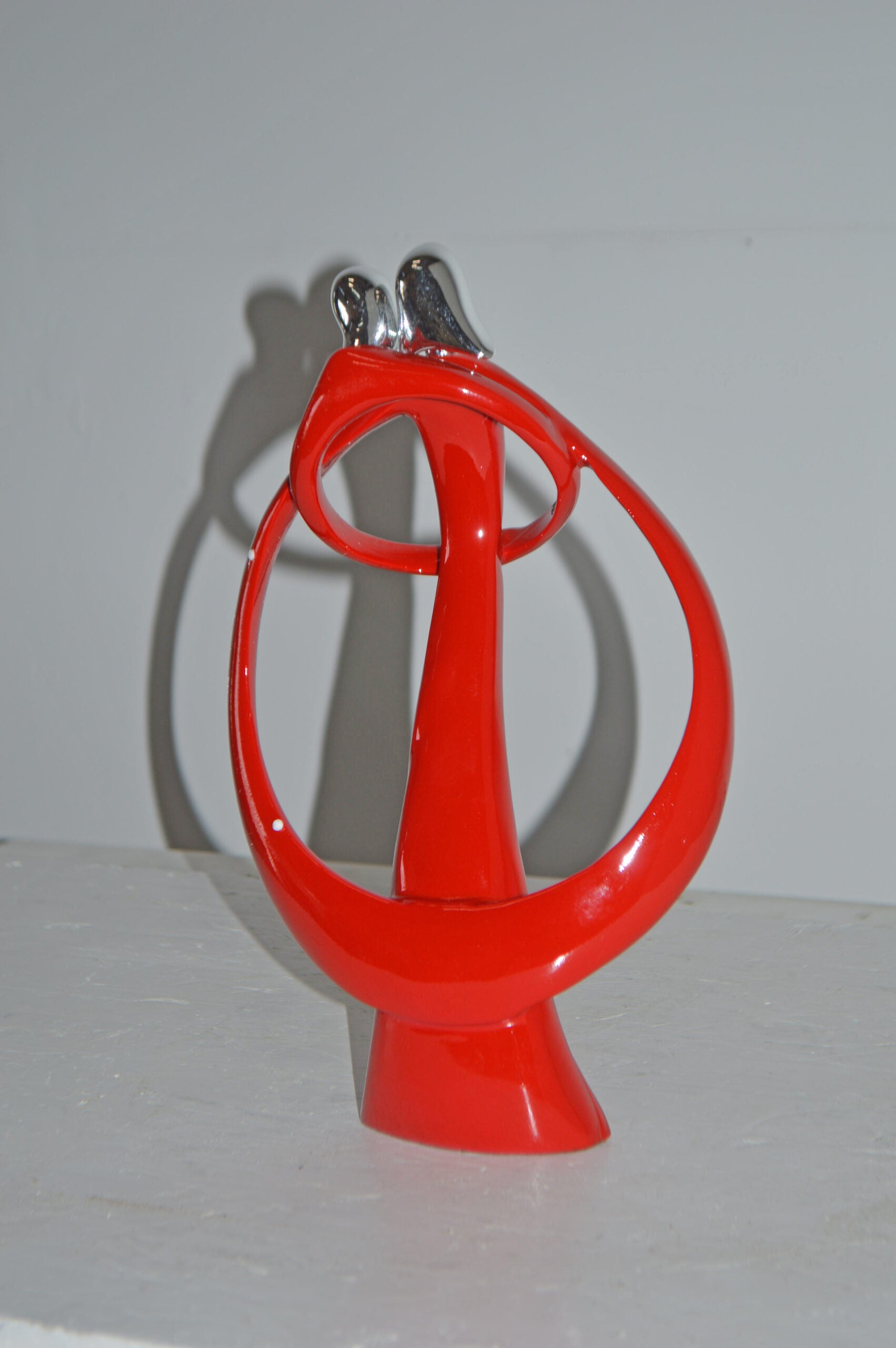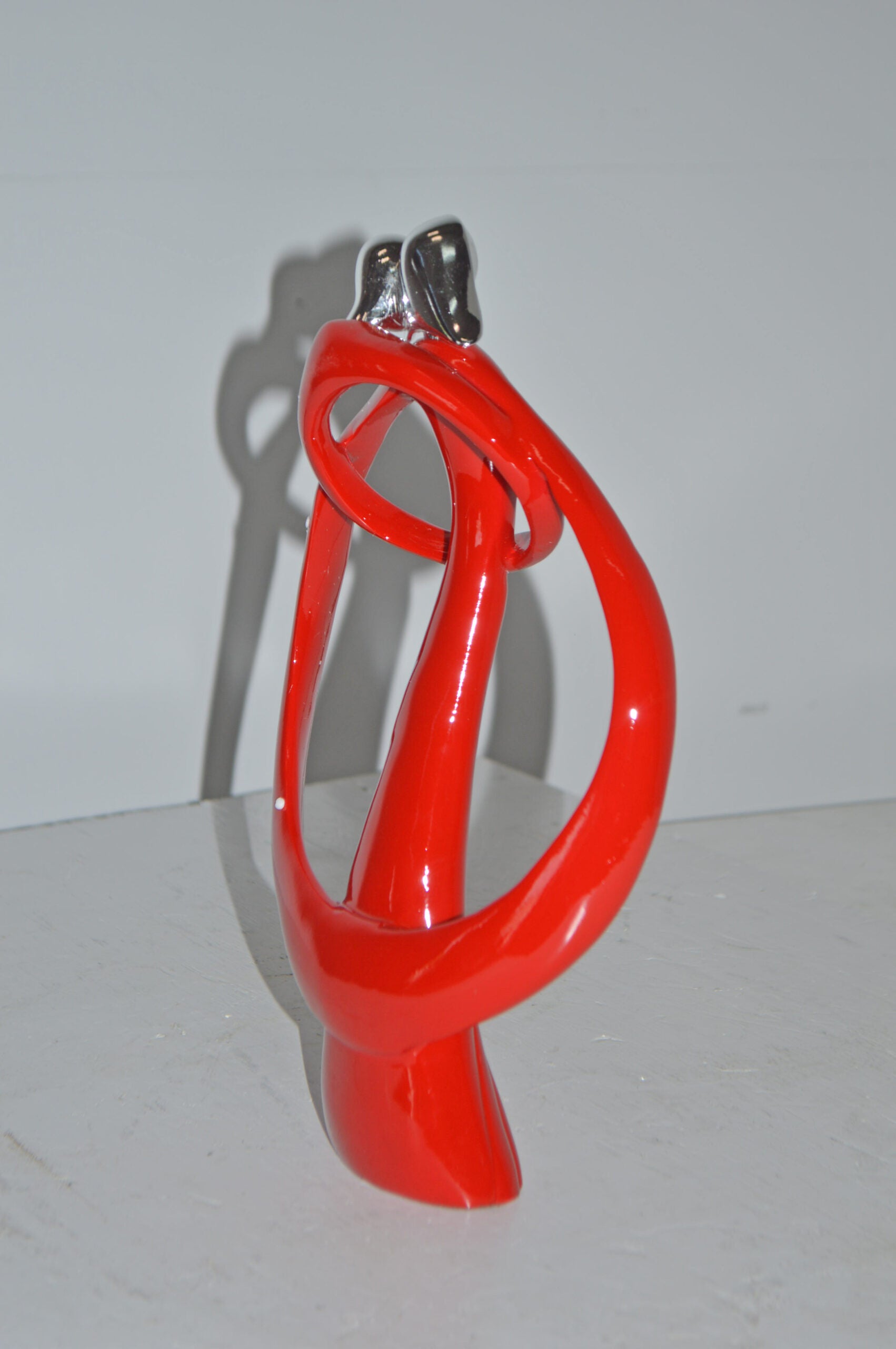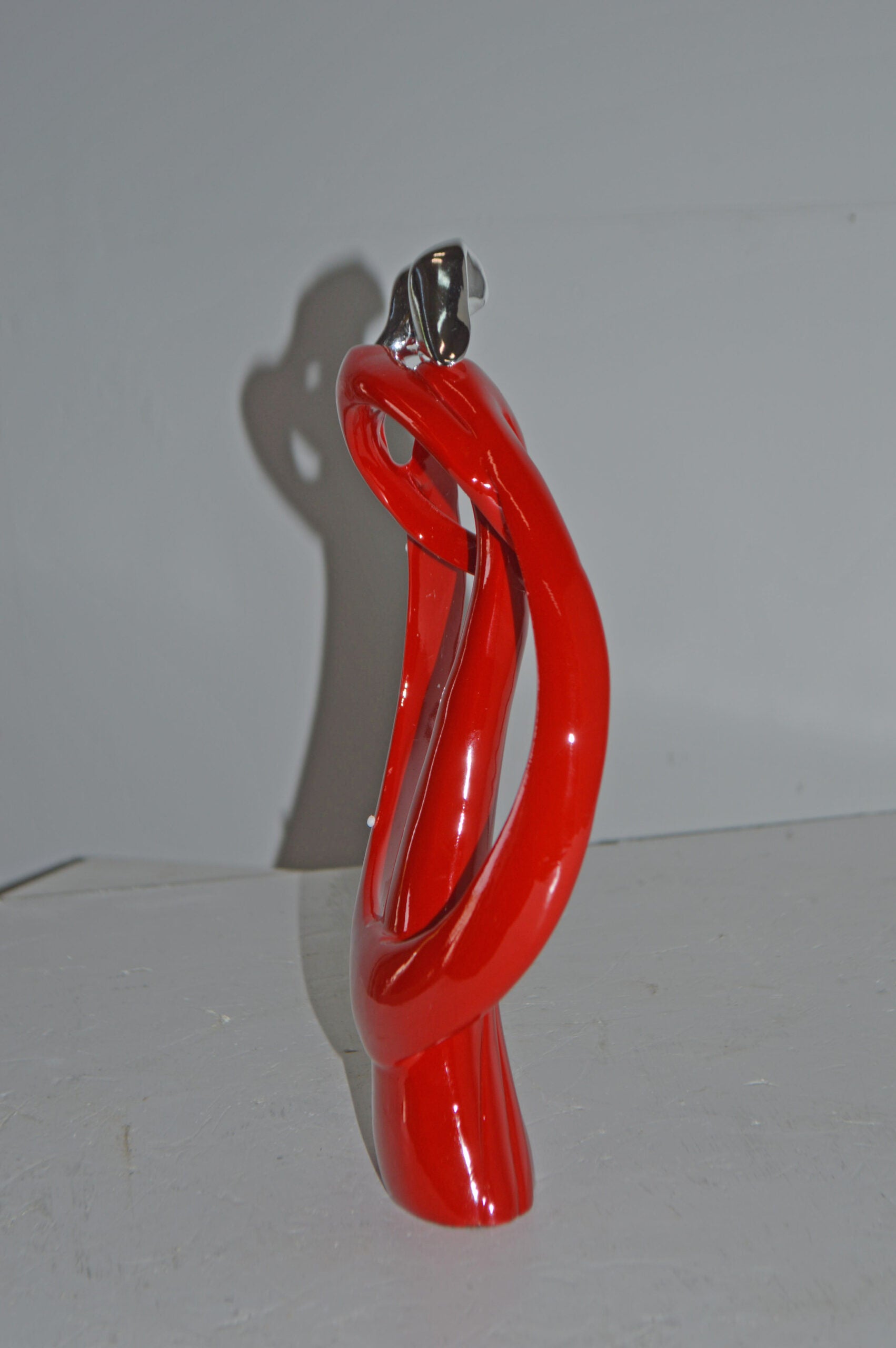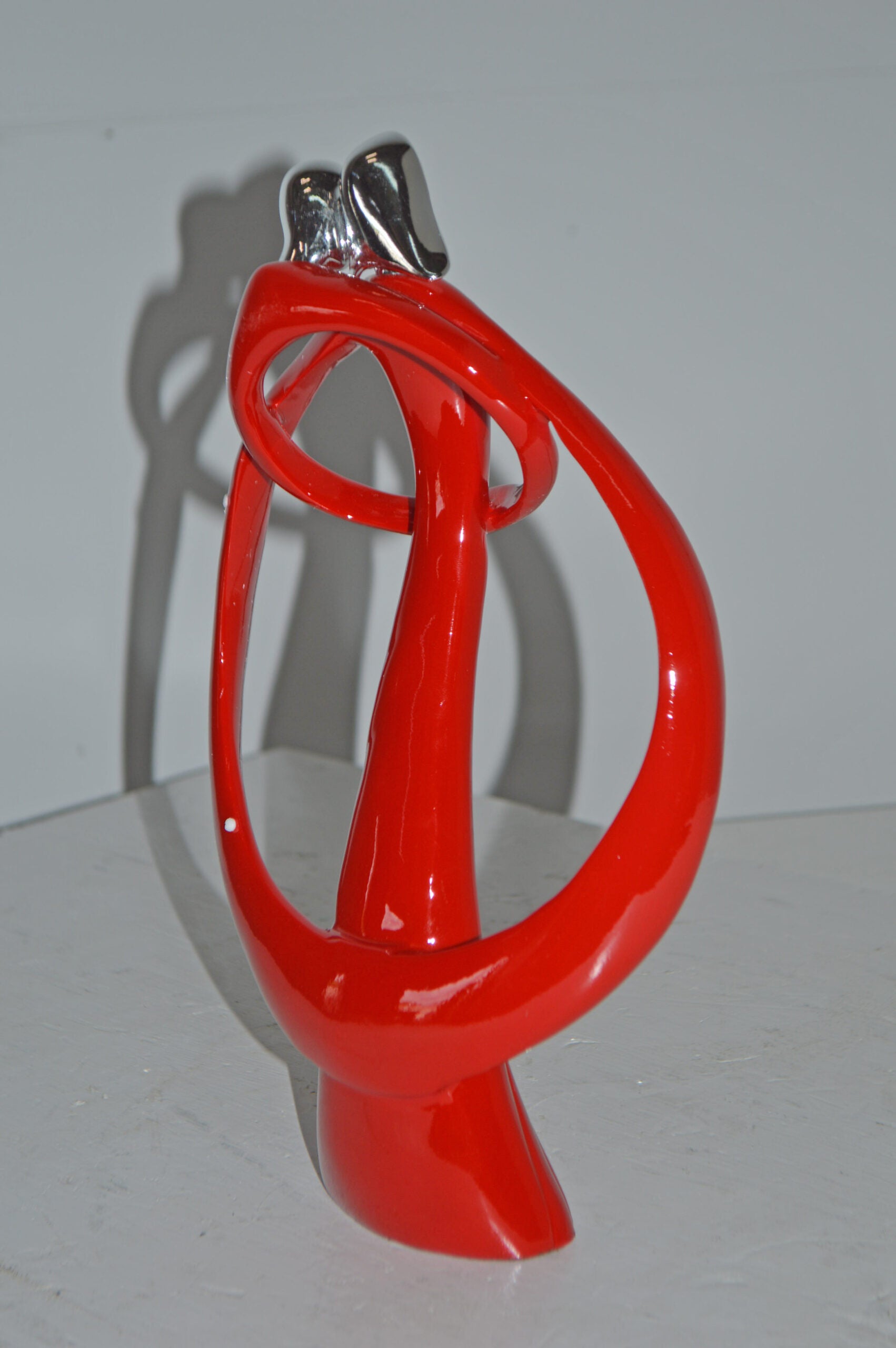 The beautiful modern art resin statue of a young couple hugging, colored red with shiny chrome heads. This impressive resin Statue will be a permanent fixture at your home for years to come. This statue comes in color red and black – customer often buy both as a set Size: 8"L x 2"W x 12"H. Weight is: 2Lb
