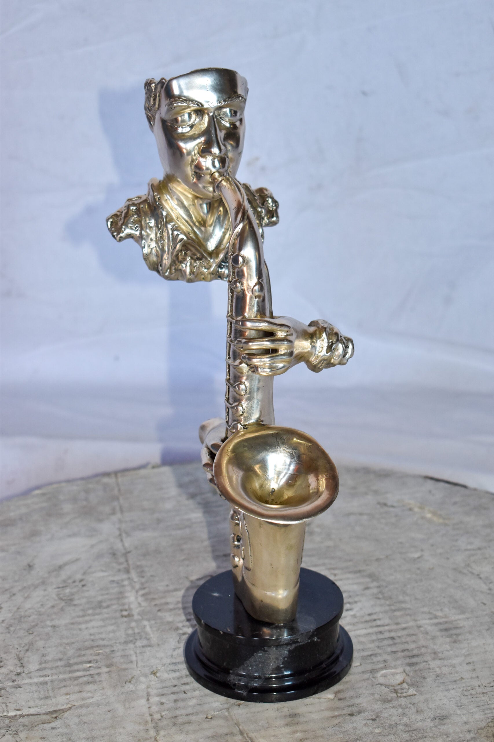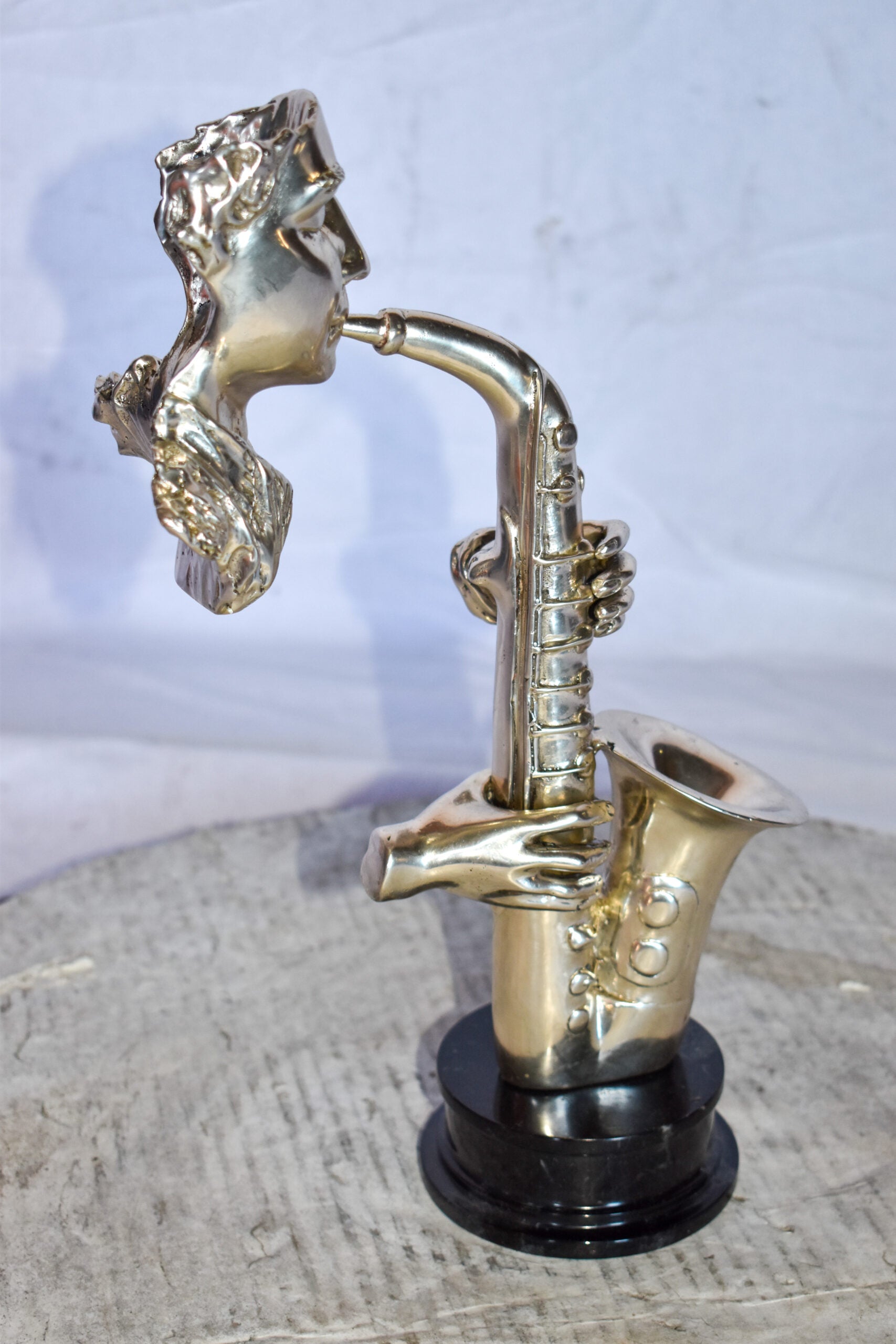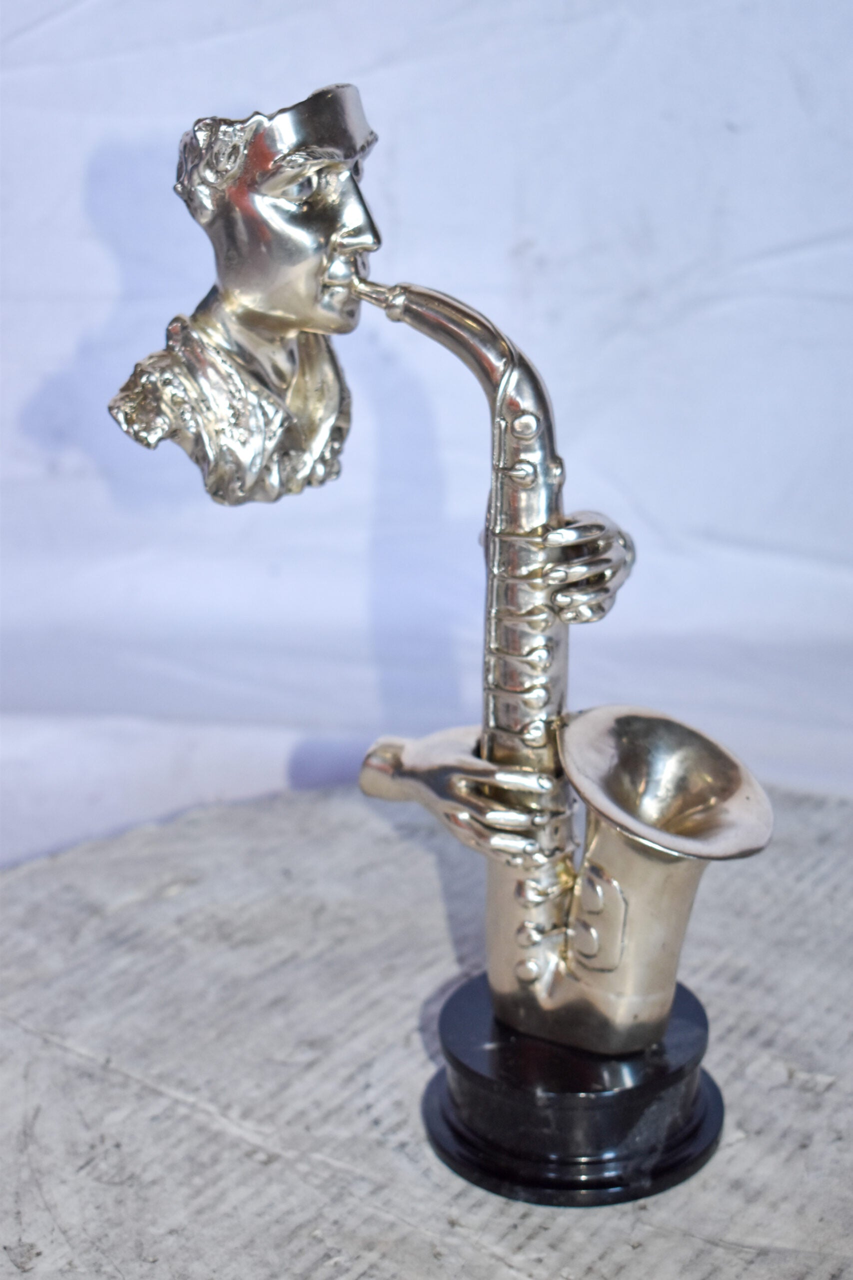 This is a perfect bronze statue in silver finish for any music lovers. A man's face and hand carefully plays the saxophone, a timeless instrument that produces an absolutely beautiful sound. This bronze sculpture was cast using the lost Wax Method will be a perfect fit for any art or music lover's home. Size: 7"L x 5"W x 15"H. Weight is: 5Lb