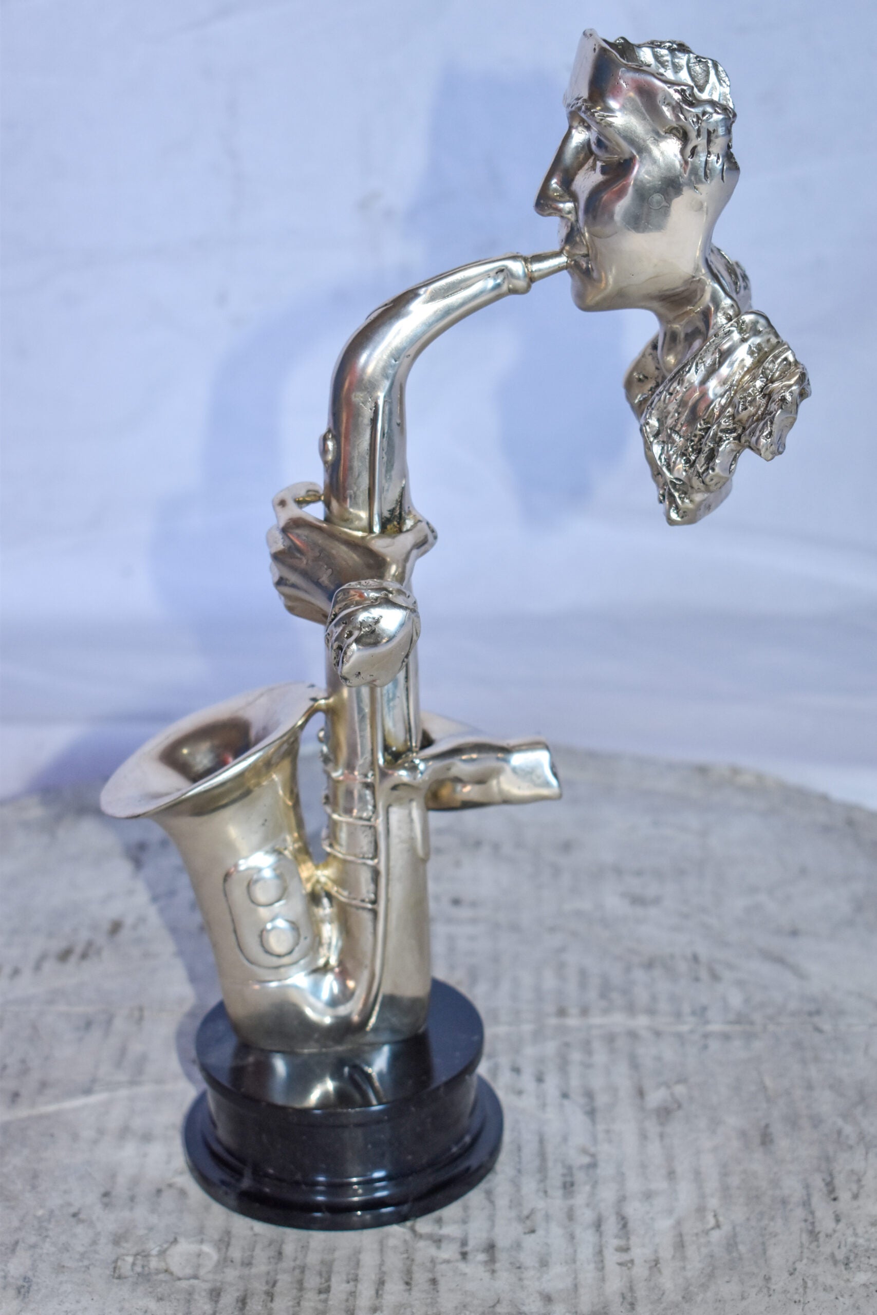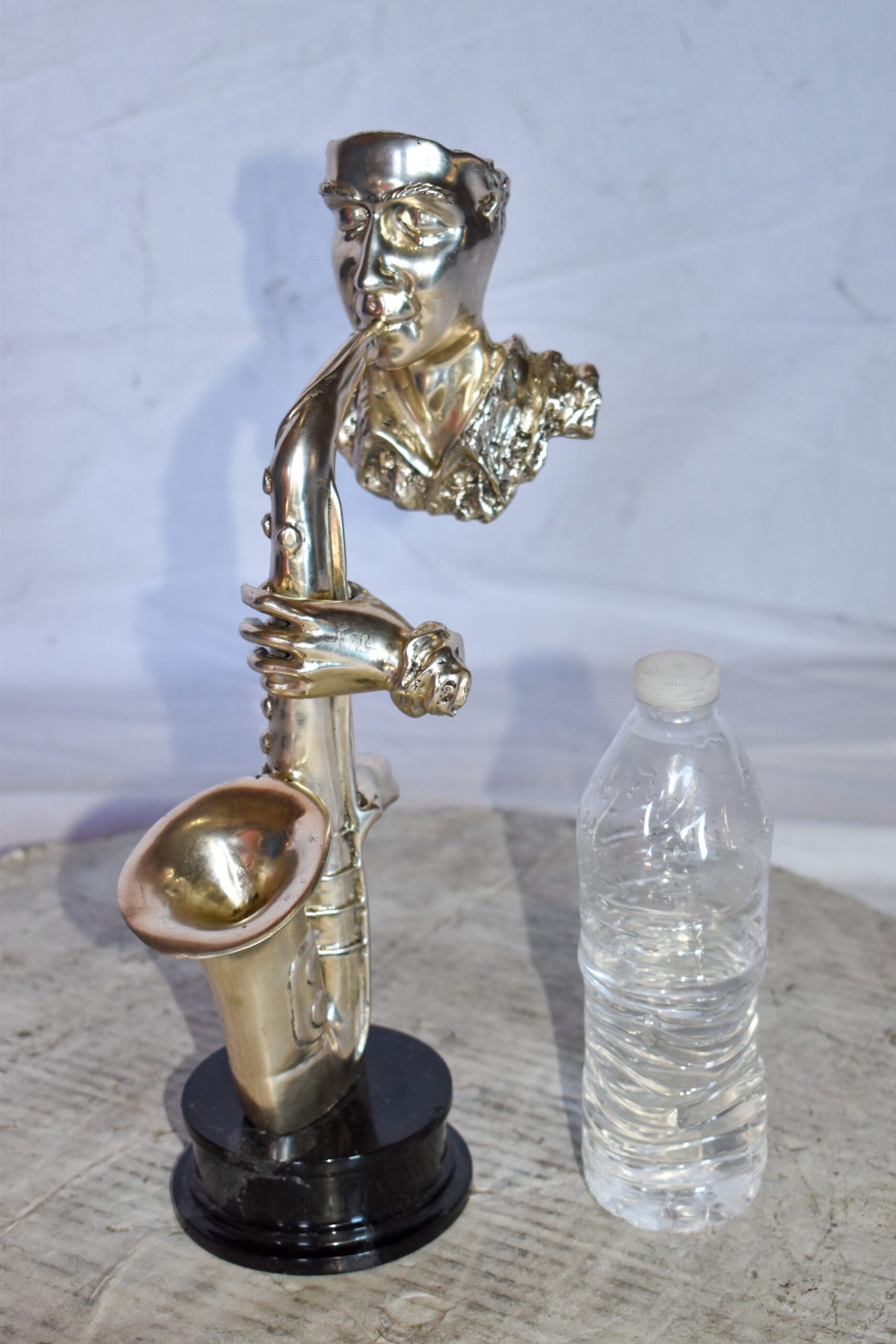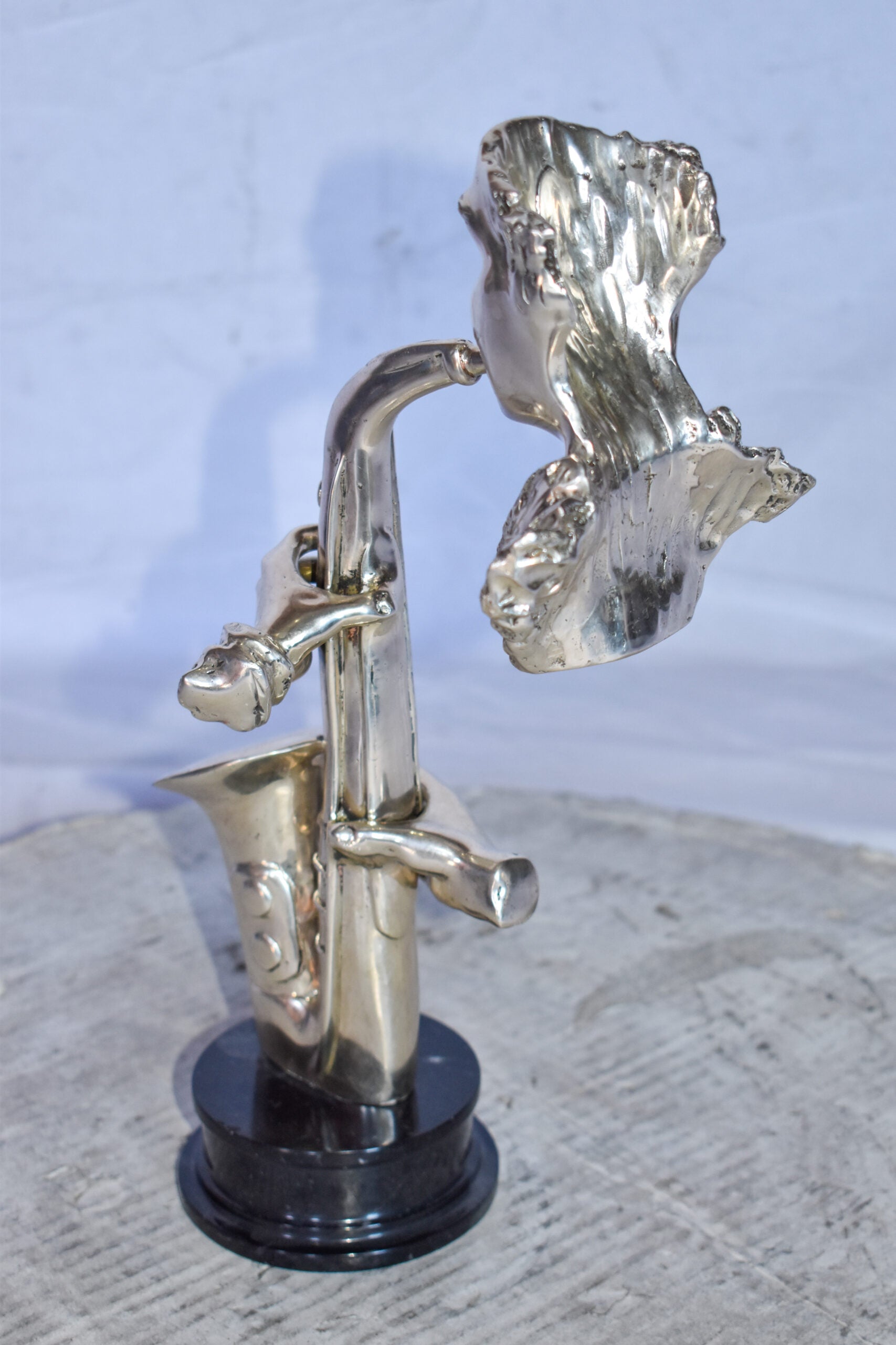 This is a perfect bronze statue in silver finish for any music lovers. A man's face and hand carefully plays the saxophone, a timeless instrument that produces an absolutely beautiful sound. This bronze sculpture was cast using the lost Wax Method will be a perfect fit for any art or music lover's home. Size: 7"L x 5"W x 15"H. Weight is: 5Lb