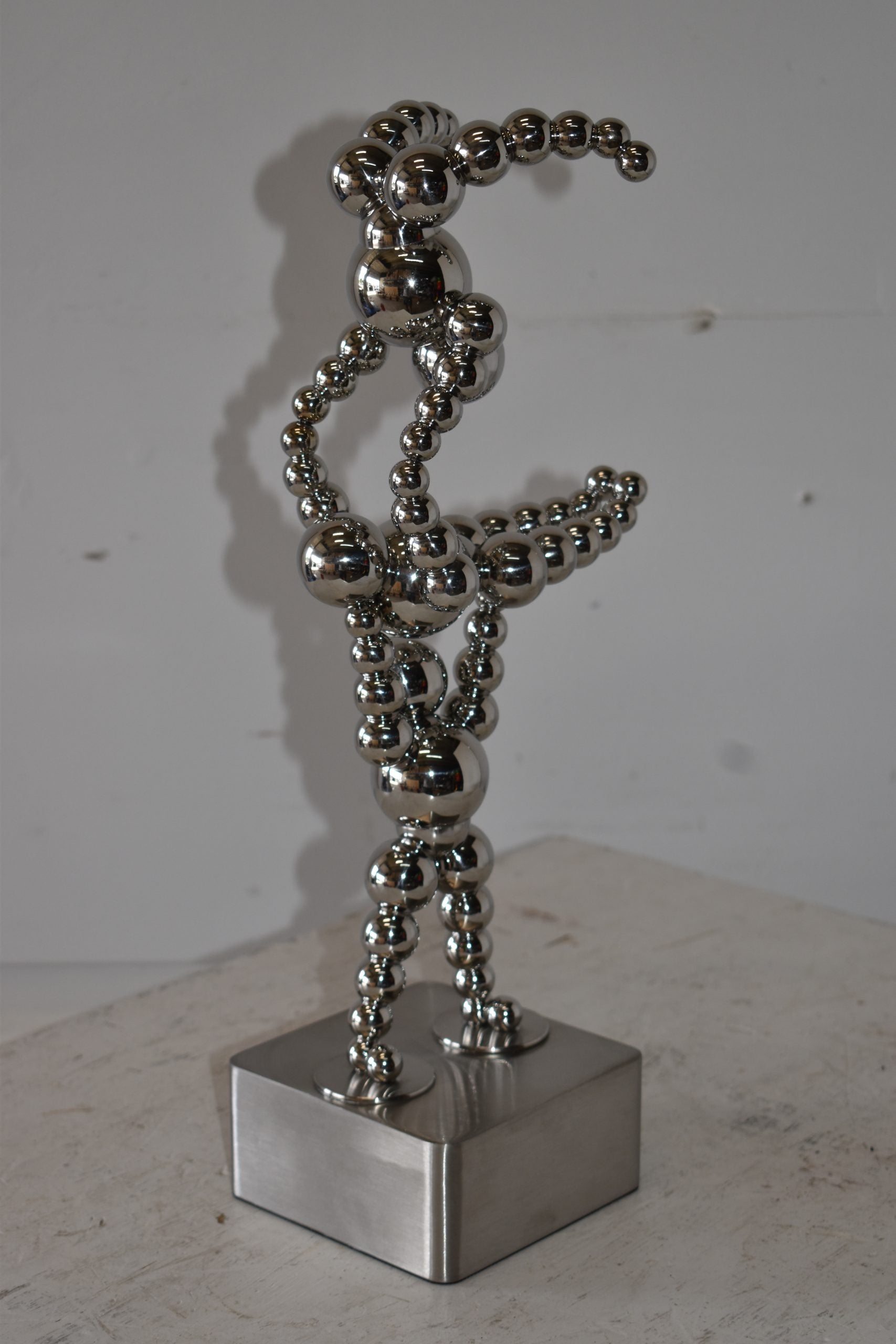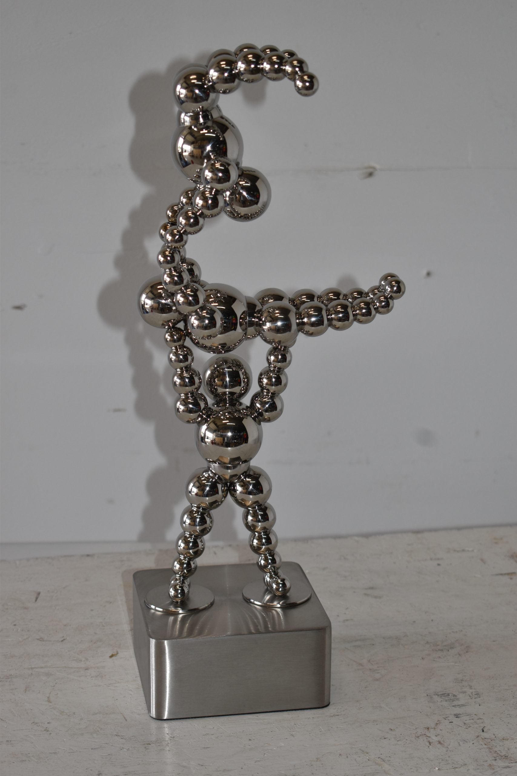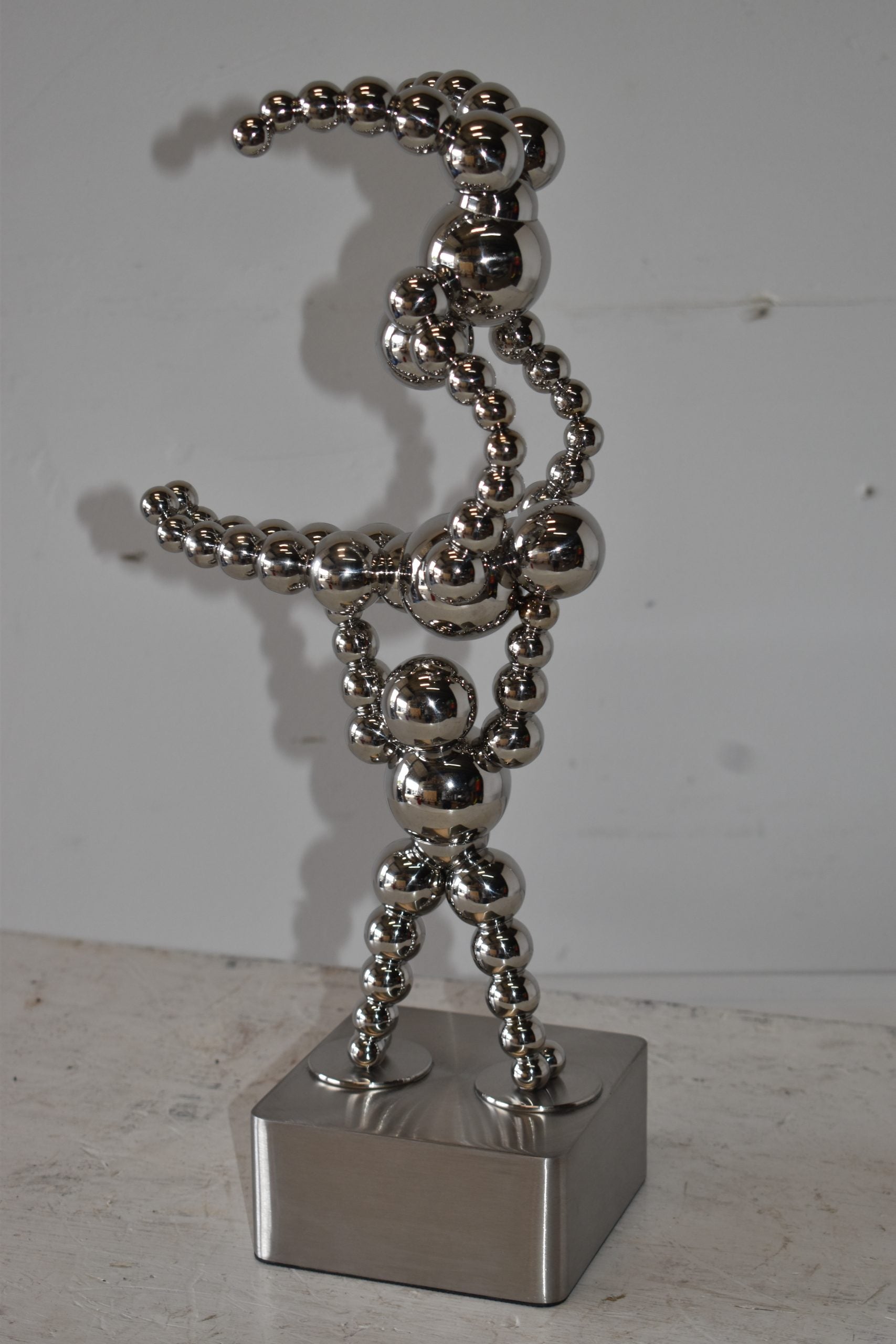 Decorate your home with this beautiful, tabletop, modern looking, stainless-steel abstract of Acrobat Couple in Action. These decorative abstracts made of Stainless-steel balls will become an extraordinary focal point to any kitchen, Livingroom, or patio! We sell a whole line of this style of modern art. You can be sure they will be a conversation starter and the topic of much appraised comments in your home. Size: 6"L x 8"W x 18"H. Weight is: 3Lb