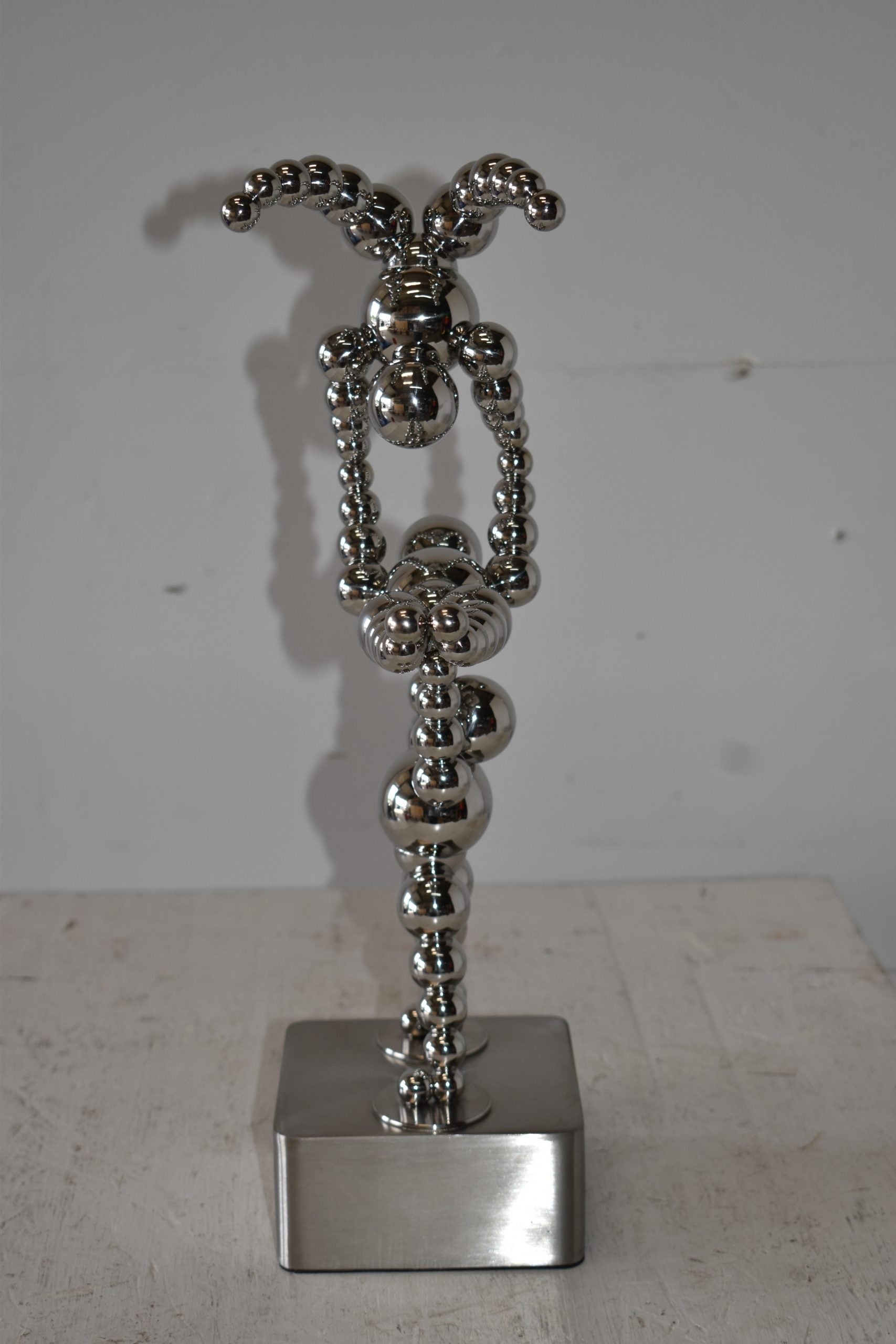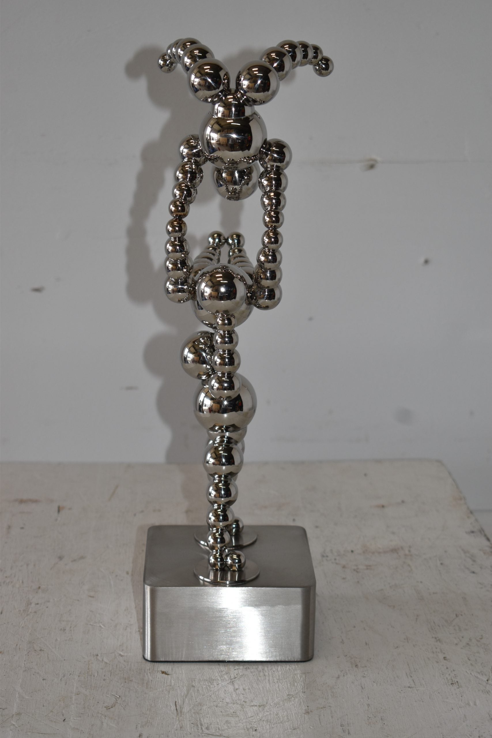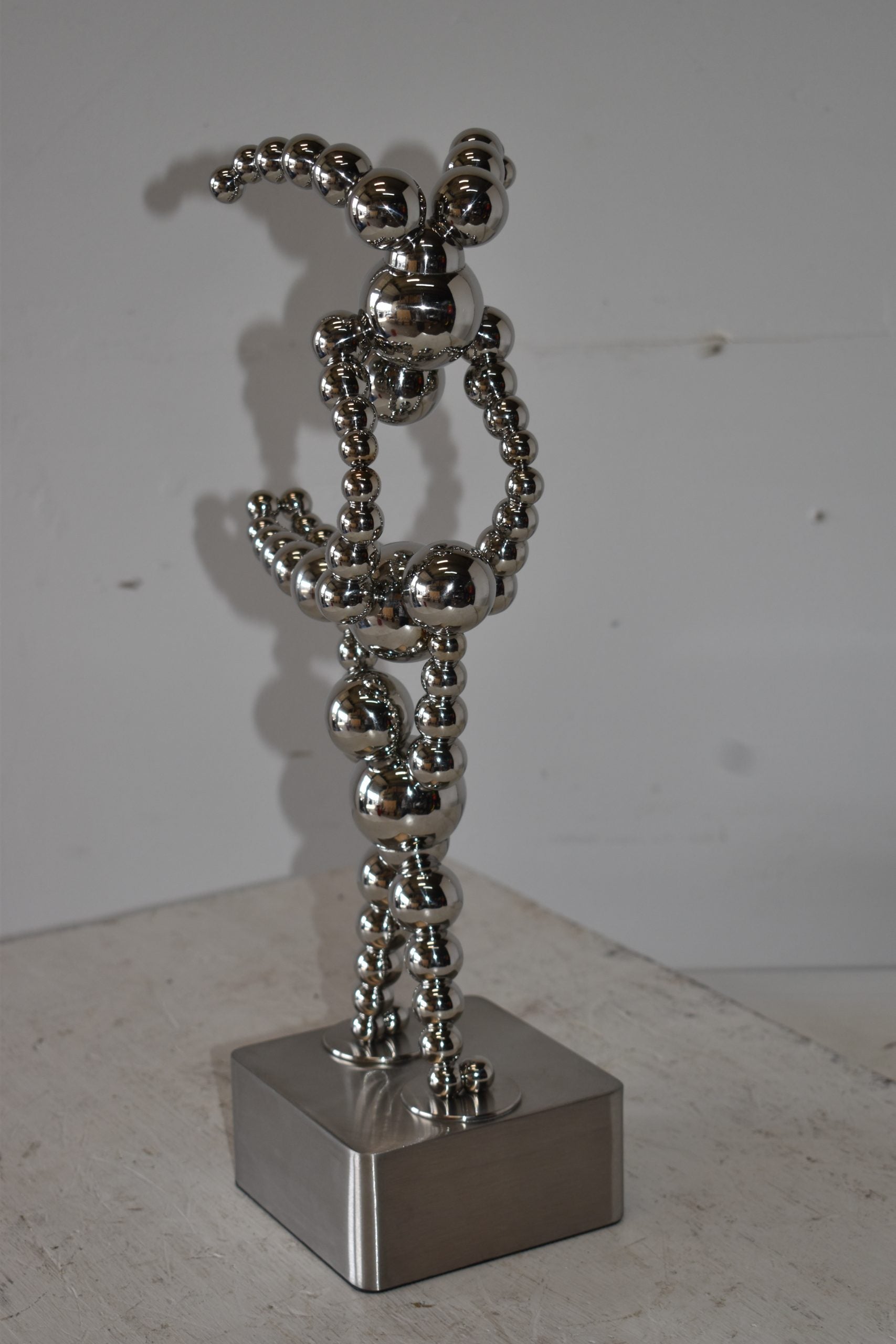 Decorate your home with this beautiful, tabletop, modern looking, stainless-steel abstract of Acrobat Couple in Action. These decorative abstracts made of Stainless-steel balls will become an extraordinary focal point to any kitchen, Livingroom, or patio! We sell a whole line of this style of modern art. You can be sure they will be a conversation starter and the topic of much appraised comments in your home. Size: 6"L x 8"W x 18"H. Weight is: 3Lb