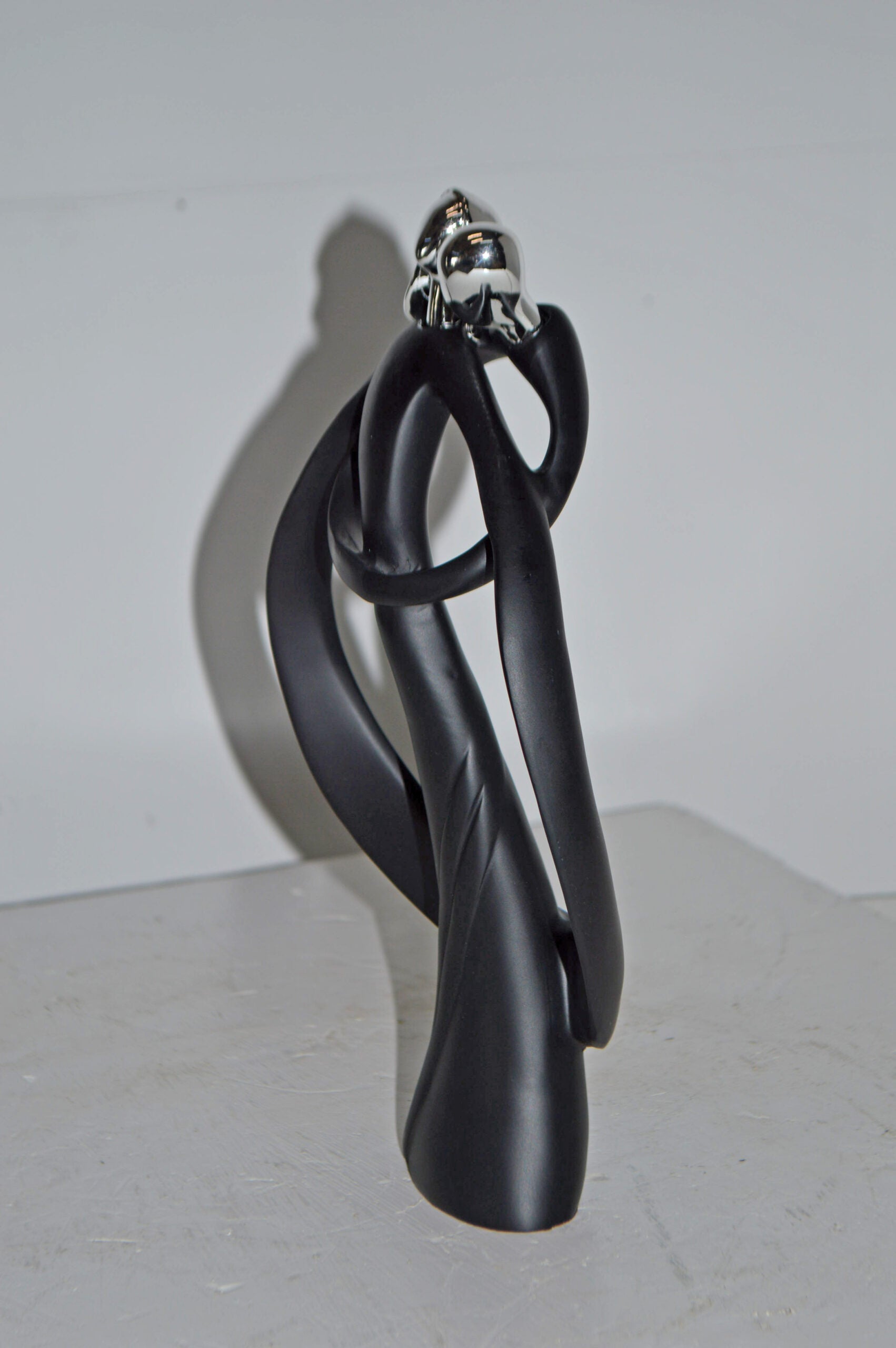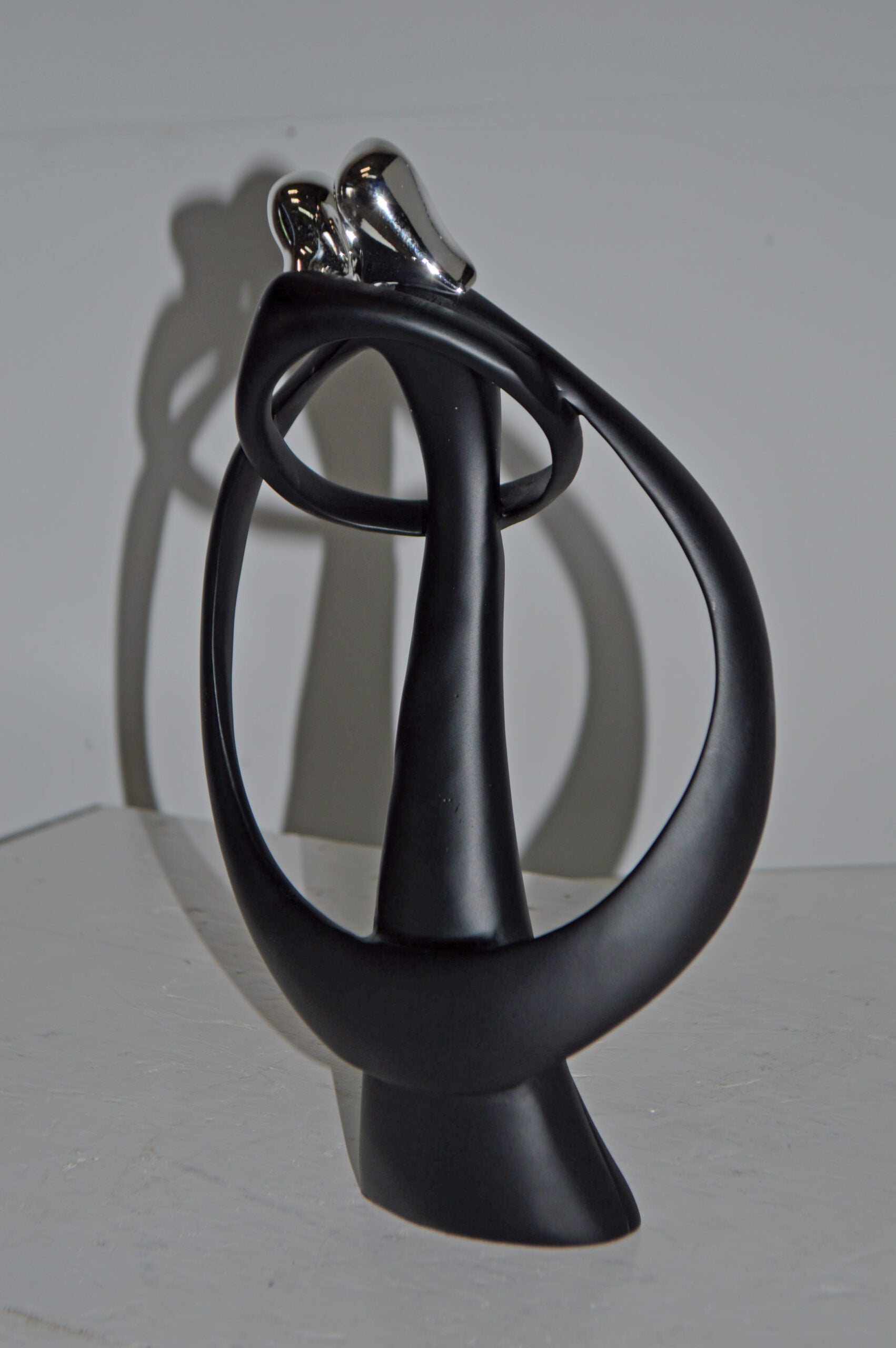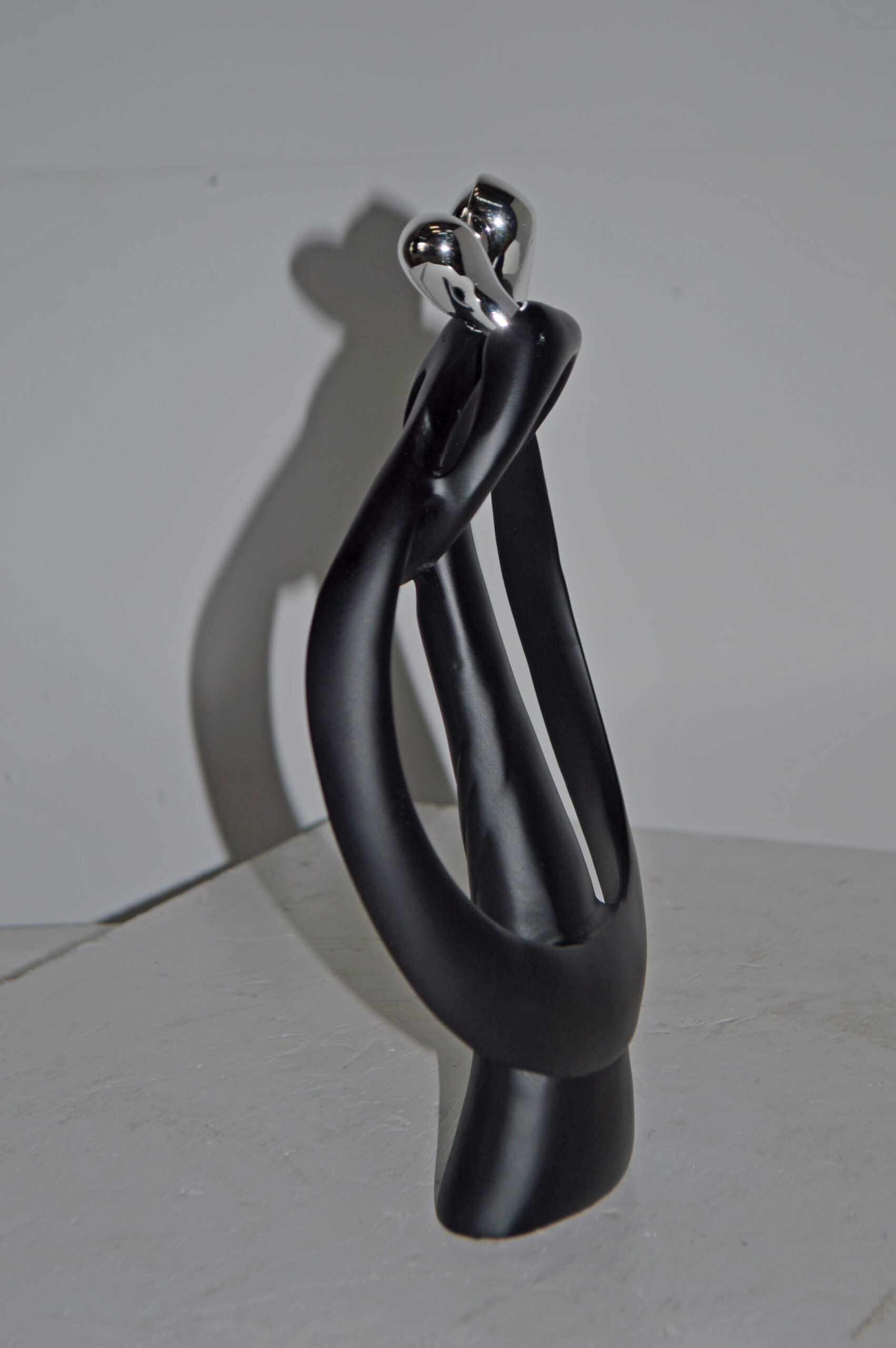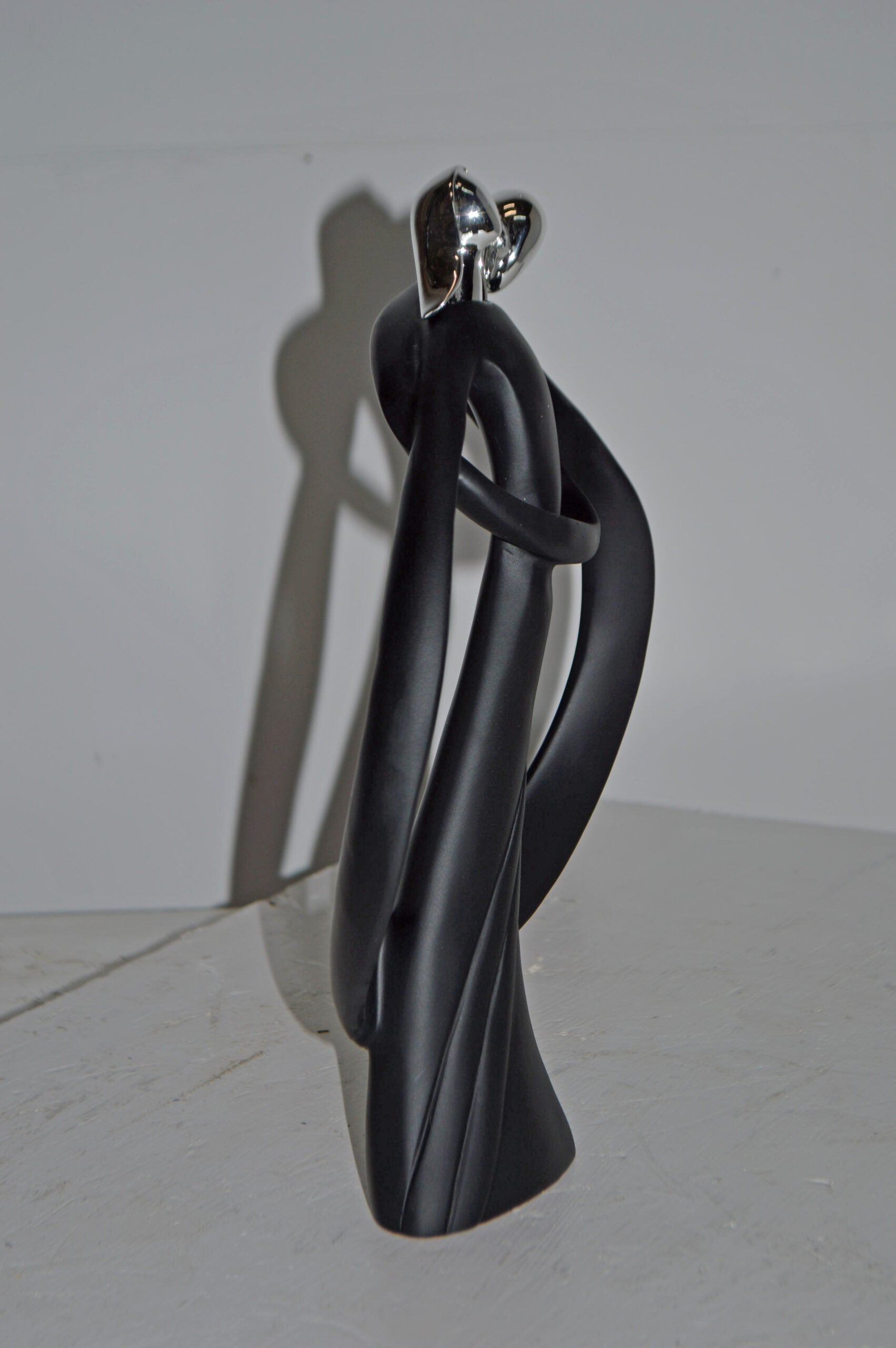 The beautiful modern art resin statue of a young couple hugging, colored black with shiny chrome heads. This impressive resin Statue will be a permanent fixture at your home for years to come. This statue comes in color red and black – customer often buy both as a set Size: 8"L x 2"W x 12"H. Weight is: 2Lb