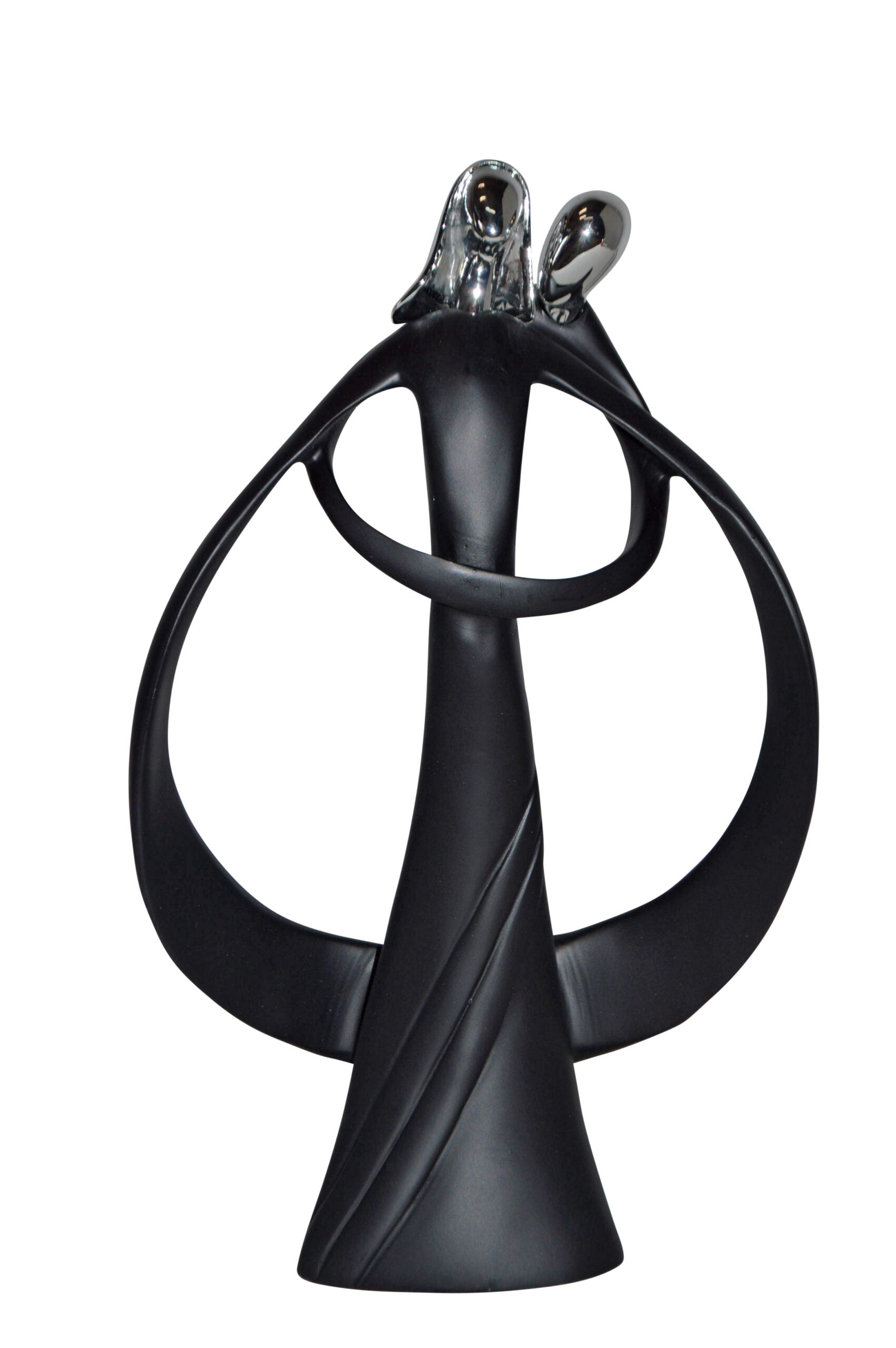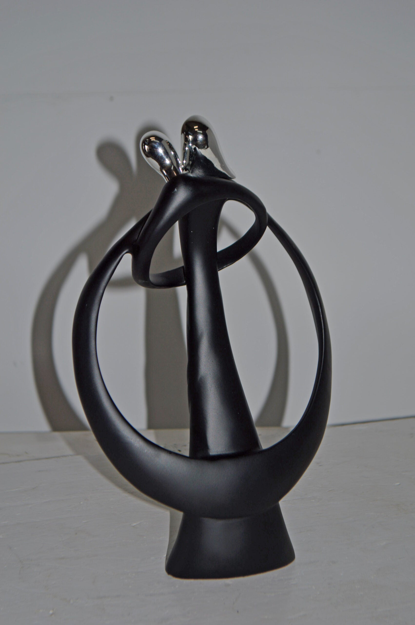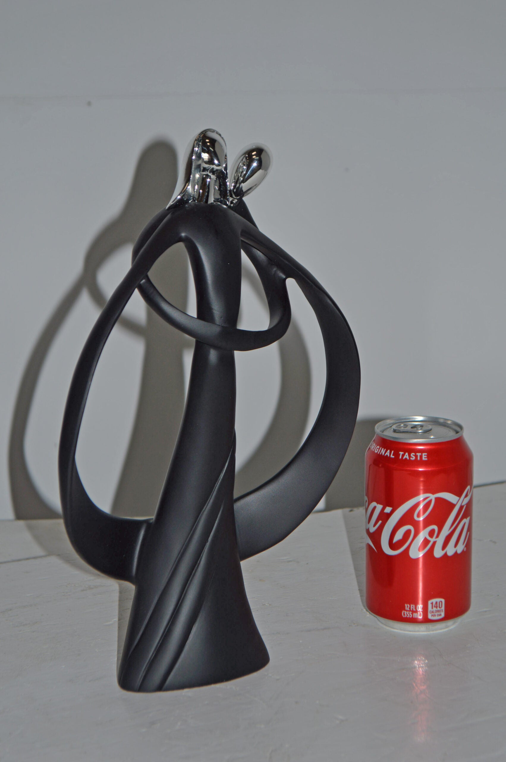 The beautiful modern art resin statue of a young couple hugging, colored black with shiny chrome heads. This impressive resin Statue will be a permanent fixture at your home for years to come. This statue comes in color red and black – customer often buy both as a set Size: 8"L x 2"W x 12"H. Weight is: 2Lb